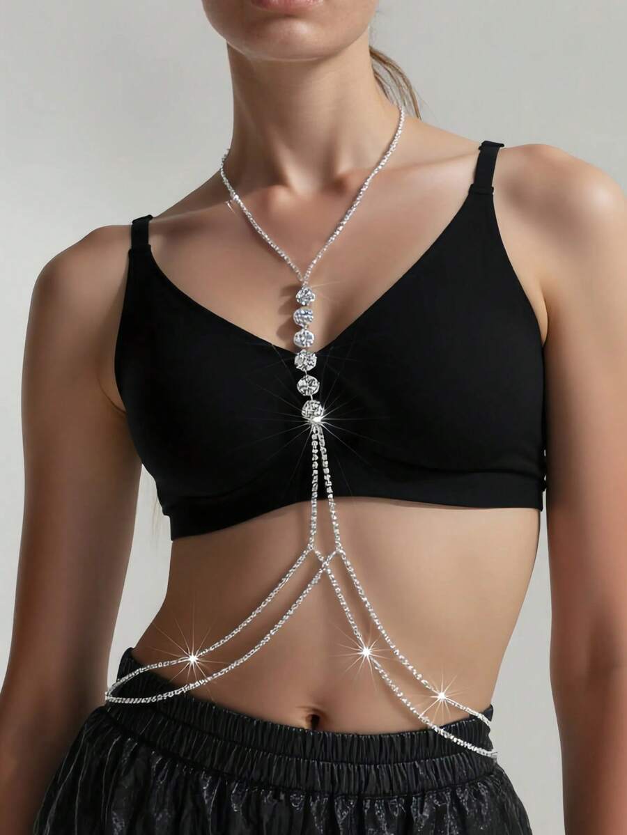 1 pieza cadena de pecho redonda brillante y sexy con rhinestones, accesorio de moda para mujeres, adecuado para la playa y la discoteca