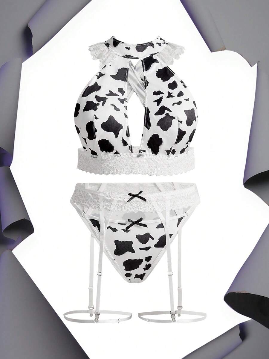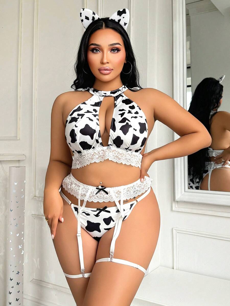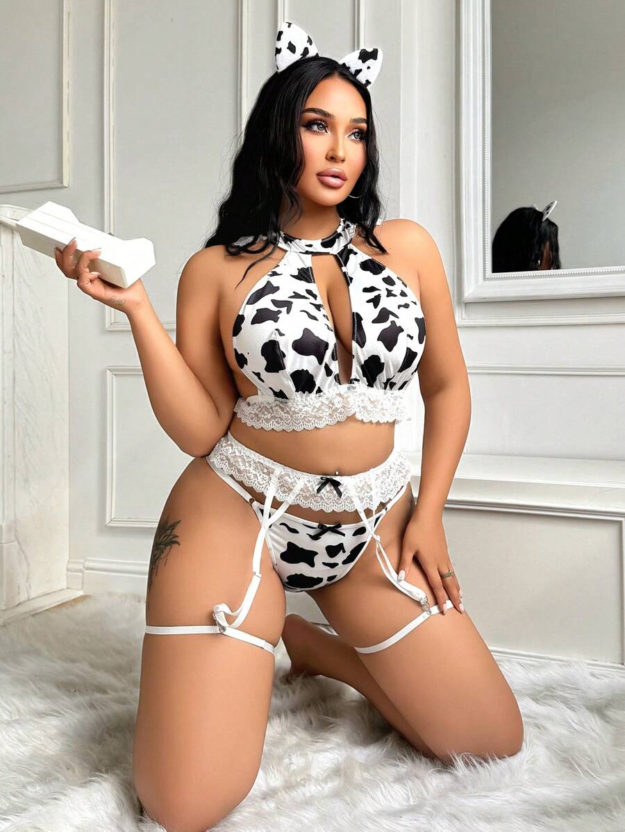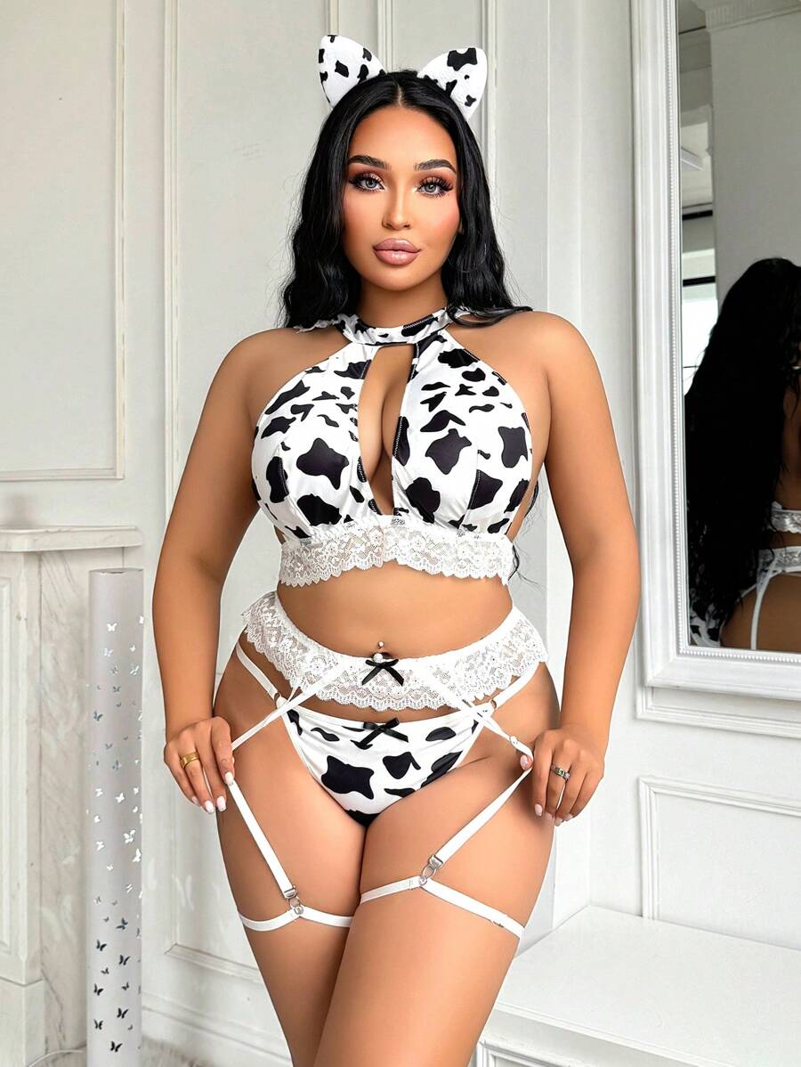 Fantasy costume conjunto de lenceria sexy talla grande que incluye sosten con estampado de vaca + diadema + tanga + liguero