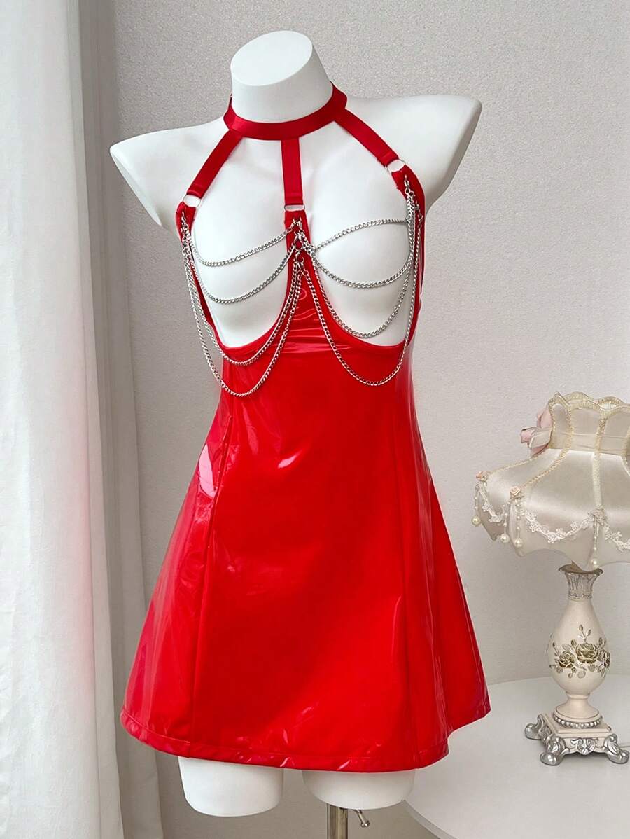 Lenceria de talla grande con espalda descubierta, hueca y con cadena metalica, camison de pu con efecto espejo para rave