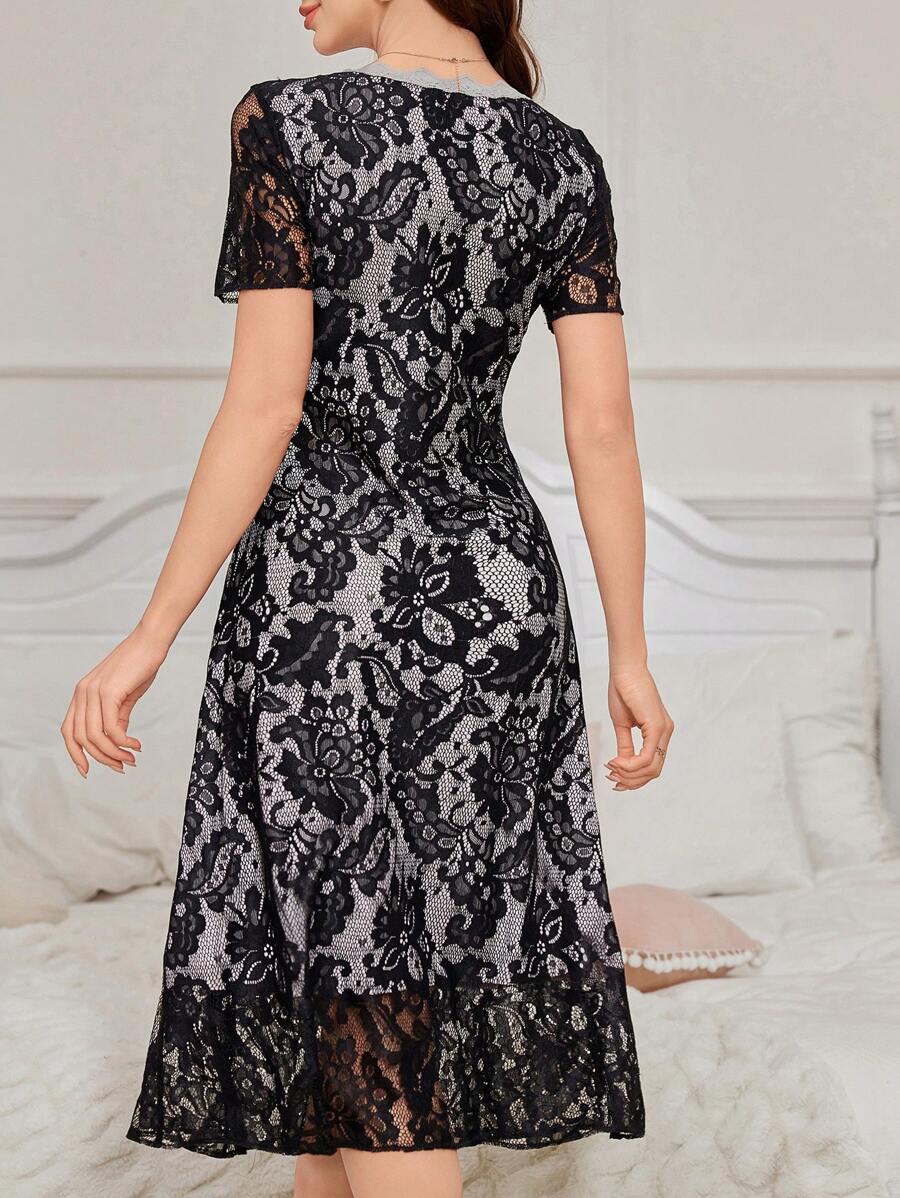 Camison de manga corta con cuello en v, cintura entallada y forro de encaje de color contrastante