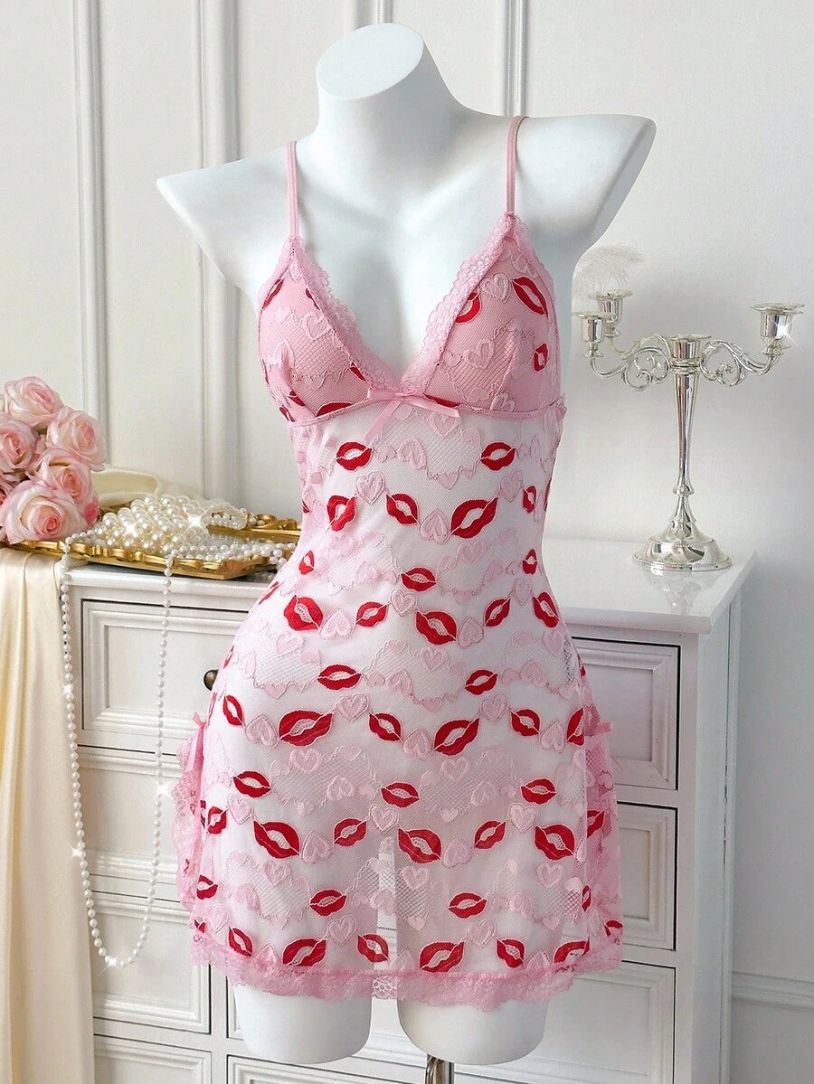 Camison corto mini ajustado semitransparente de encaje con labios rojos sexys para mujer