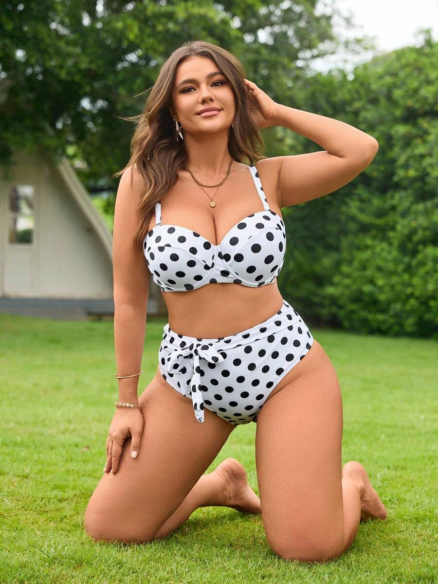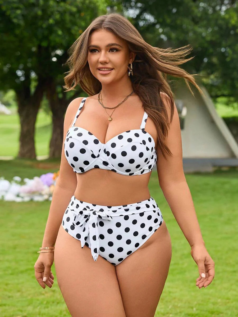 Conjunto de bikini de 2 piezas para mujer de talla grande con estampado de lunares aleatorios, de uso diario y vacacional, minimalista y sexy, con bottom triangular de talle alto y brasier con aros