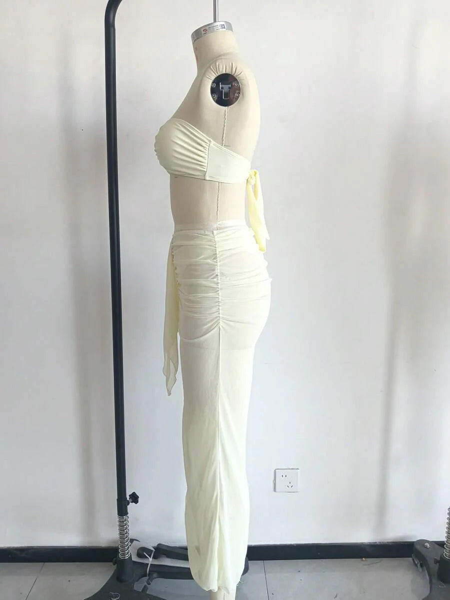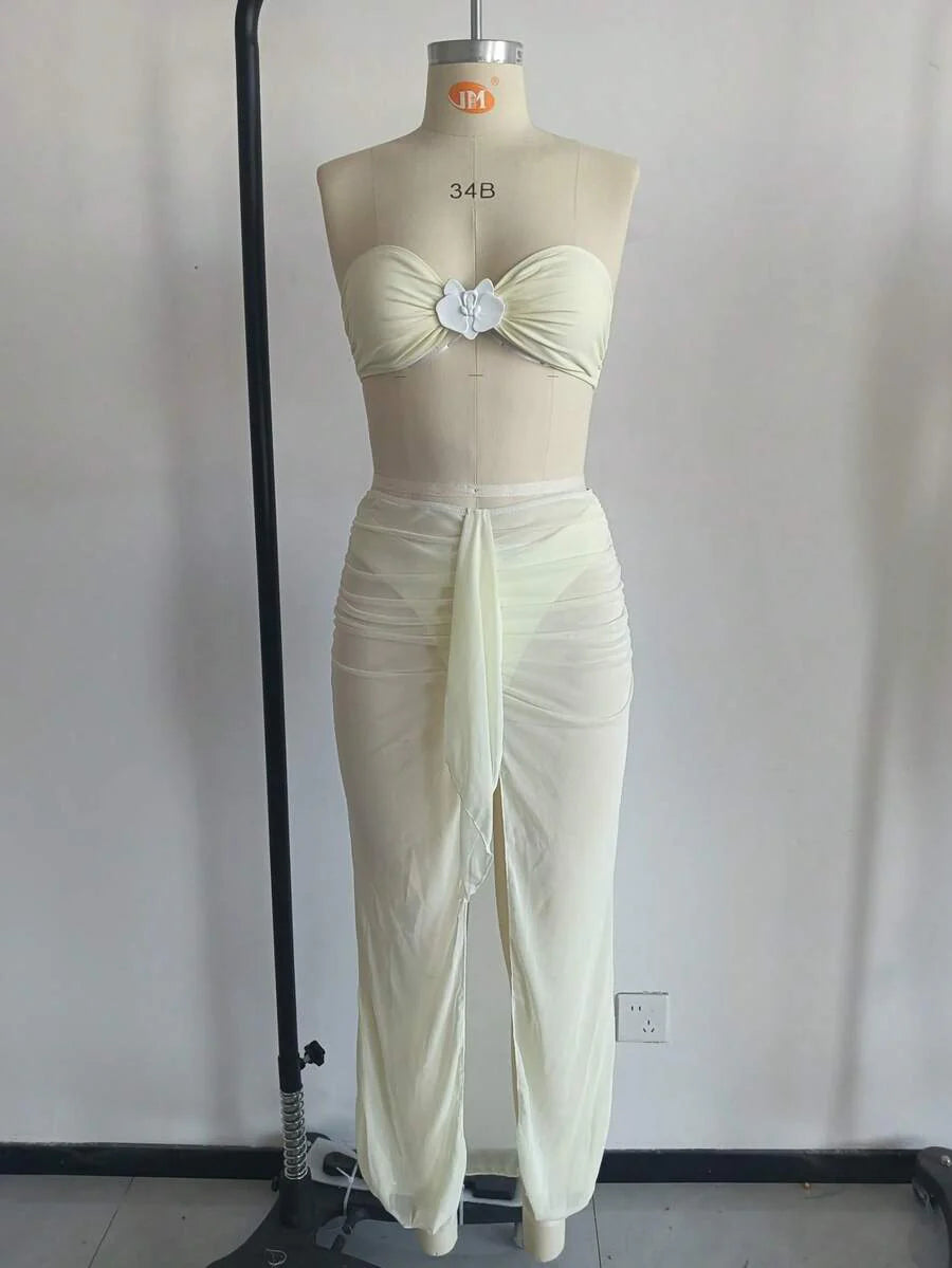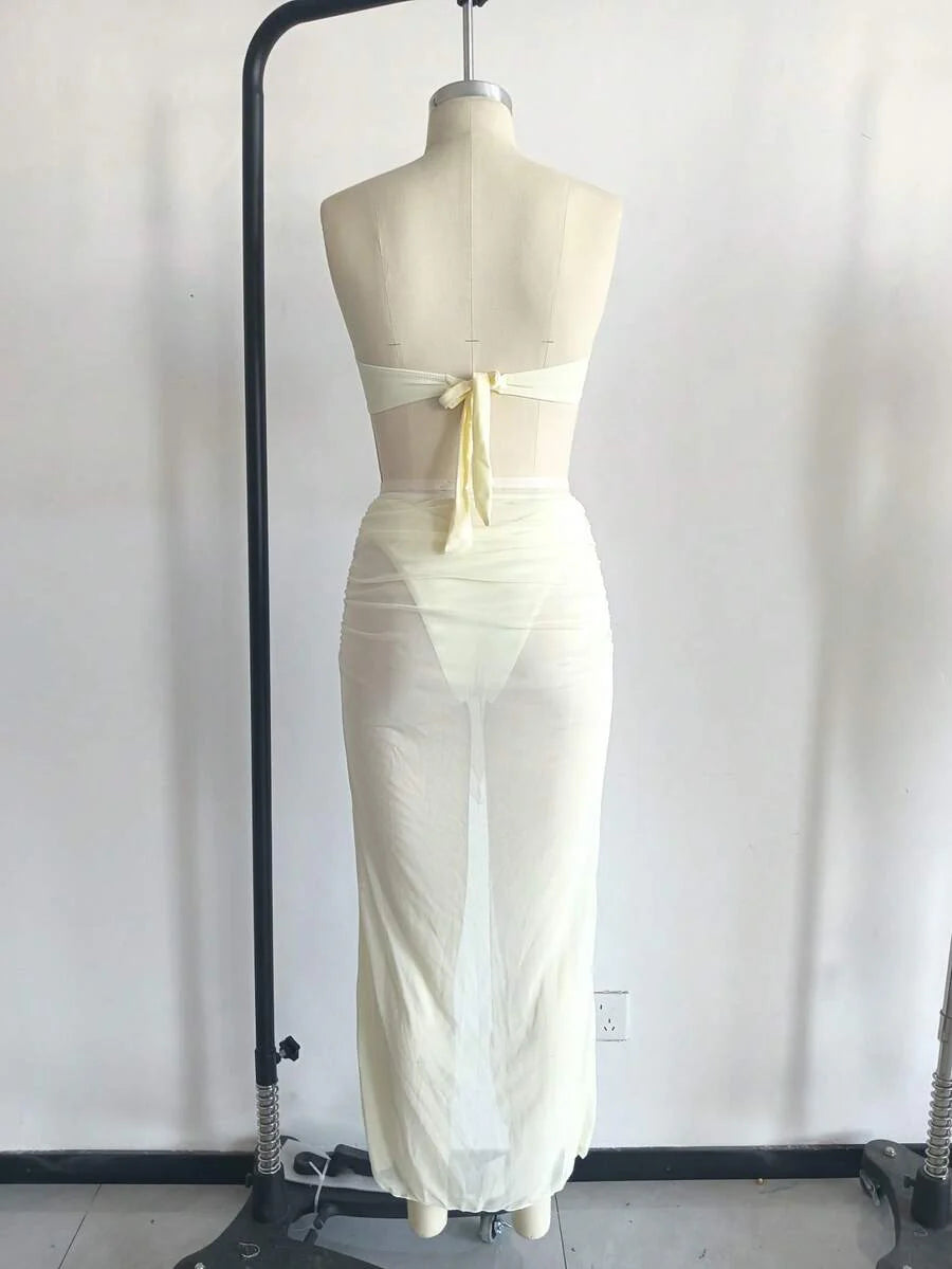 Conjunto de 2 piezas de traje de bano tipo brasier sin tirantes color amarillo crema y falda larga con abertura de cintura alta estilo vacacional de gasa, estilizador