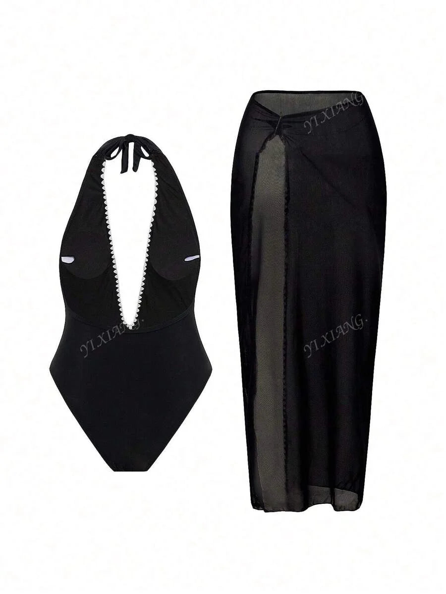 2 piezas conjunto de playa para mujer 2025, traje de bano con escote en v hueco y adorno de flores y estrellas de mar, emparejado con una falda maxi transparente y sexy de estilo casual