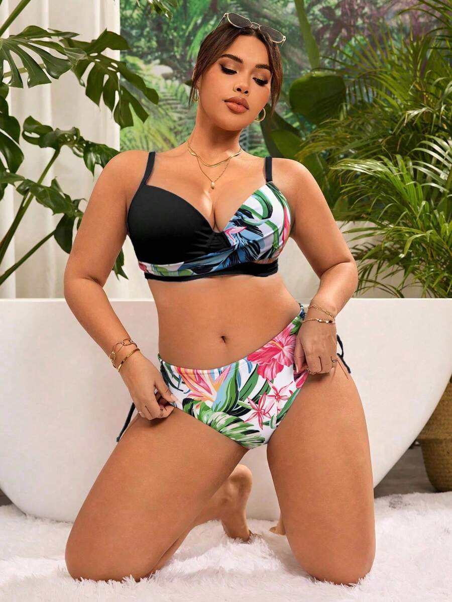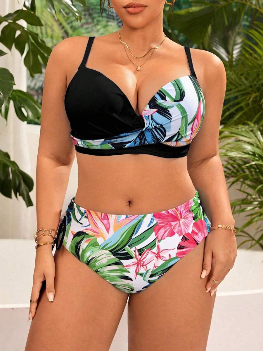 Curve conjunto de bikini de 2 piezas con estampado floral y talle alto para mujer de talla grande, con aros y relleno extraible, traje de bano de verano