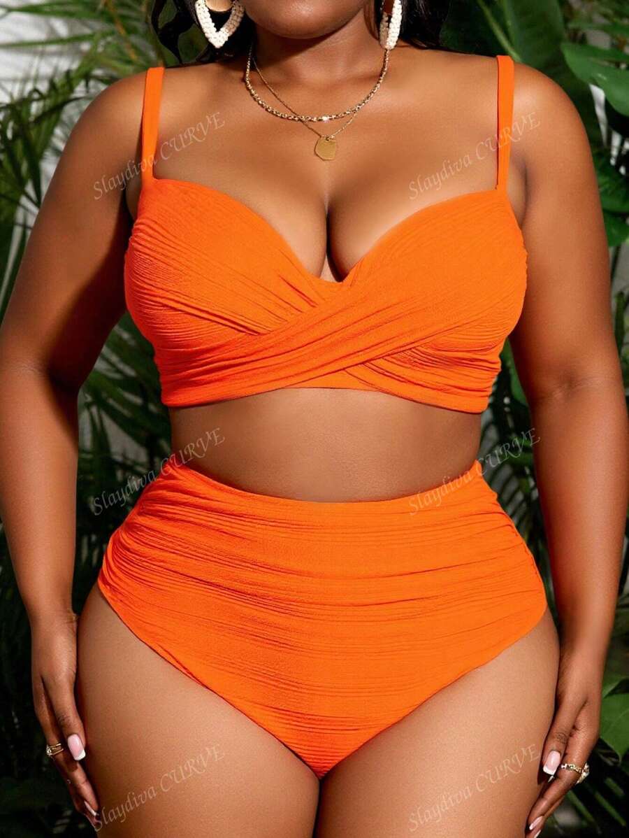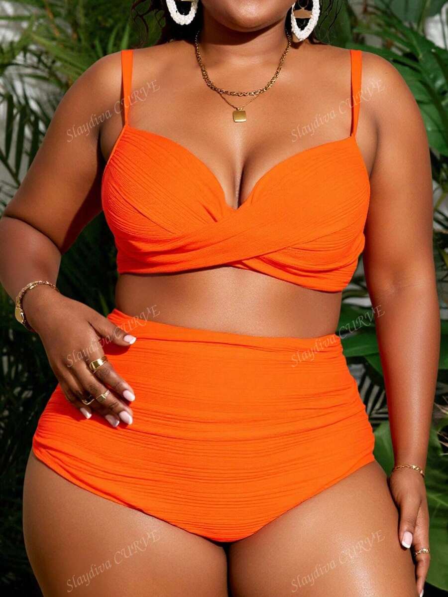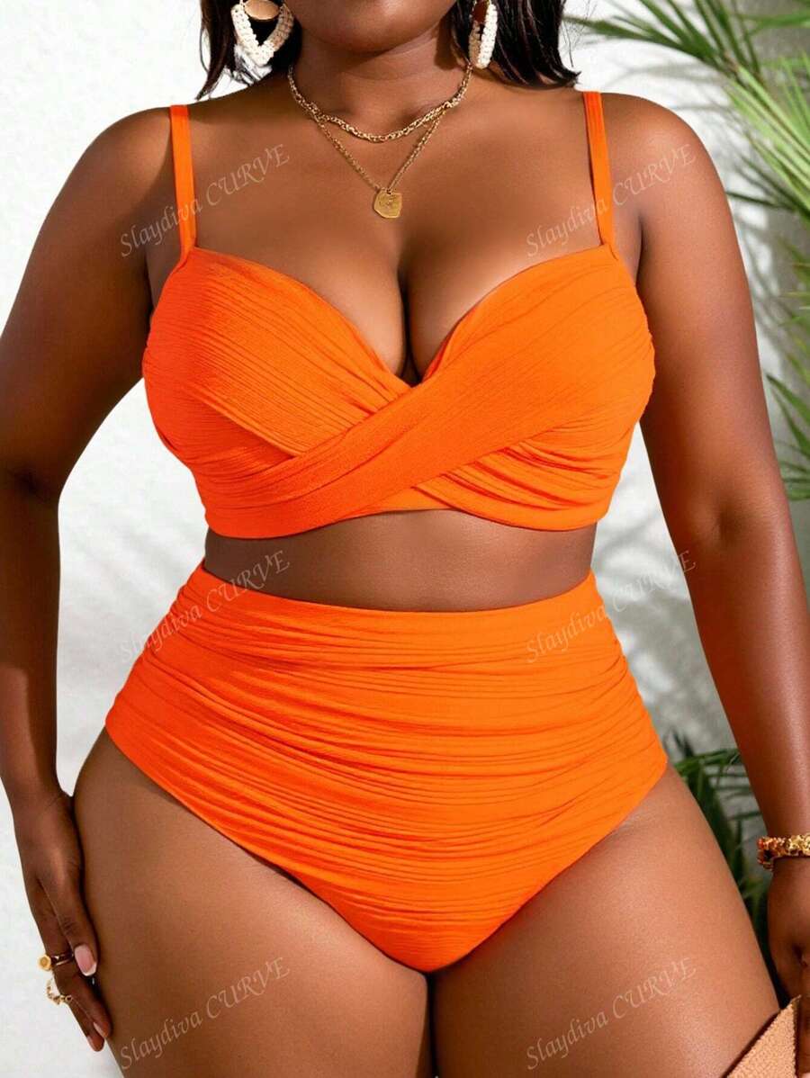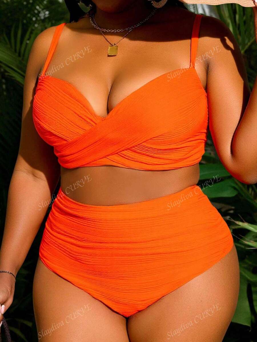 2 piezas traje de bano con recogido de unicolor para mujer de talla grande, conjunto de bikini de estilo minimalista a la moda para vacaciones