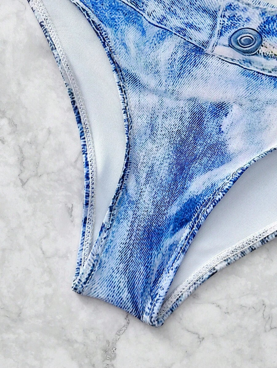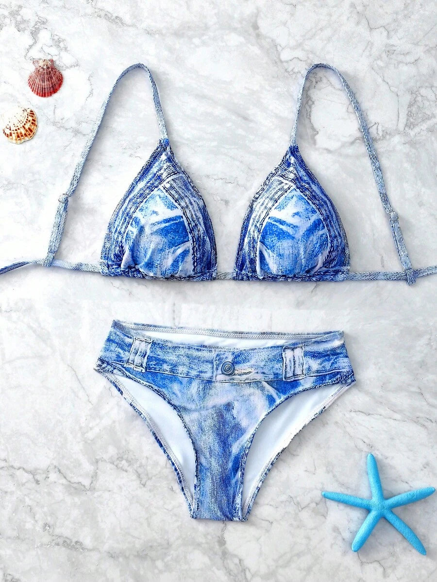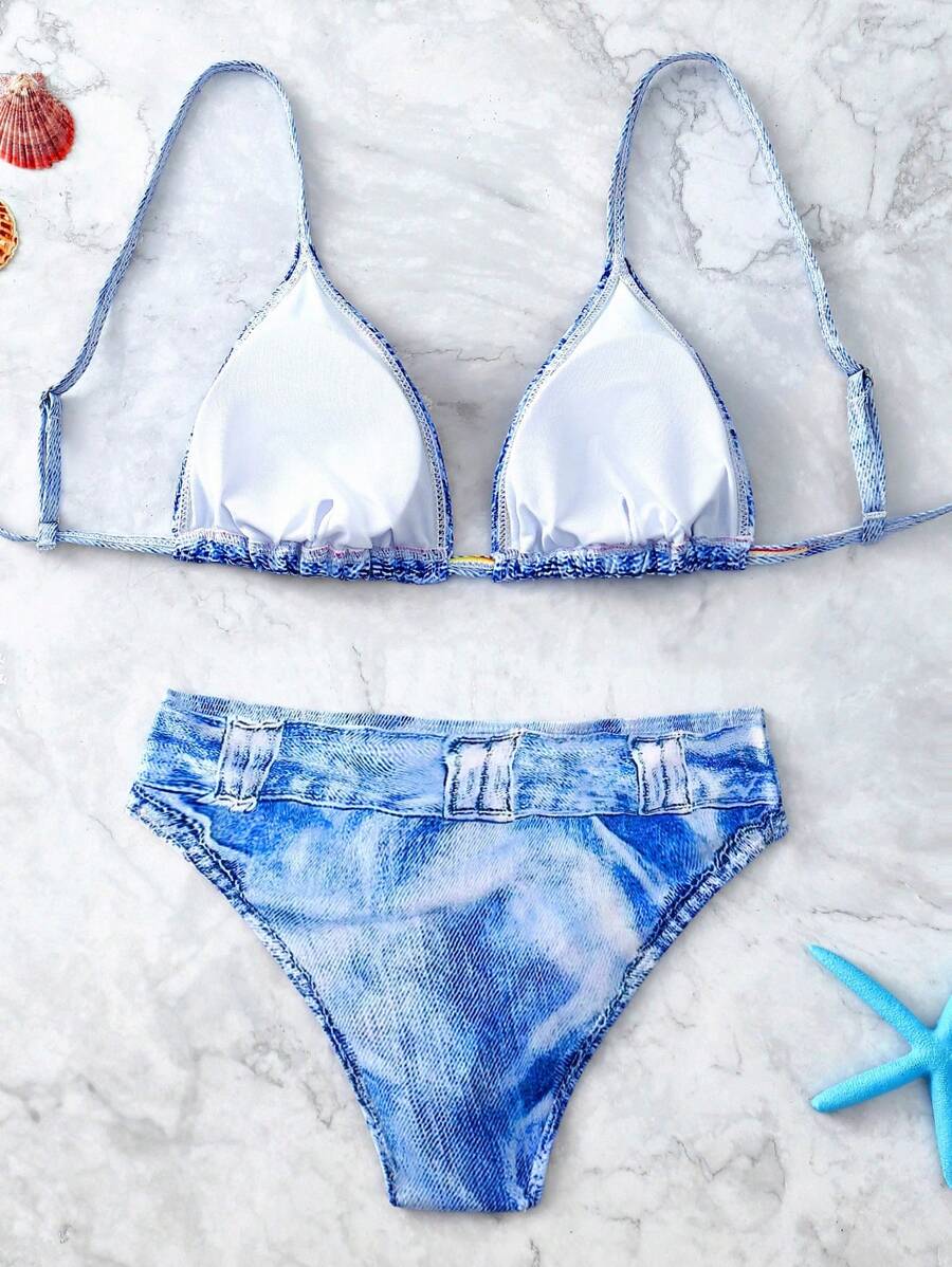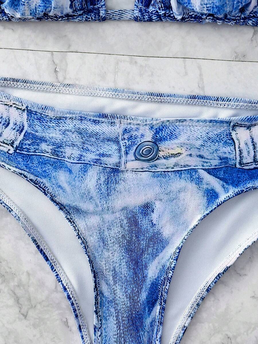 Curve conjunto de traje de bano de 2 piezas de talla grande, bikini con estampado de mezclilla, estilo vacacional