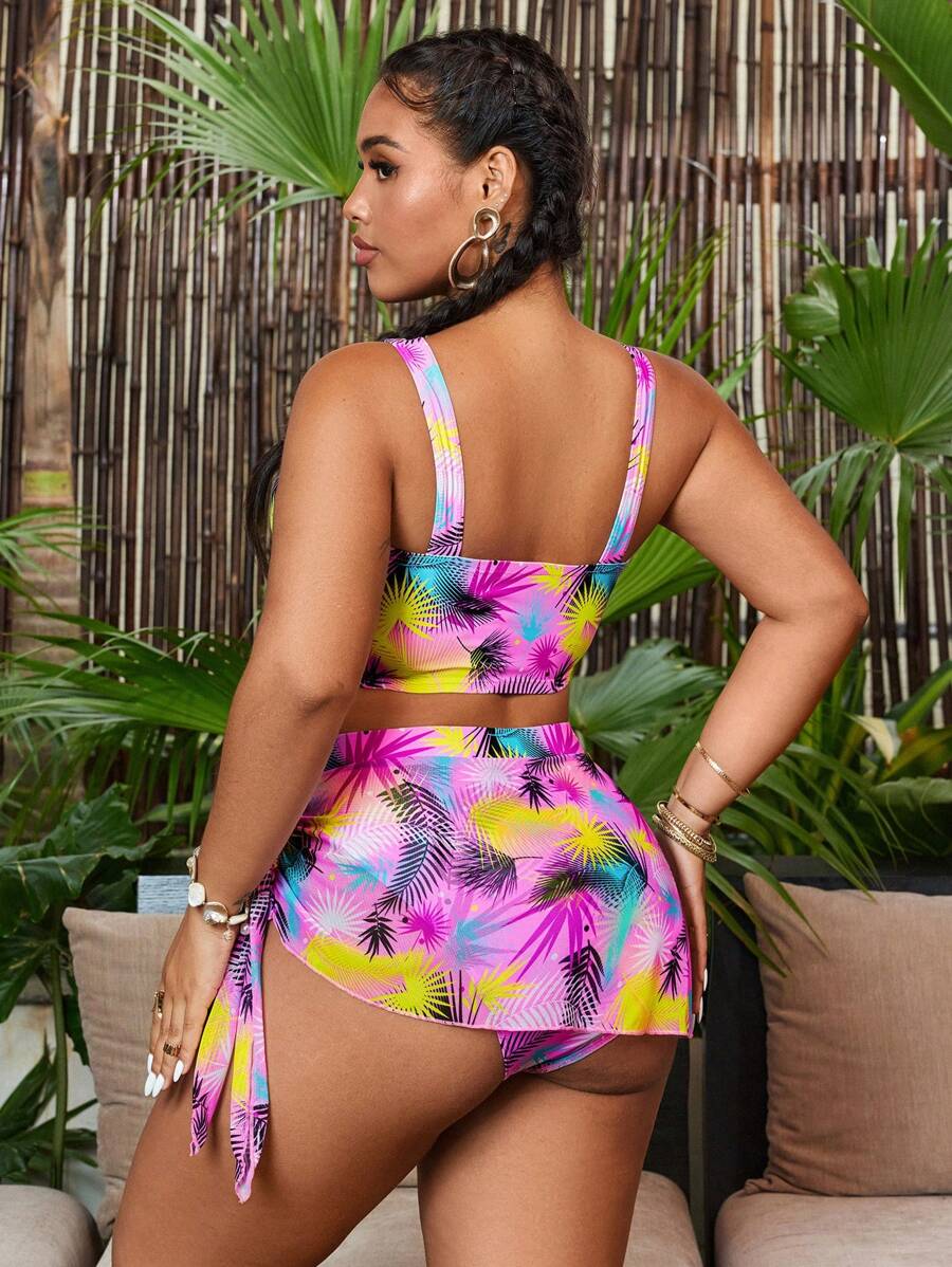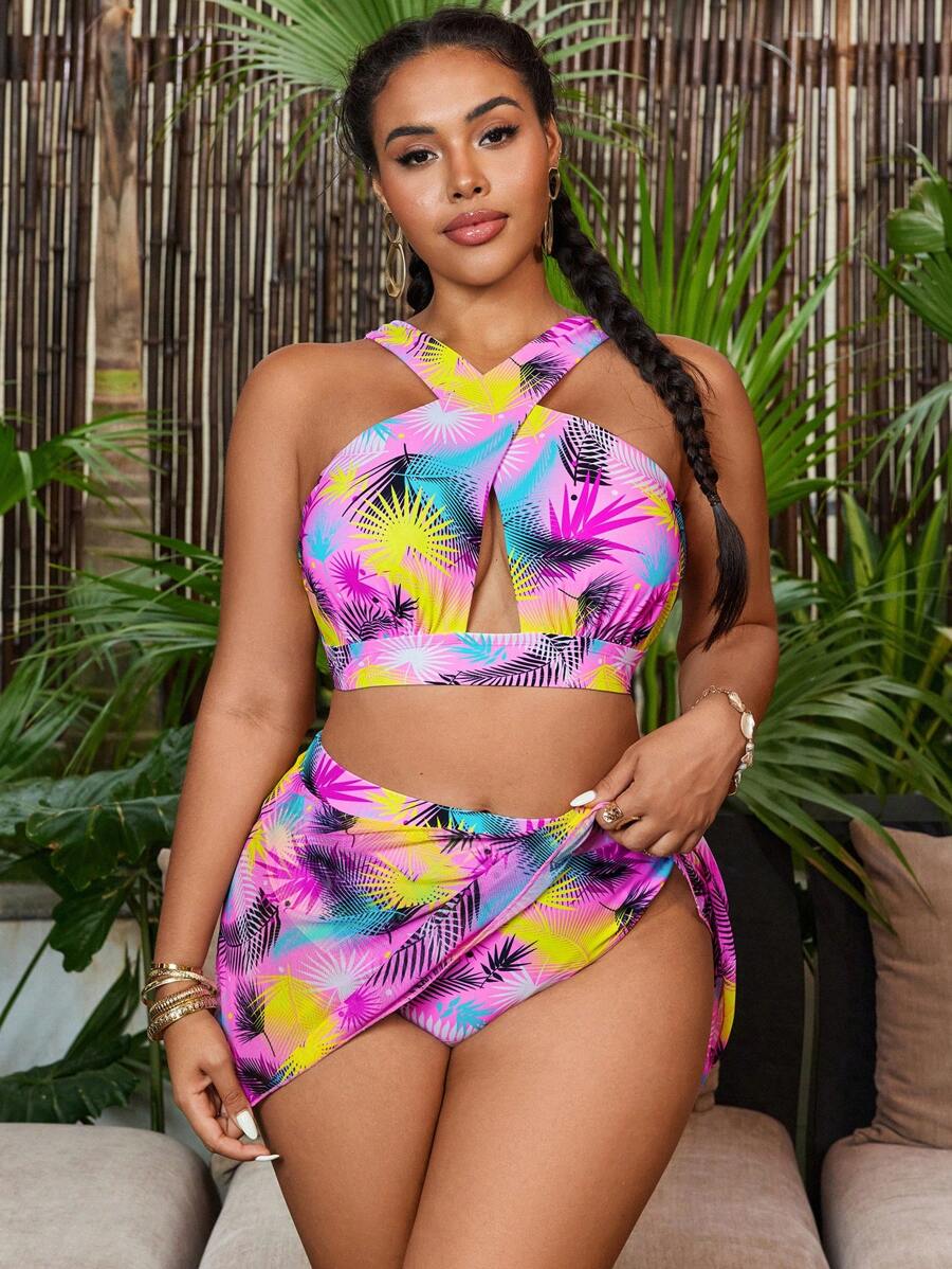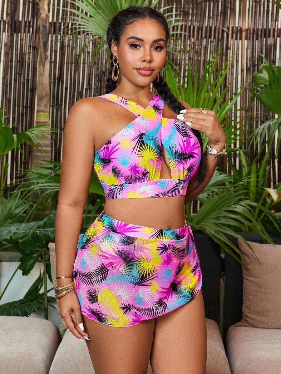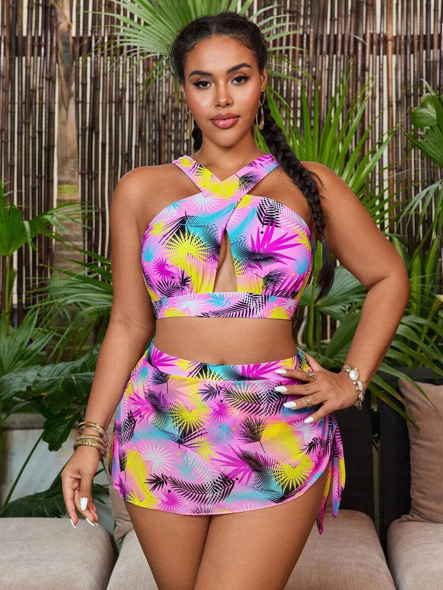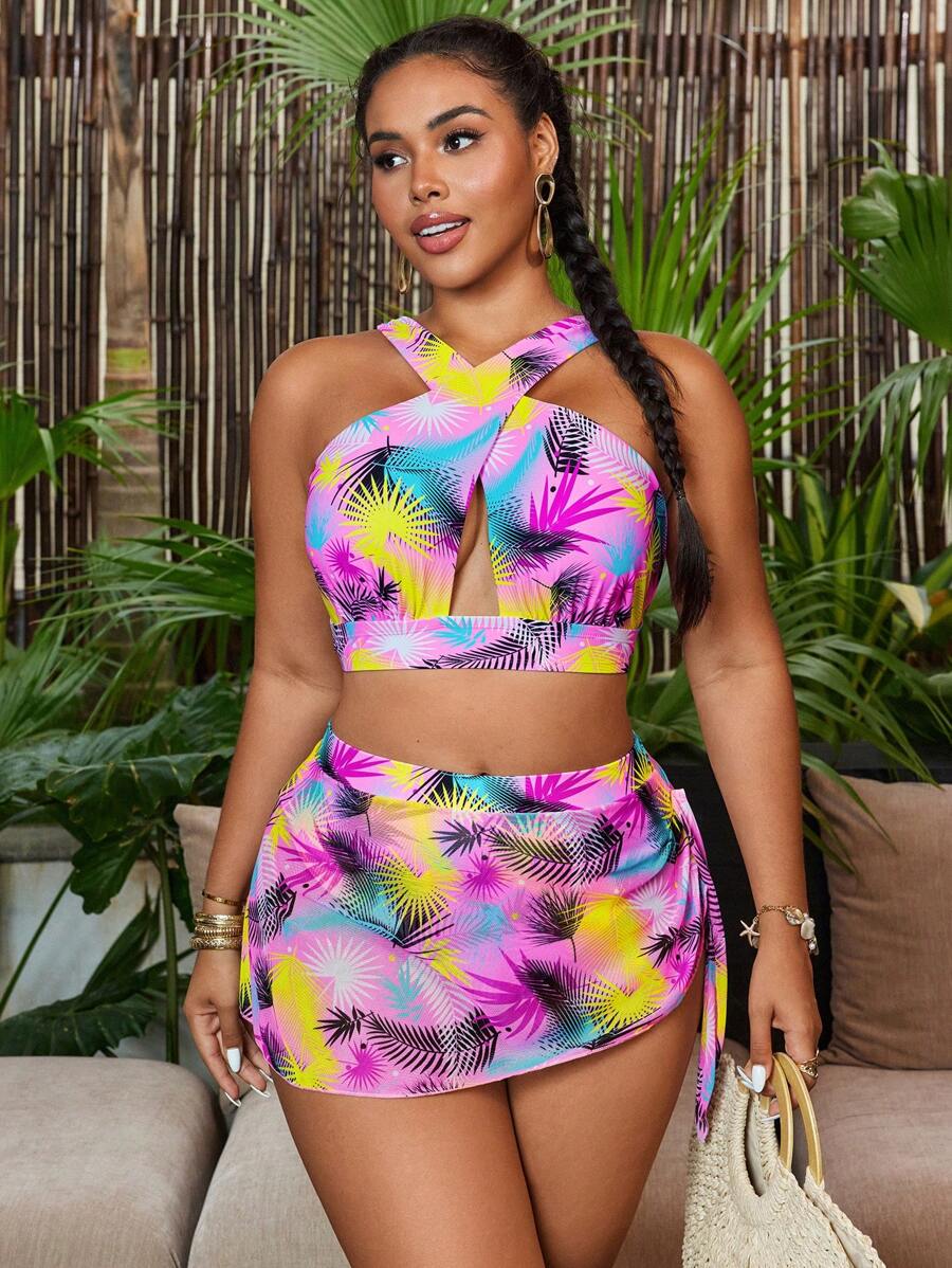 Curve conjunto de 2 piezas de talla grande para mujer, top con estampado de tiras gruesas cruzadas y falda corta de malla