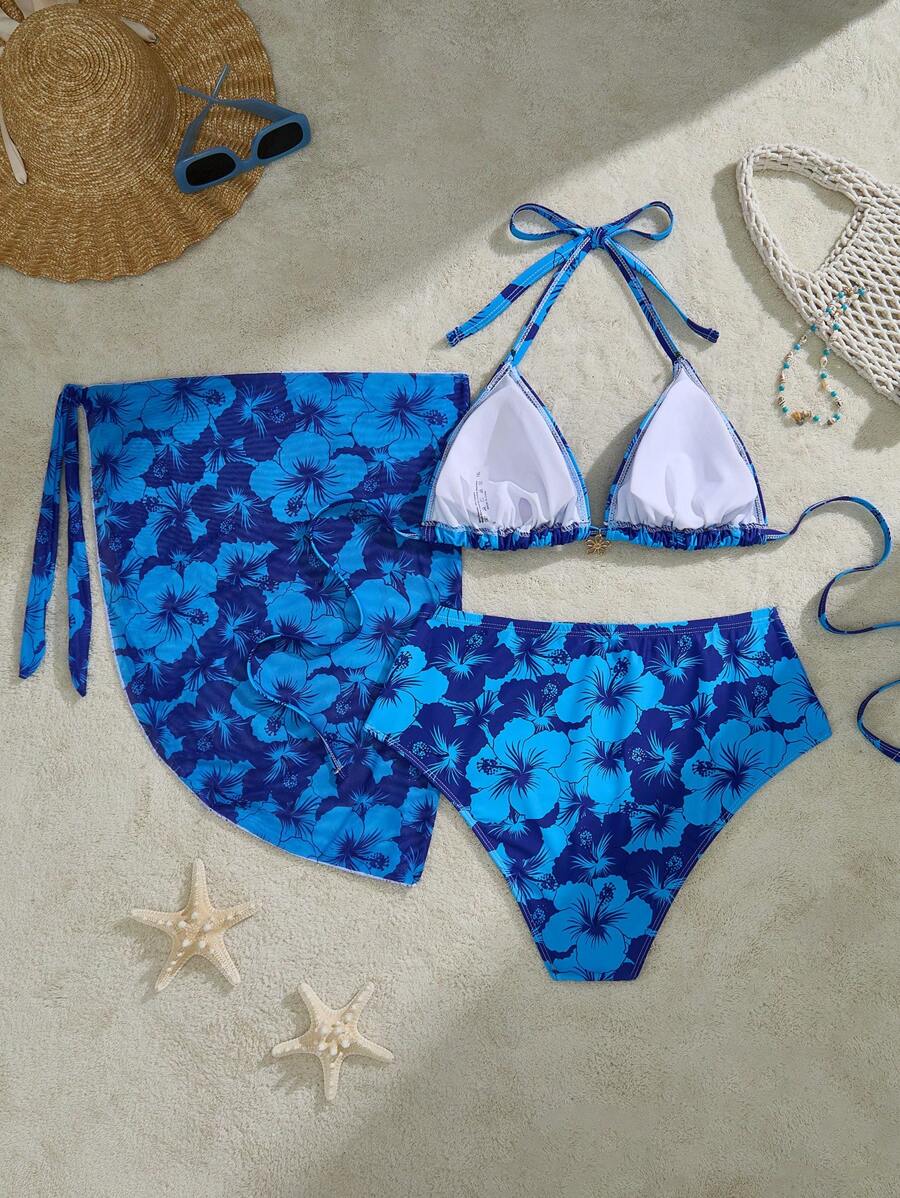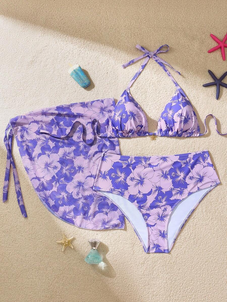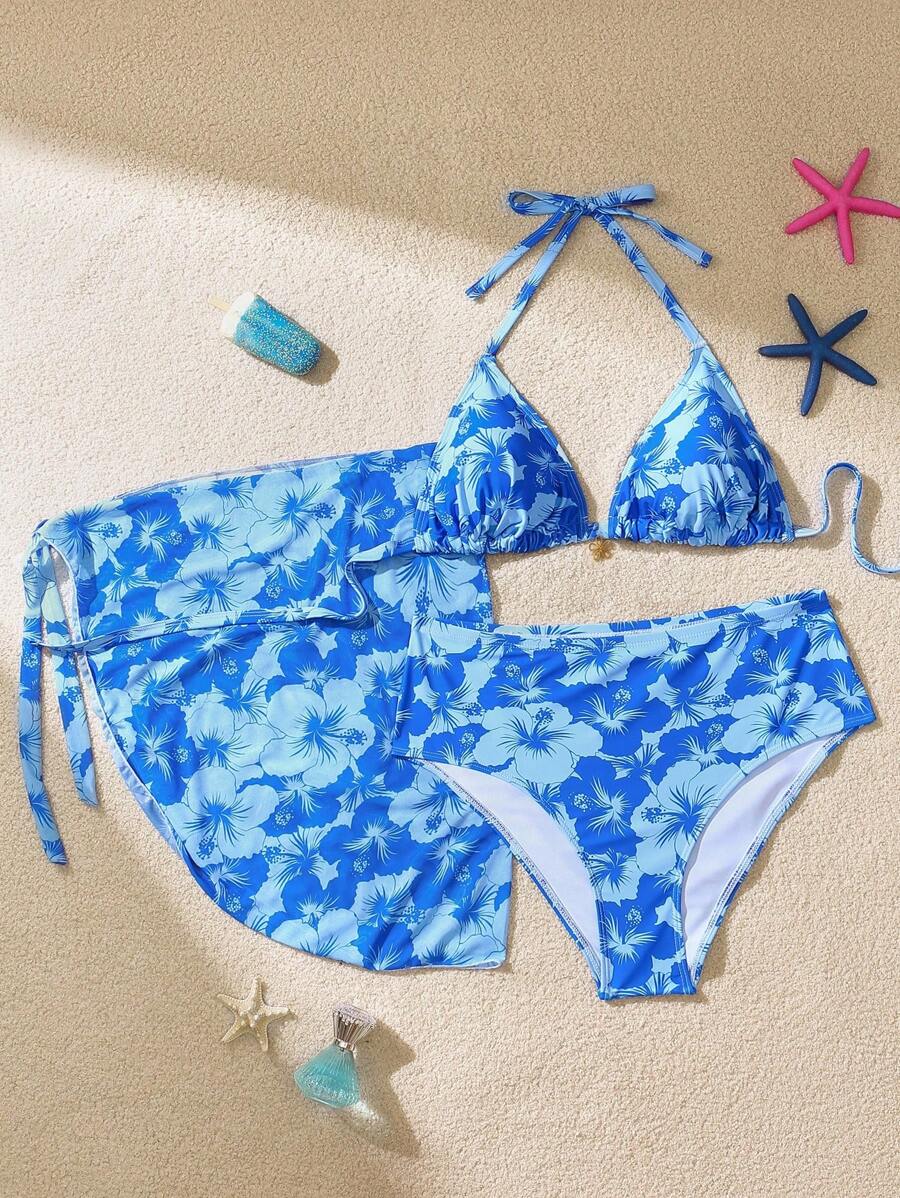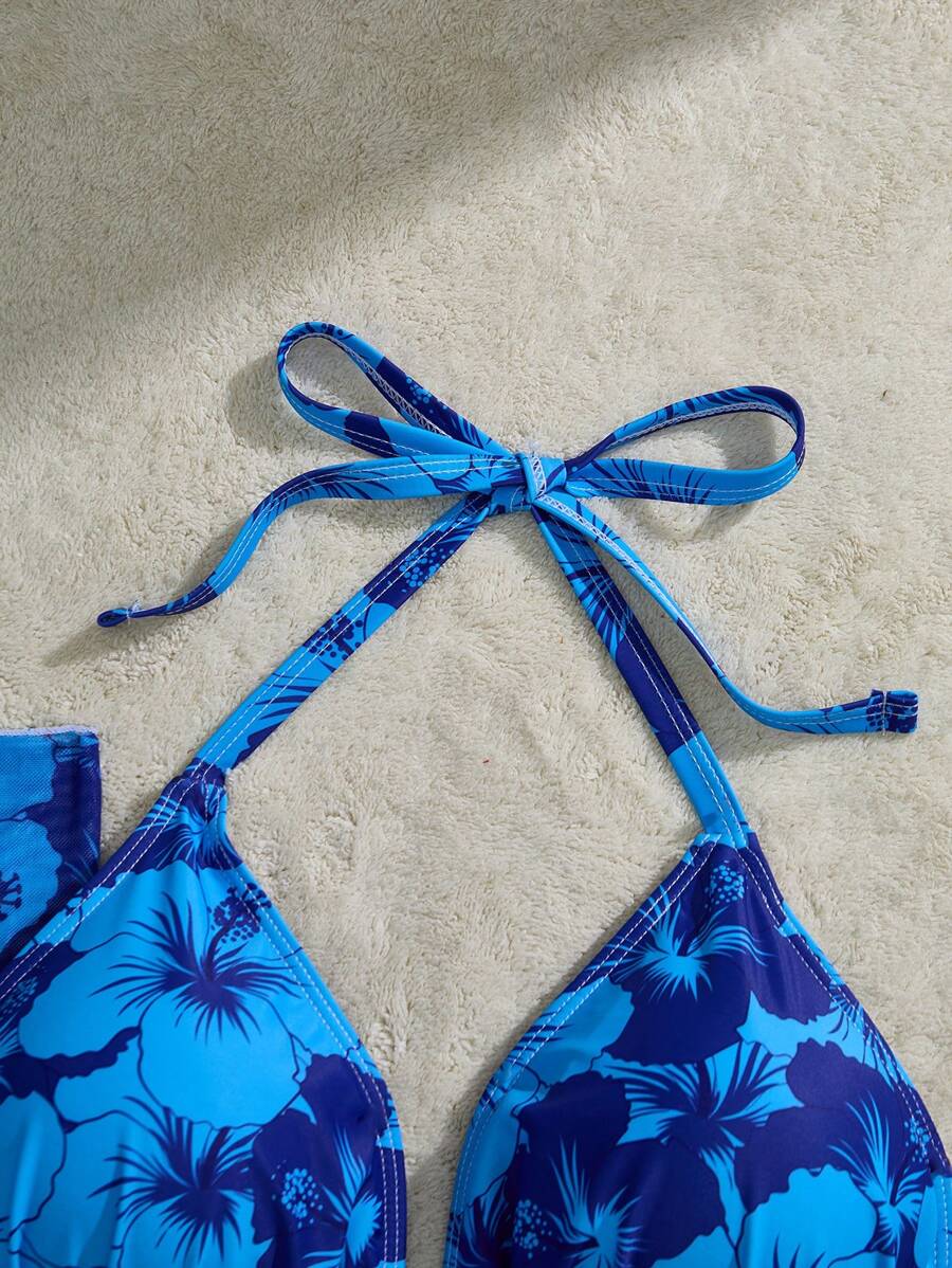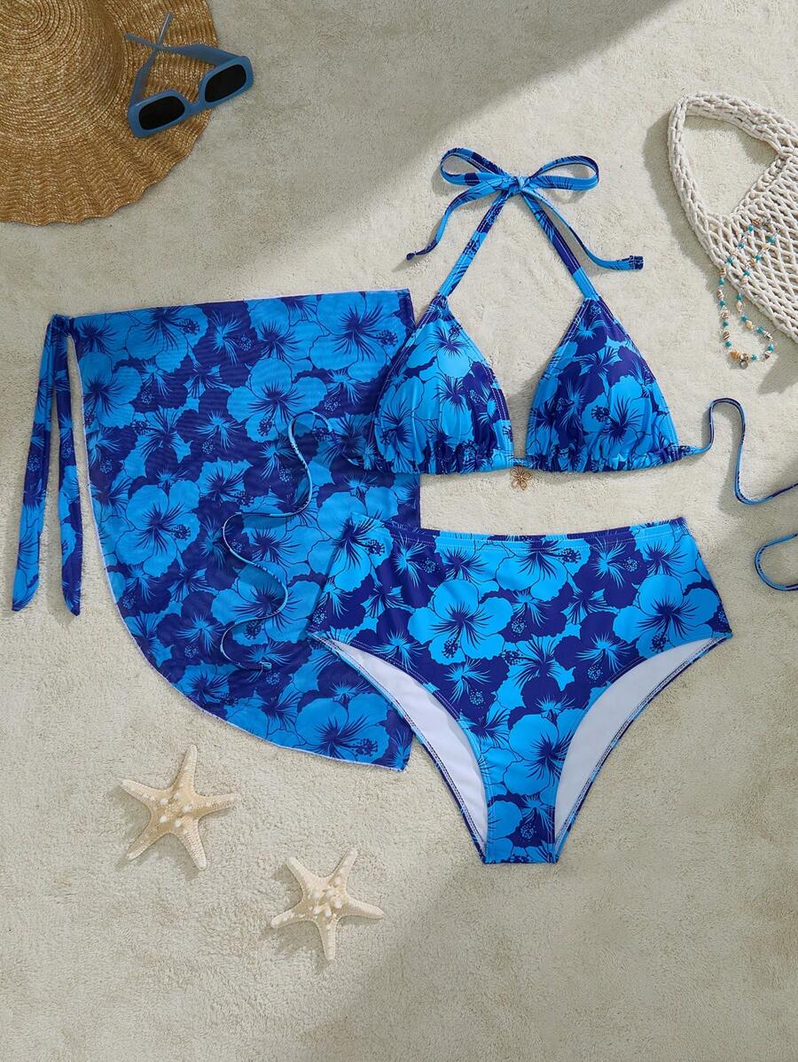 Conjunto de 3 piezas para mujer talla grande: top de bikini halter con estampado floral y bottom a juego, talla grande minifalda a juego para la playa y la natacion