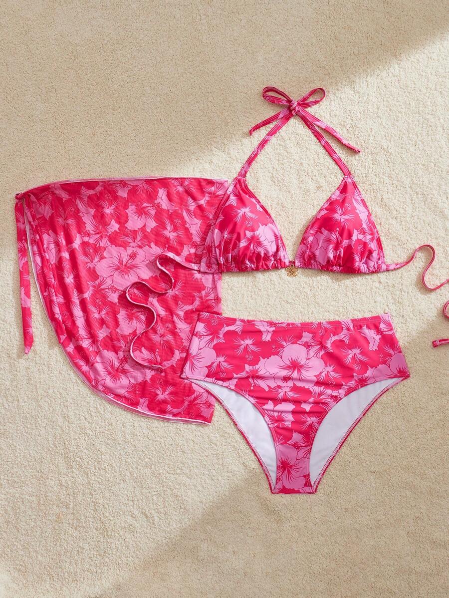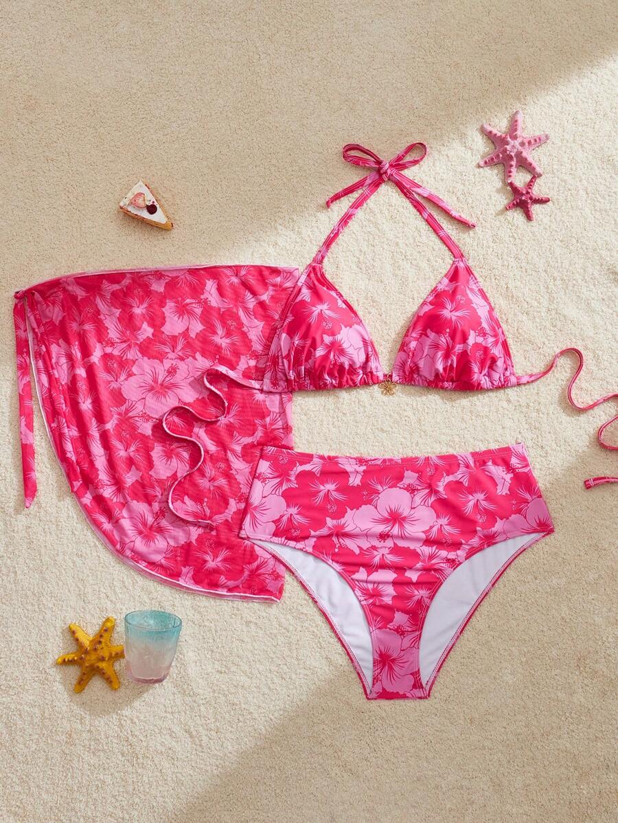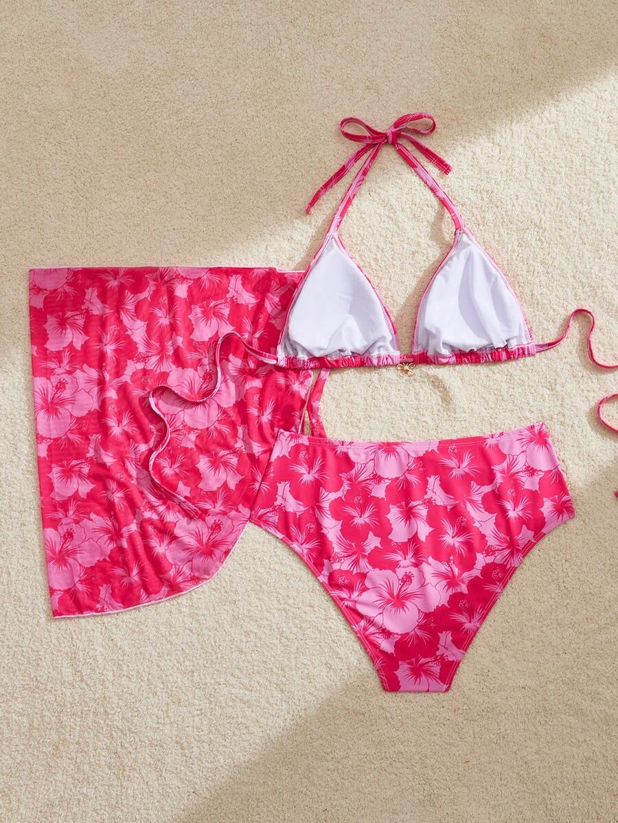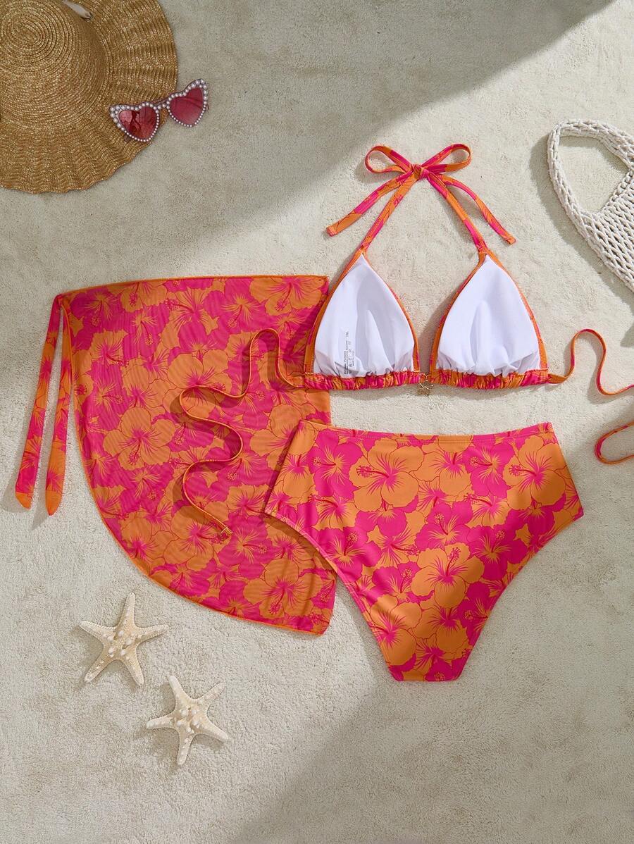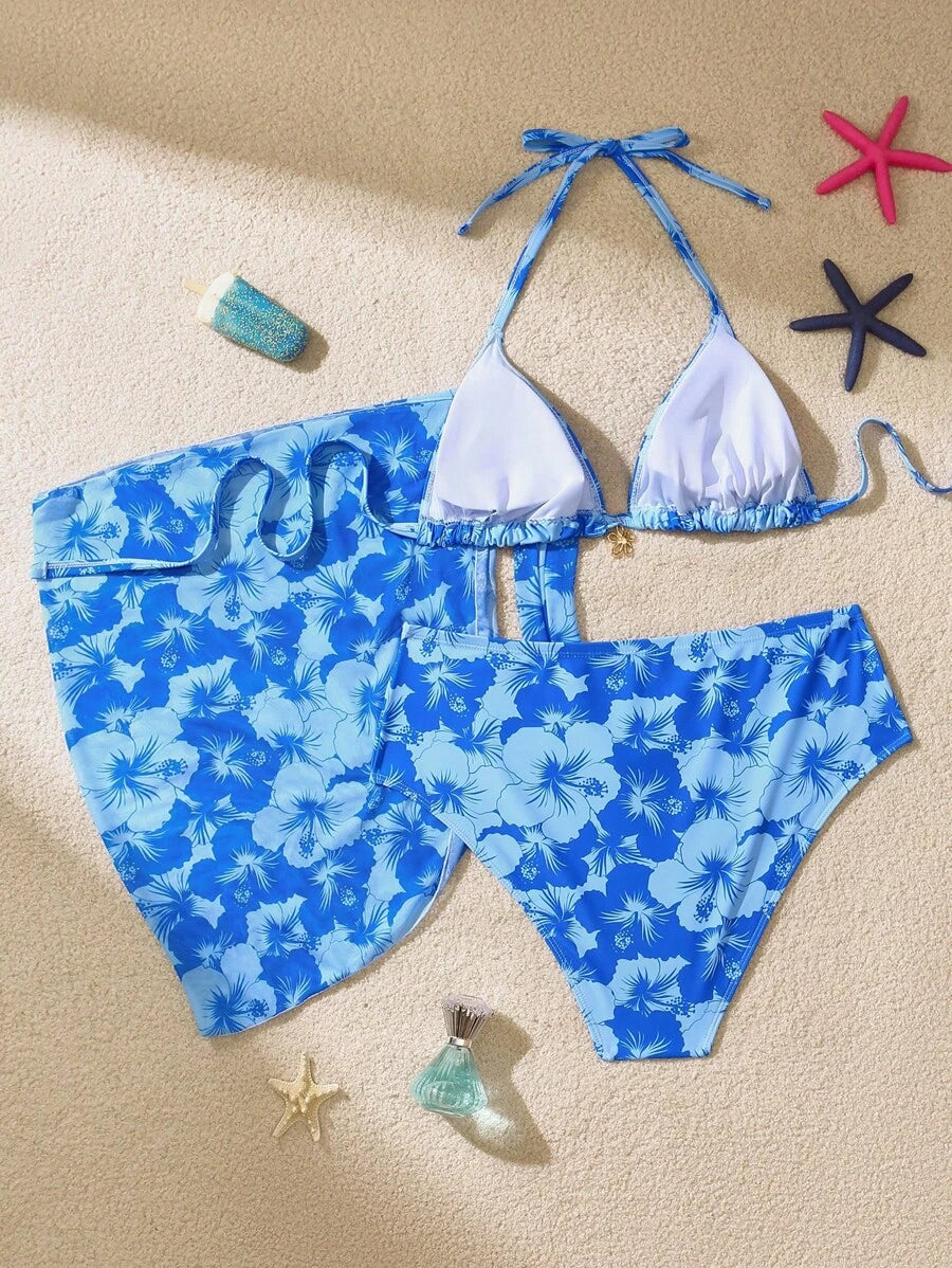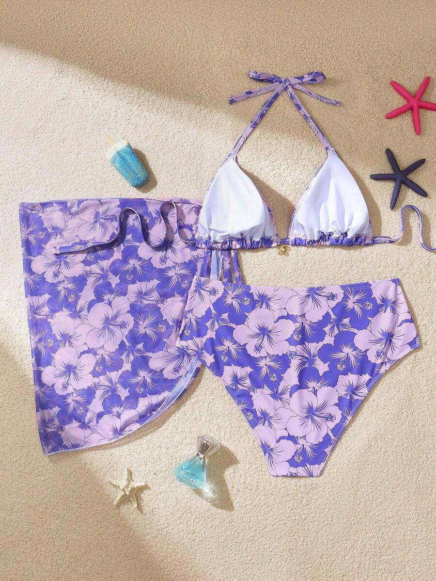 Conjunto de 3 piezas para mujer talla grande: top de bikini halter con estampado floral y bottom a juego, talla grande minifalda a juego para la playa y la natacion