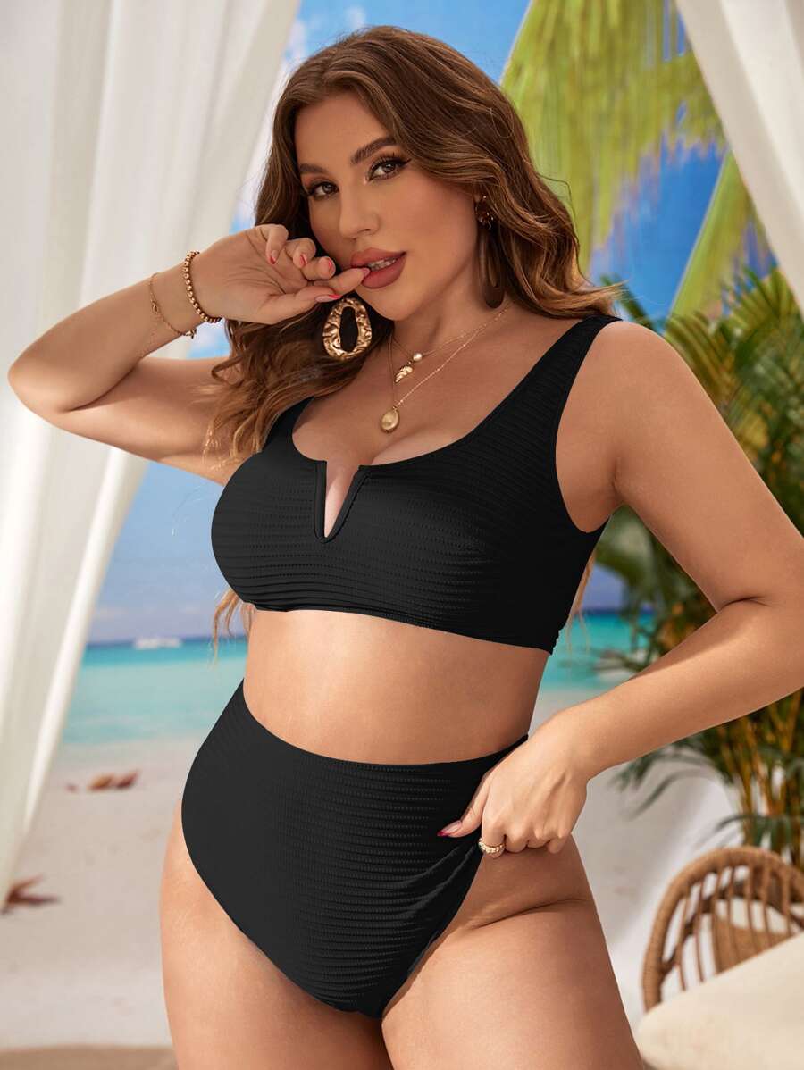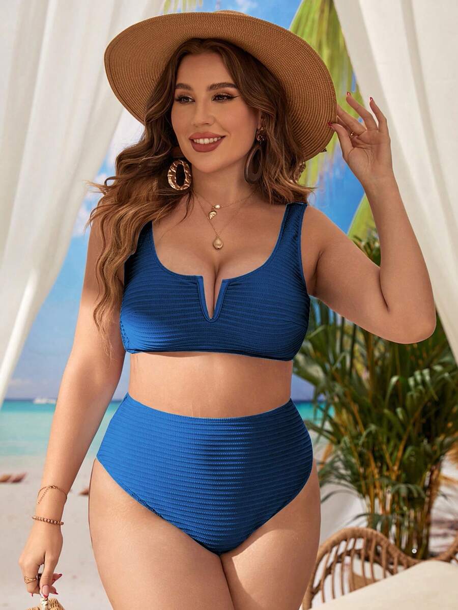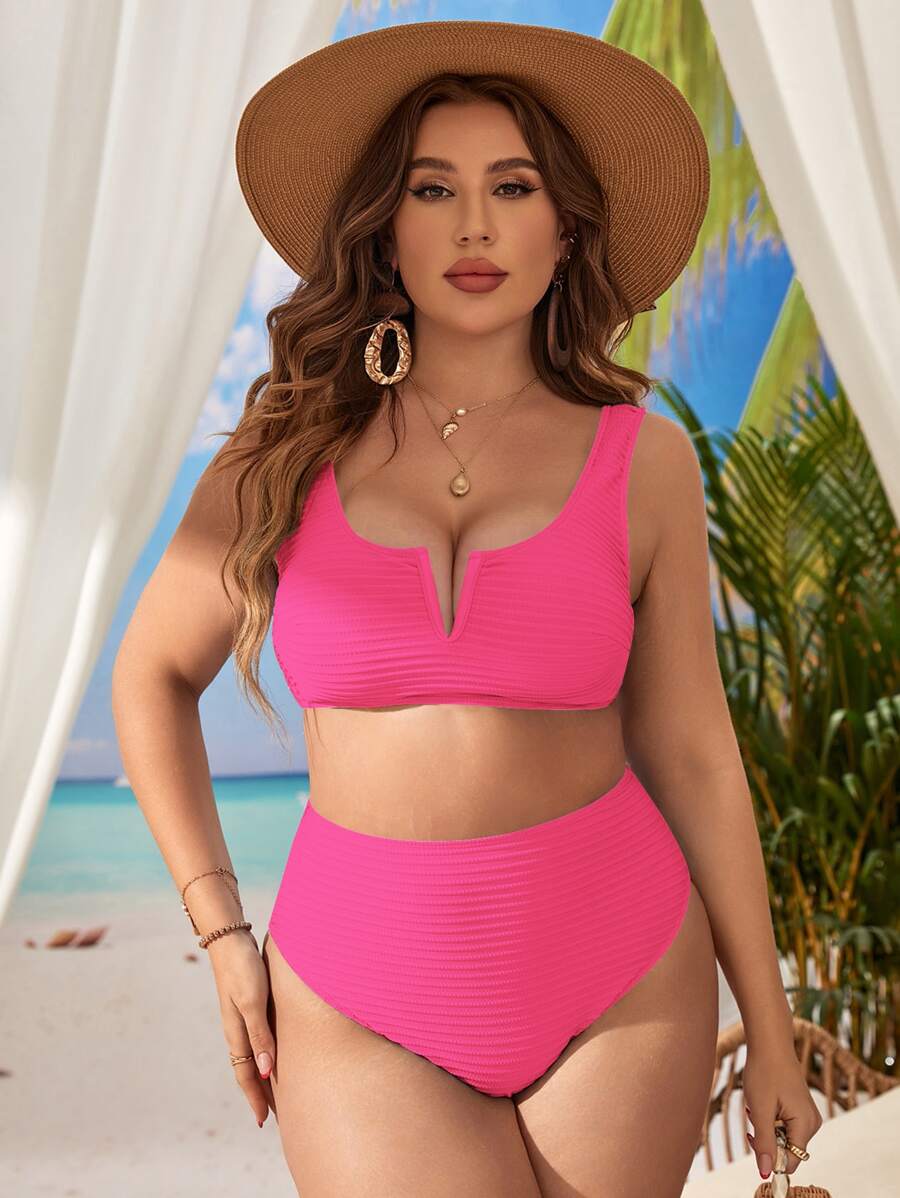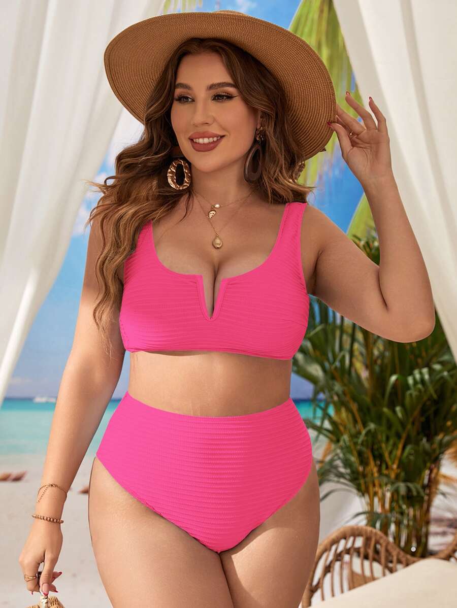 Traje de bano de dos piezas de bikini de unicolor sexy para mujer de talla grande para la playa de verano