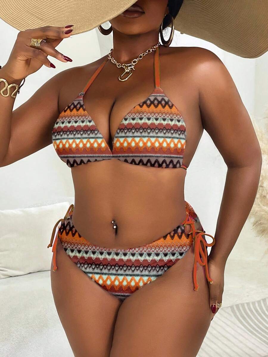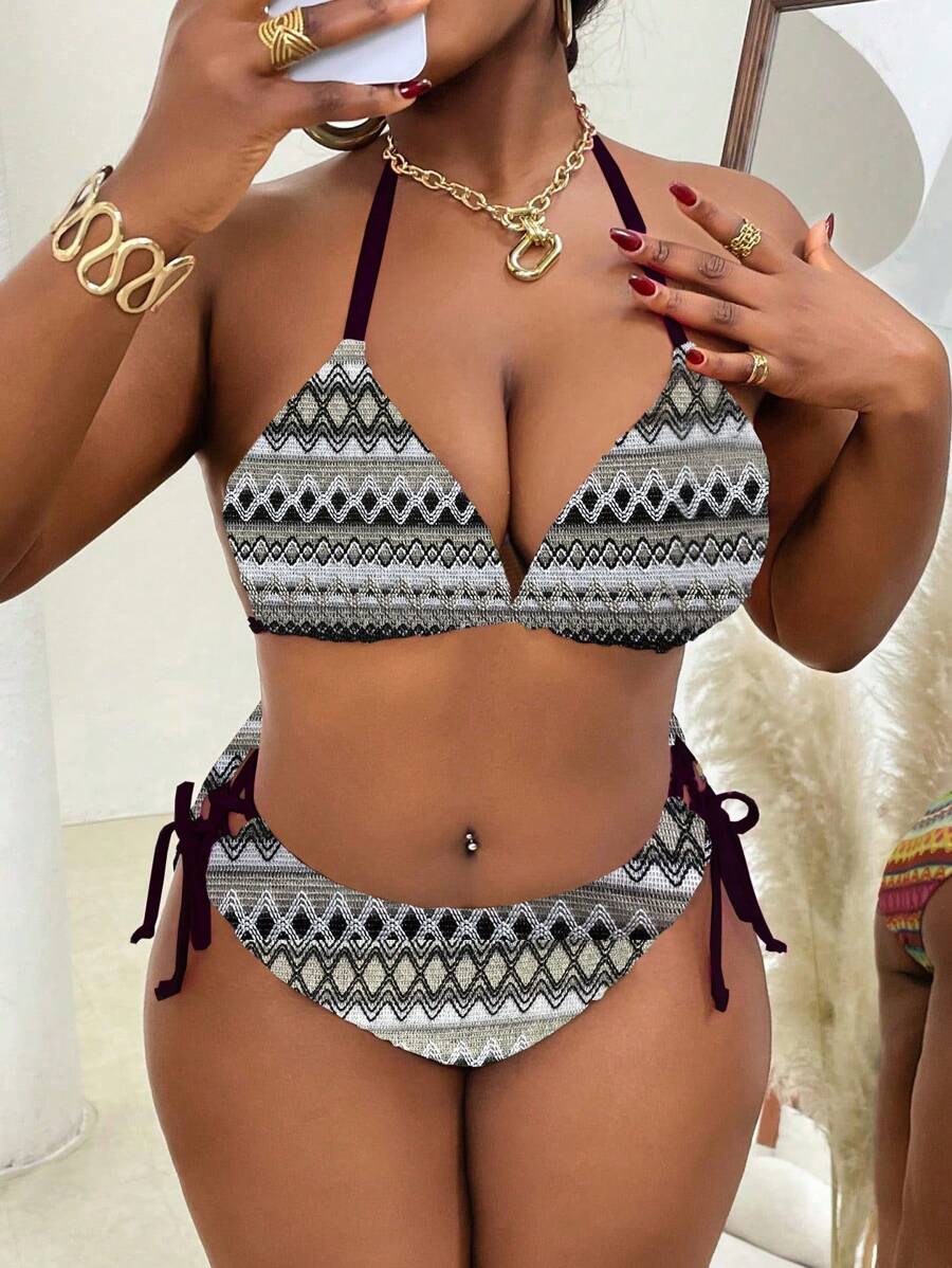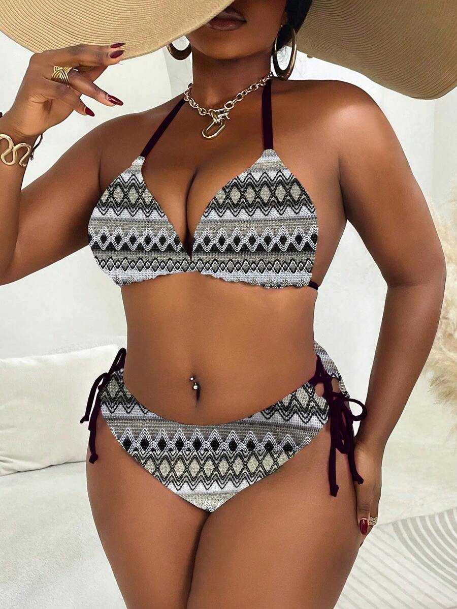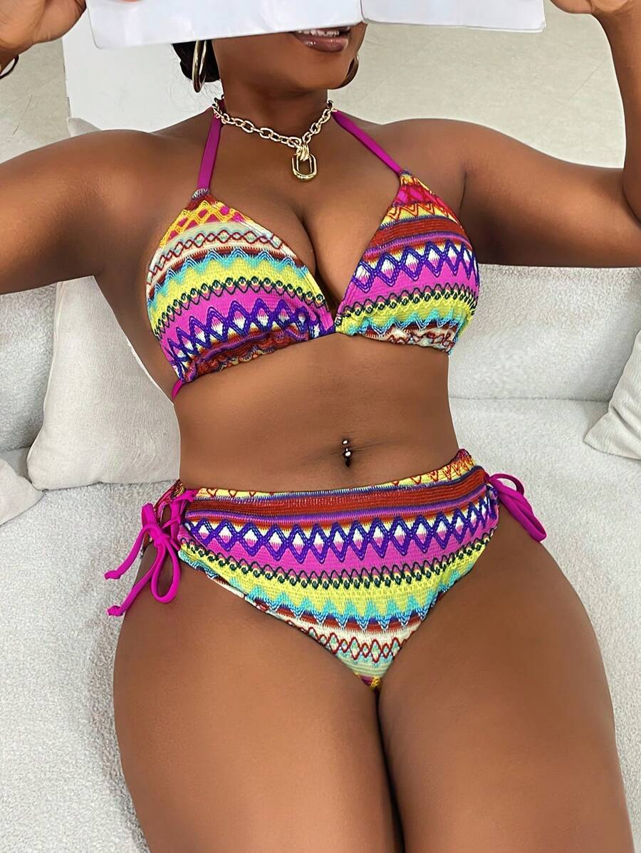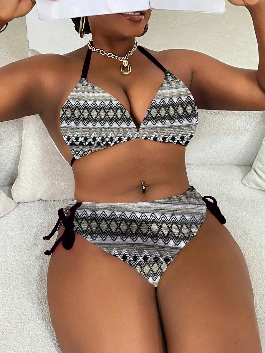 Conjunto de bikini sexy de 2 piezas con top de triangulo anudada y textura de tela para mujeres de talla grande, ideal para la playa y vacaciones