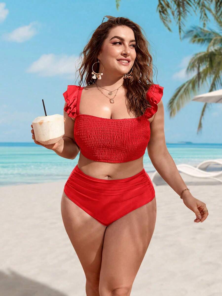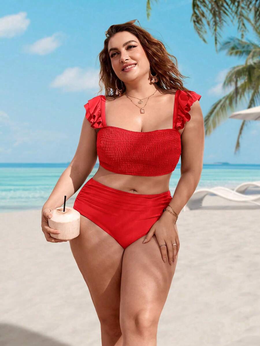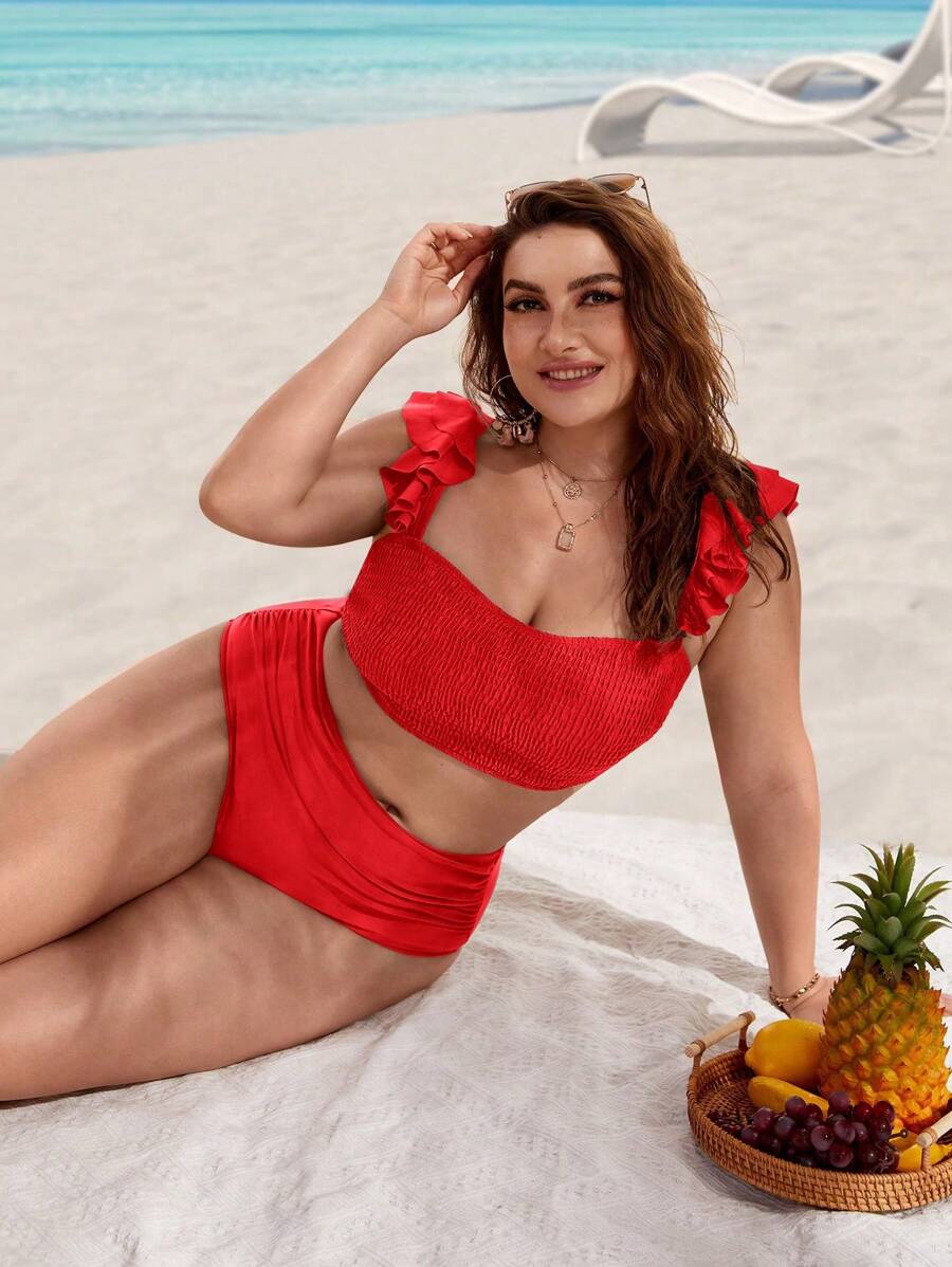 Lushoire conjunto de bikini holgado con abertura dividida, unicolor y volantes en los brazos, para mujer talla grande, para el verano