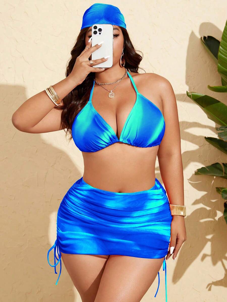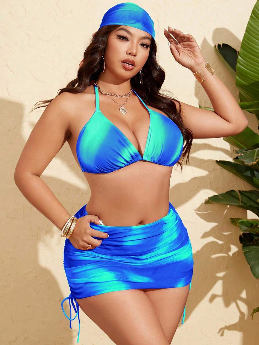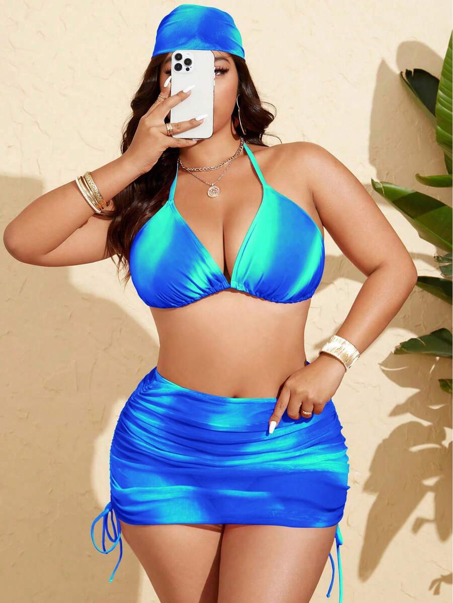 Conjunto de bikini de 4 piezas para mujer talla grande con estampado de tenido anudado, falda con volantes de red, panoleta para el cabello, conjunto de traje de bano para verano y vacaciones en la playa
