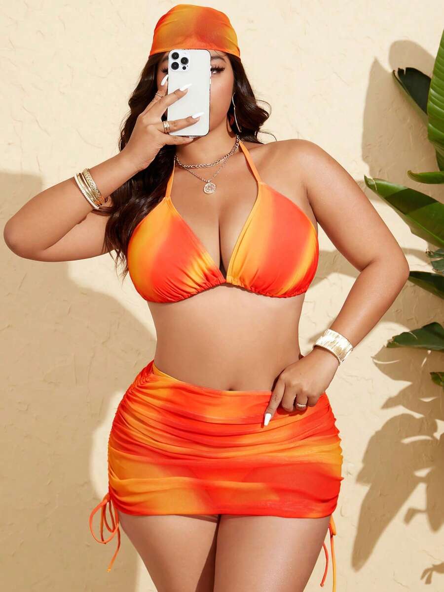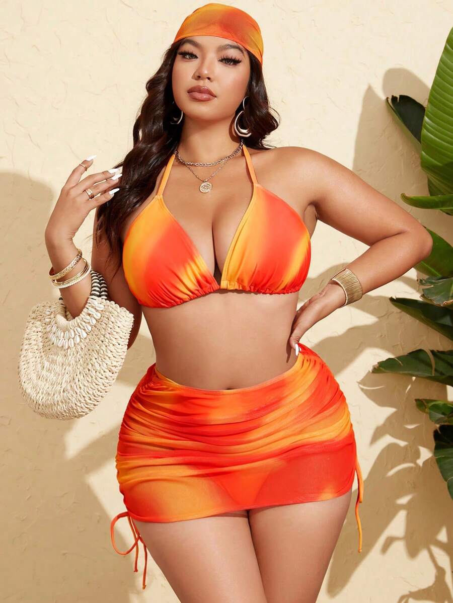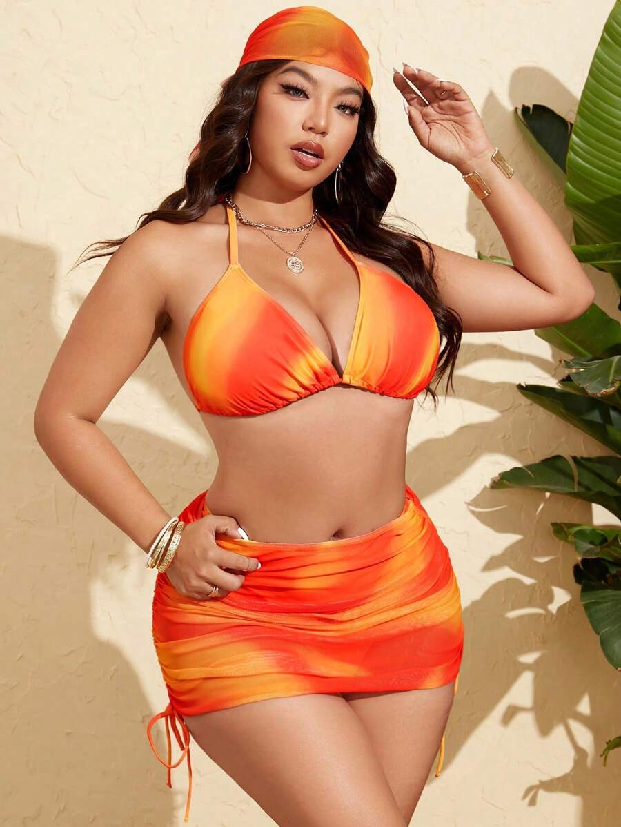 Conjunto de bikini de 4 piezas para mujer talla grande con estampado de tenido anudado, falda con volantes de red, panoleta para el cabello, conjunto de traje de bano para verano y vacaciones en la playa