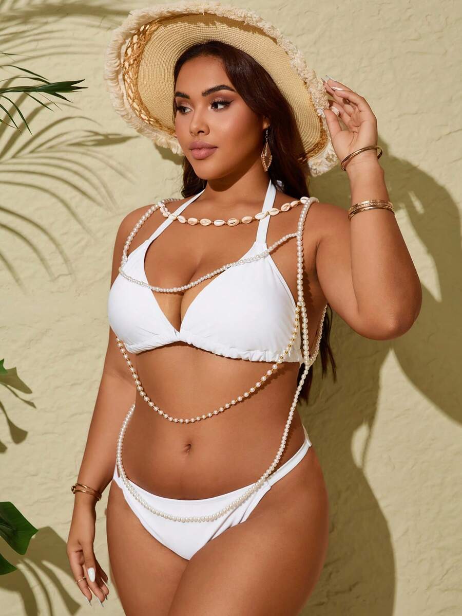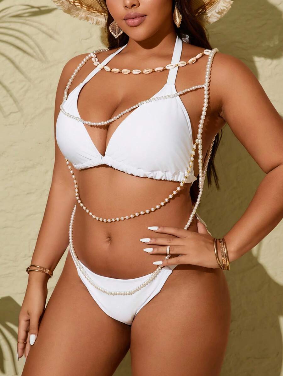 Bikini de talla grande para mujer de unicolor con escote halter y lazo – Muy Bonita