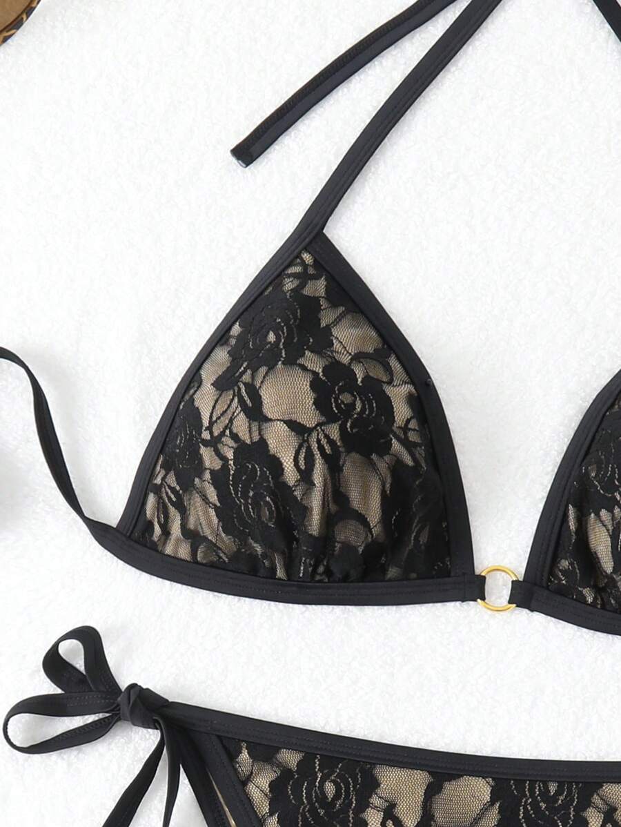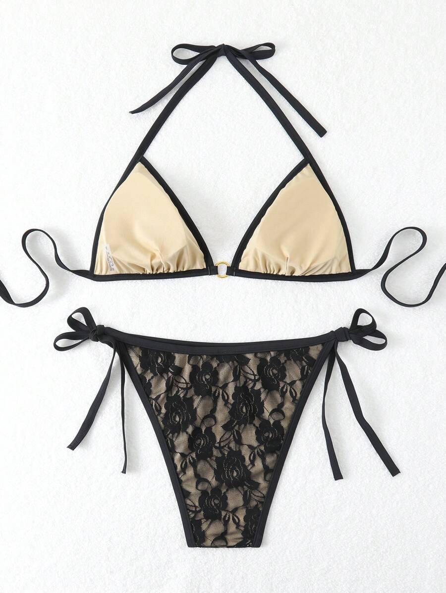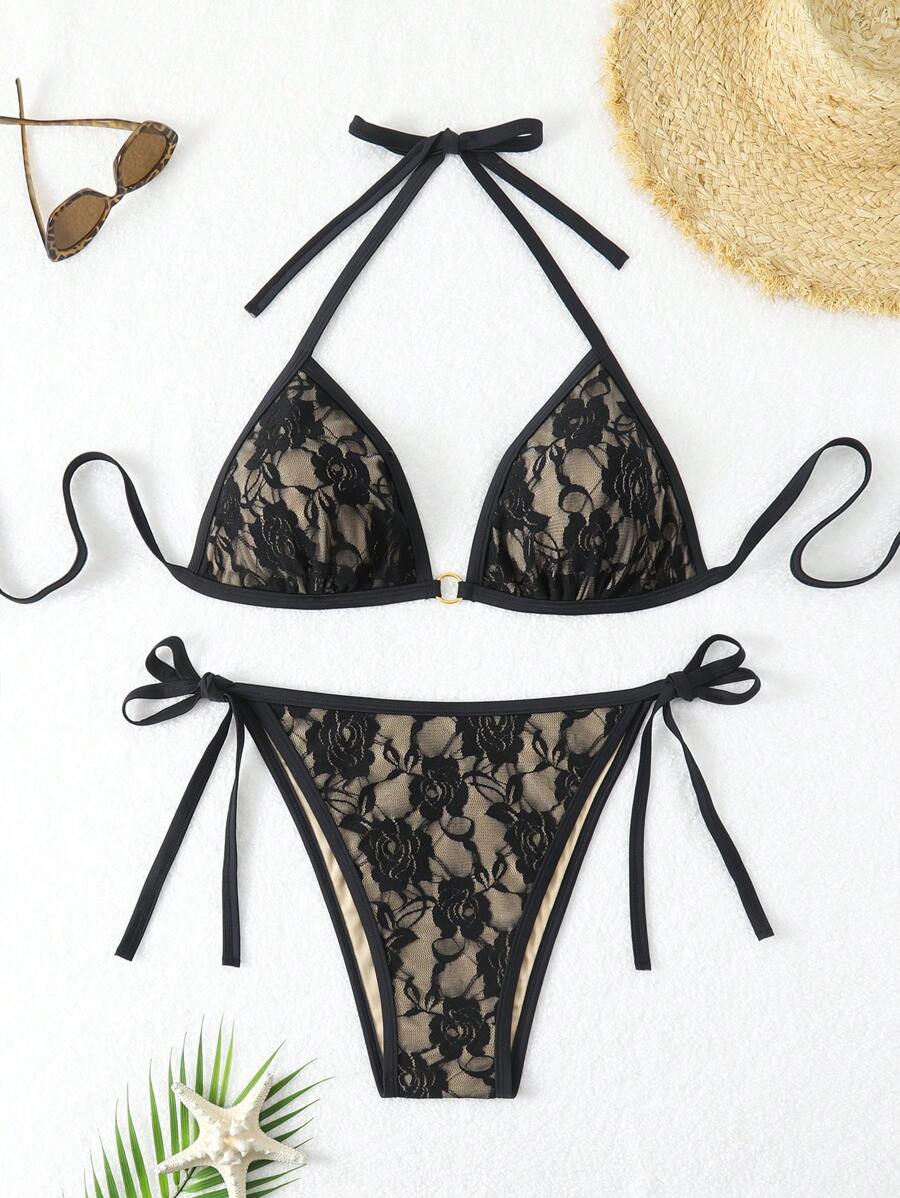 Lushoire conjunto de vestido de bano de talla grande en un solo color con cuello de halter y abertura, de verano
