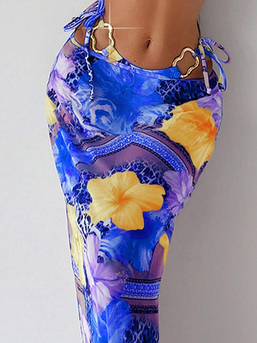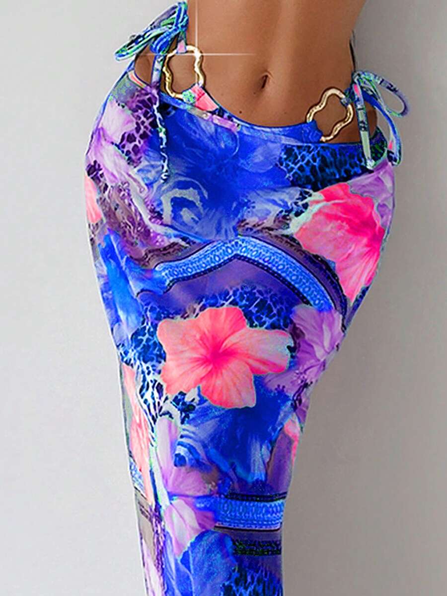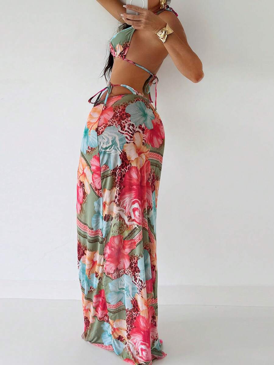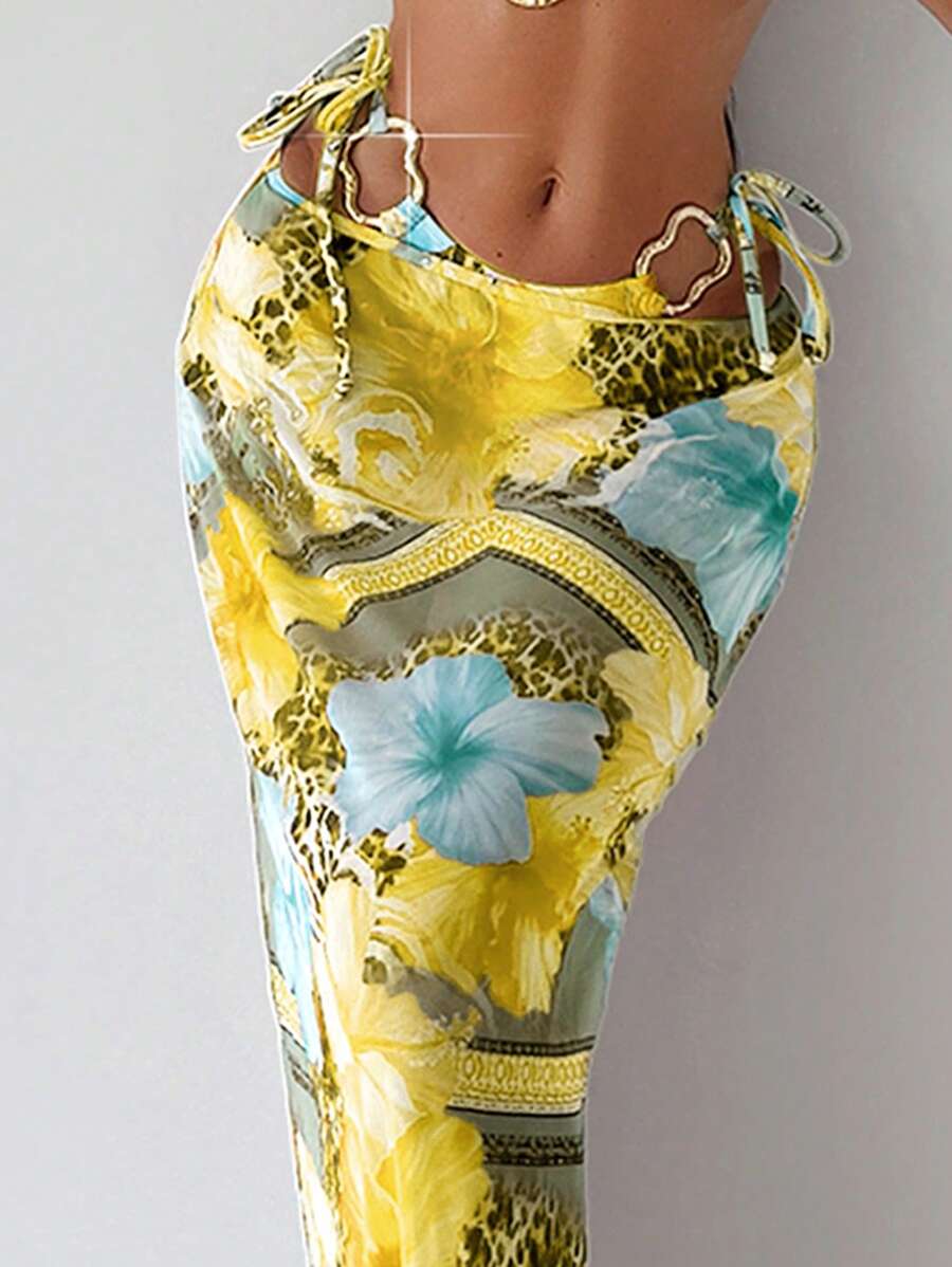 Bonvoyette conjunto de 3 piezas para mujer: top de bikini con tirantes finos estampado, tanga de bikini triangular y minifalda