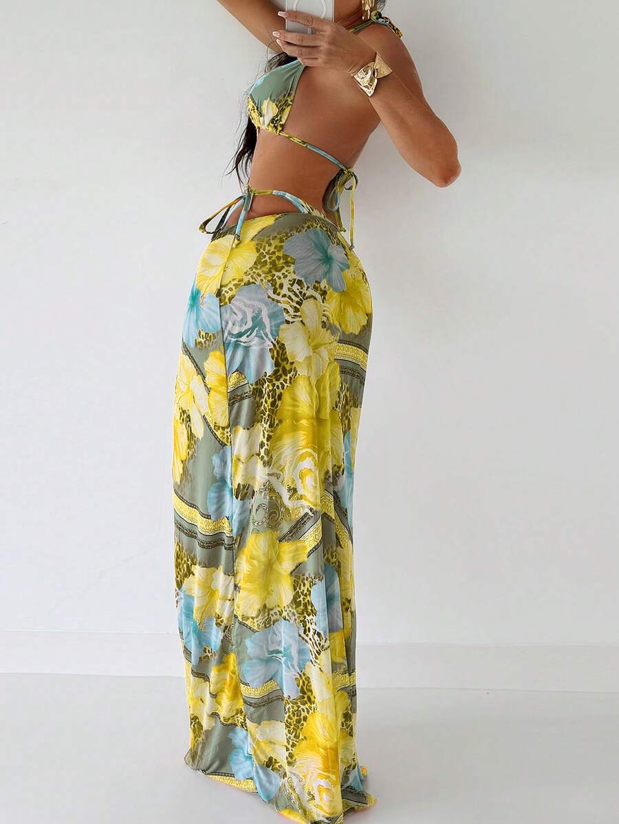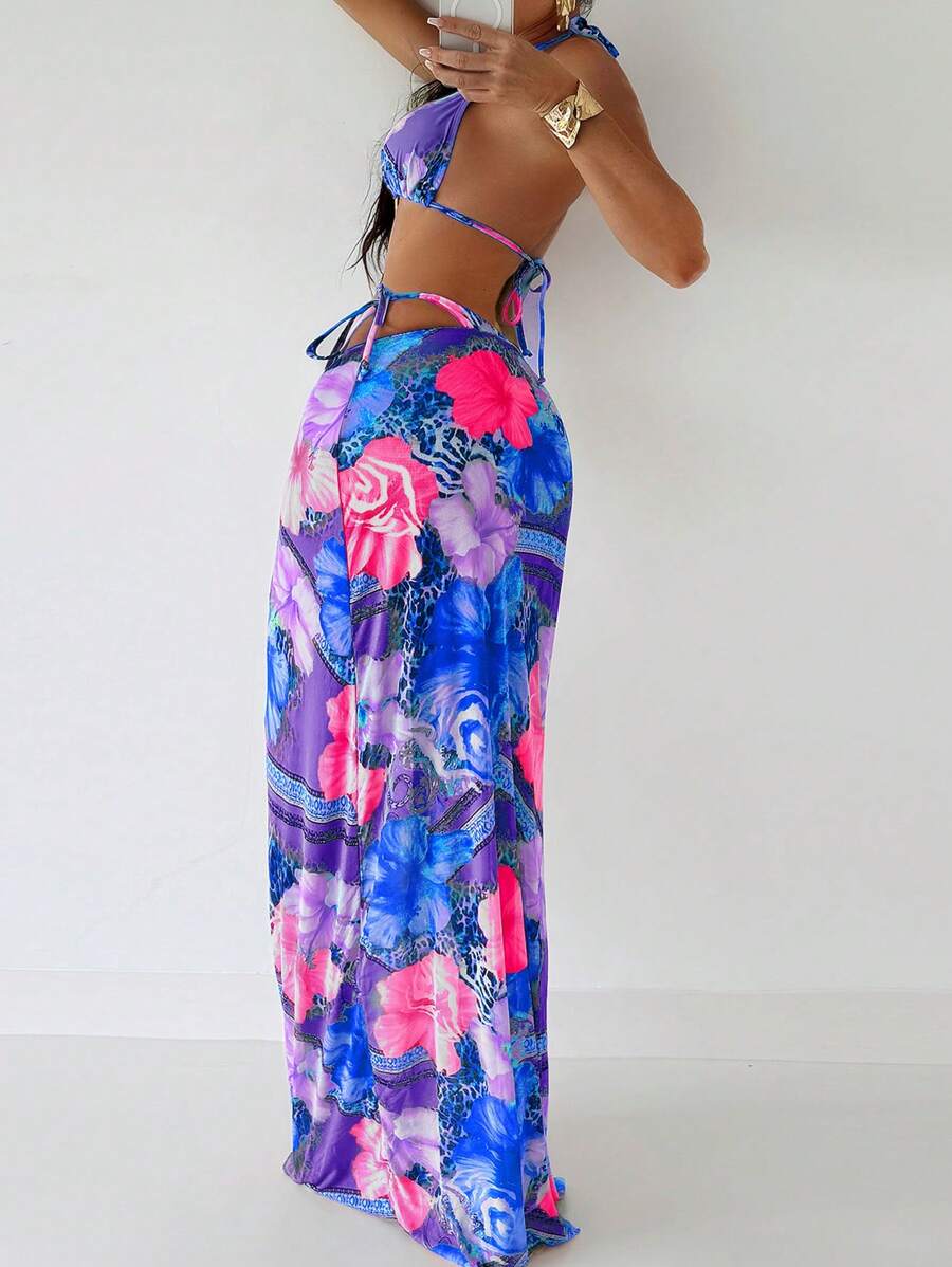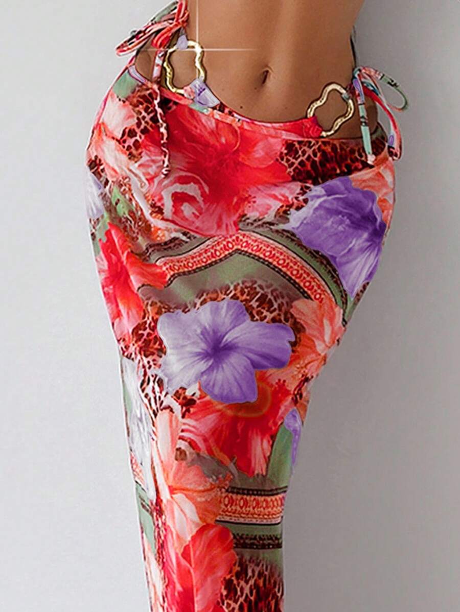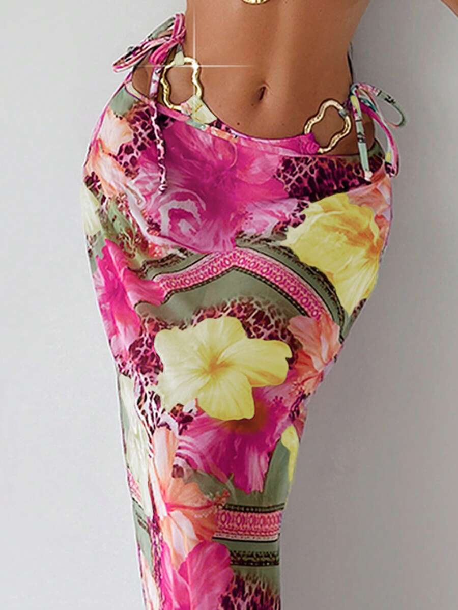 Bonvoyette conjunto de 3 piezas para mujer: top de bikini con tirantes finos estampado, tanga de bikini triangular y minifalda