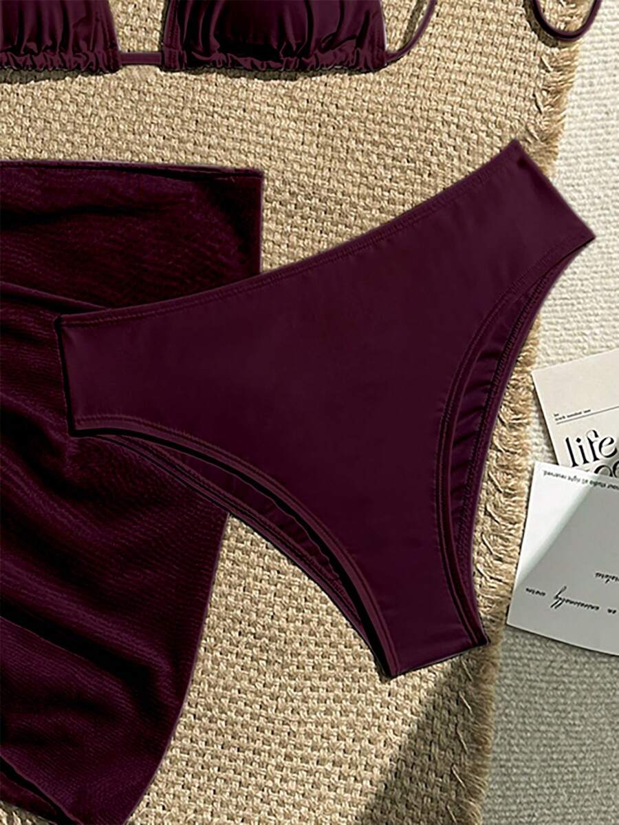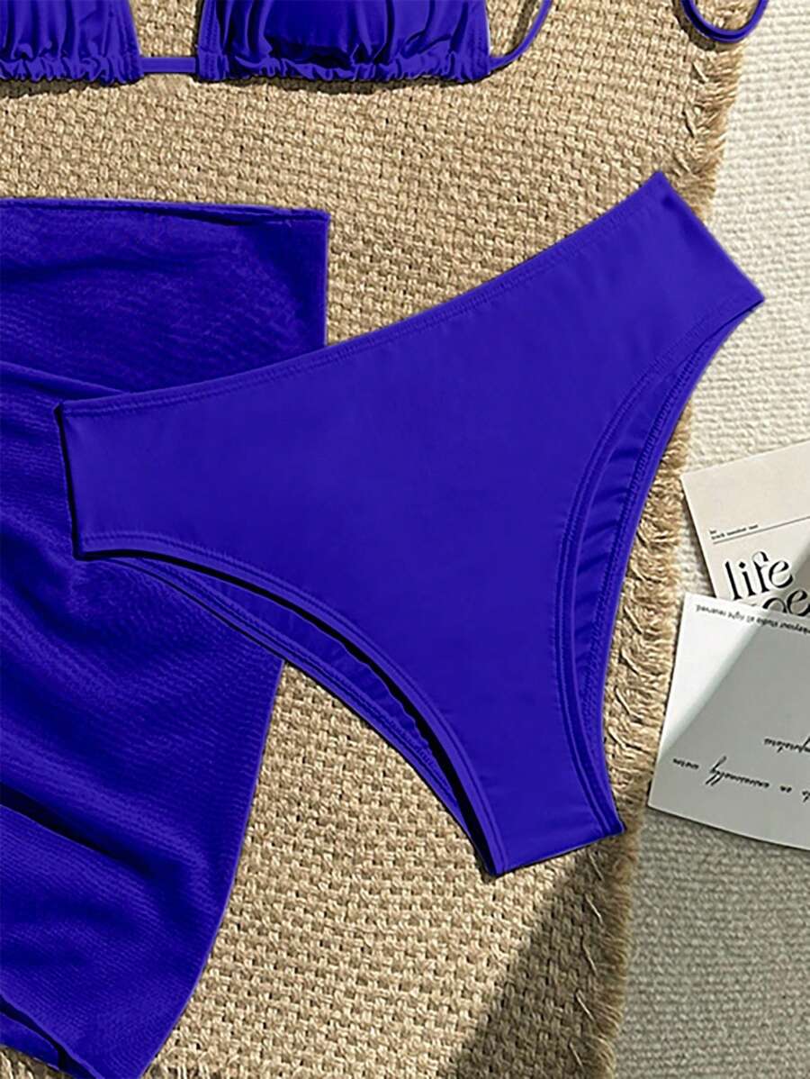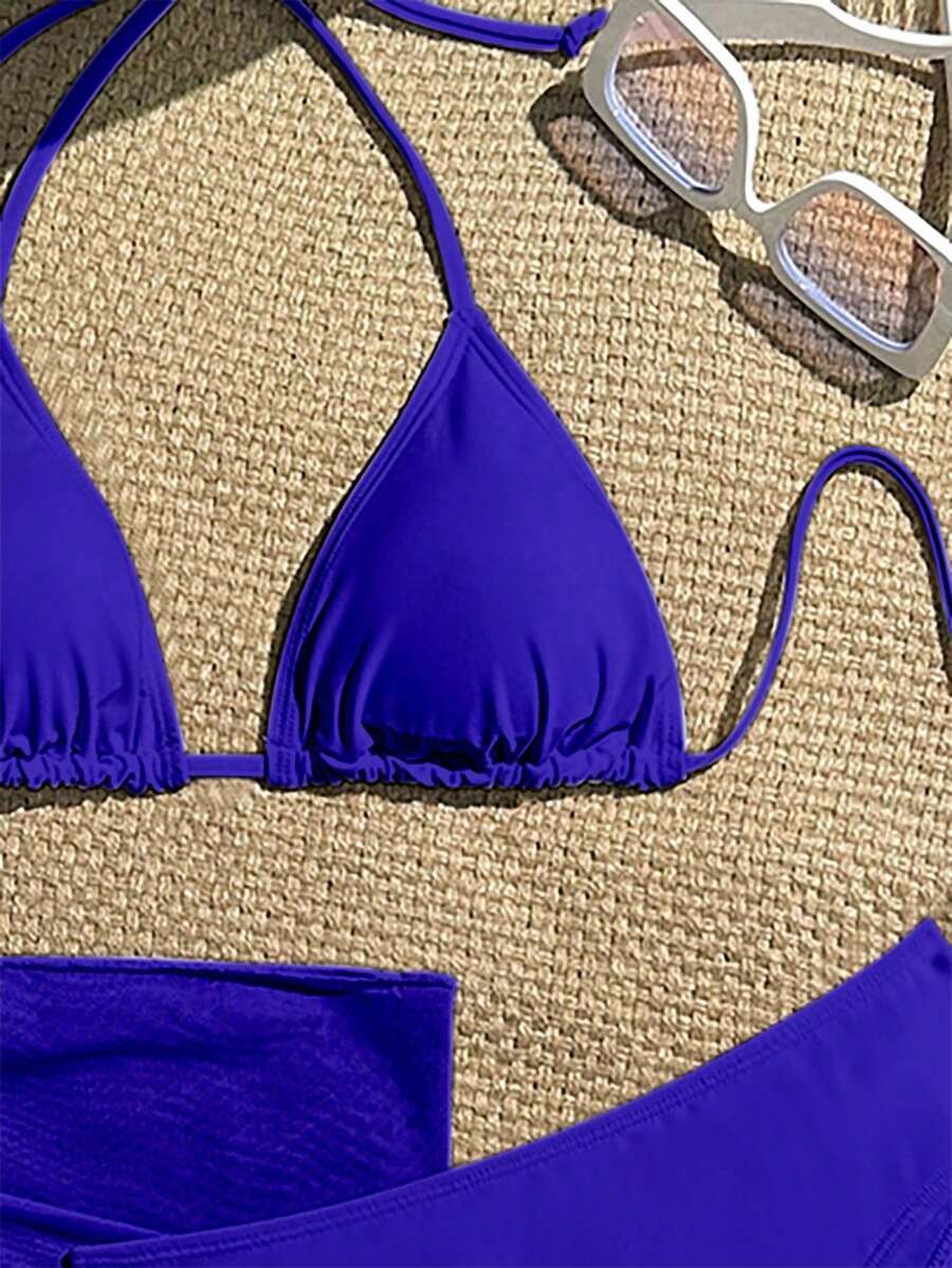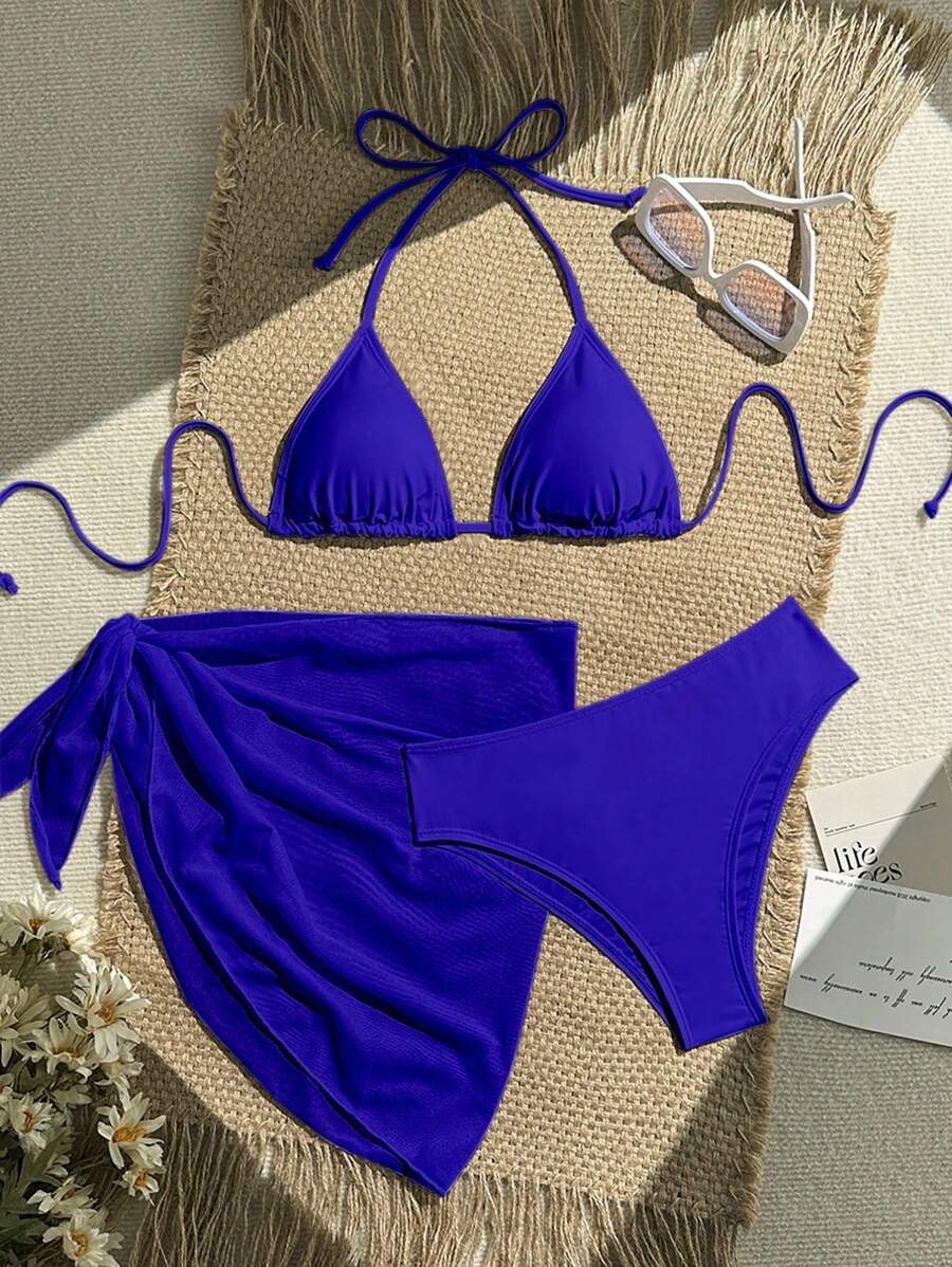 Conjunto de 3 piezas para mujer: top corto de unicolor con escote halter y nudo detras, braguita de bikini triangular y falda envolvente traslucida