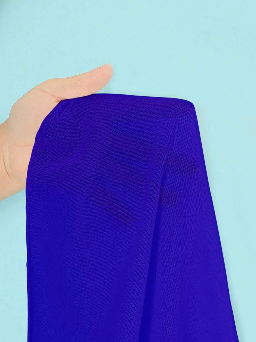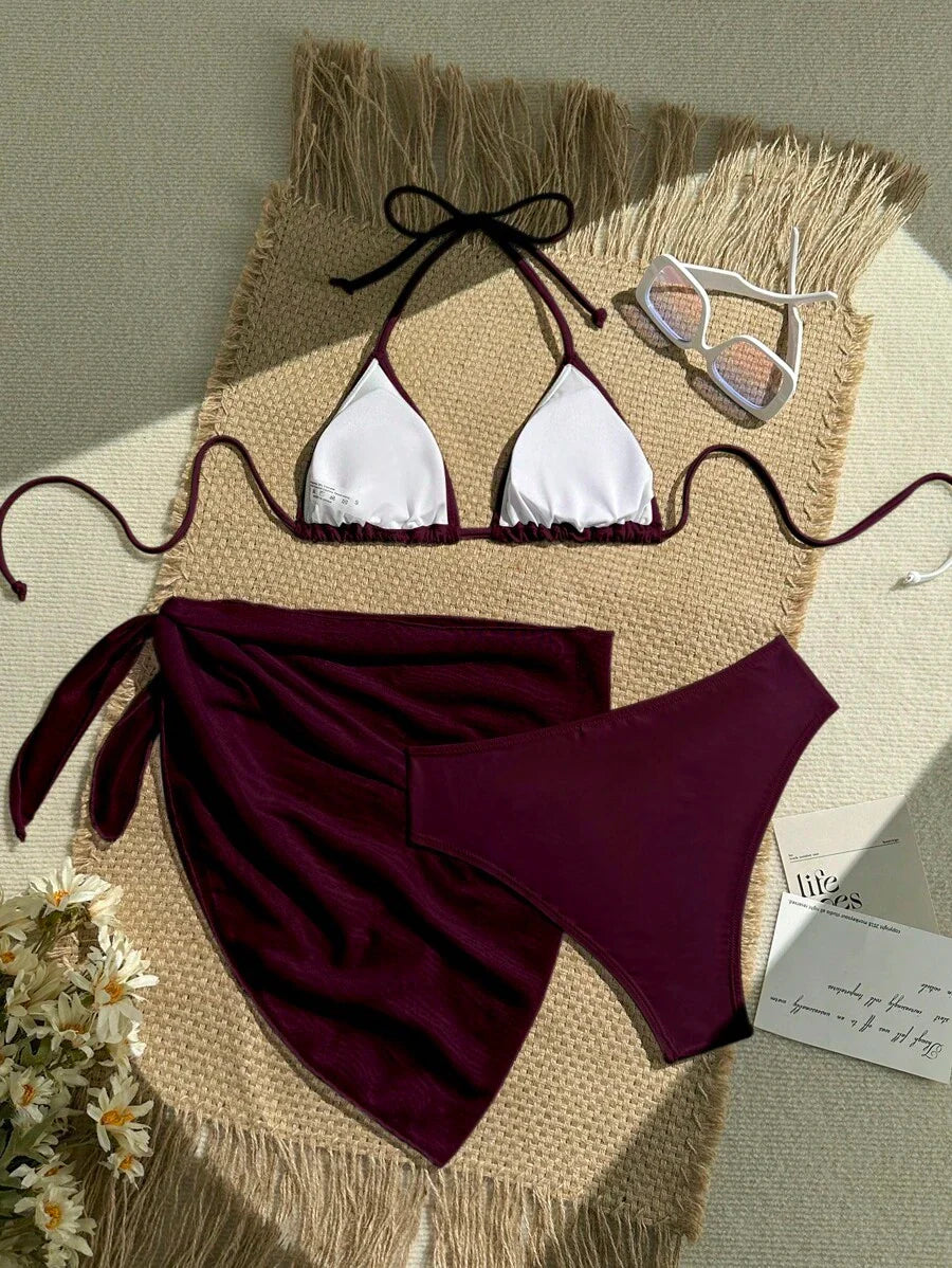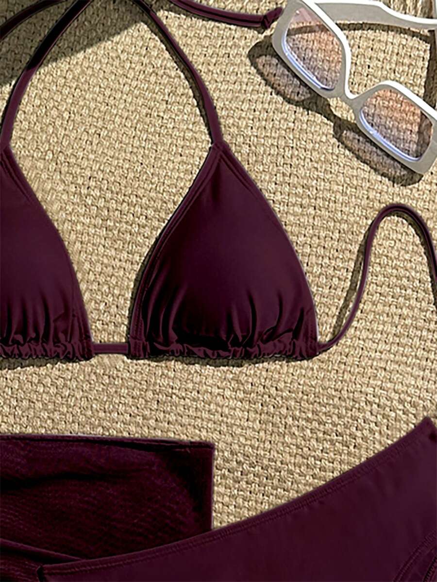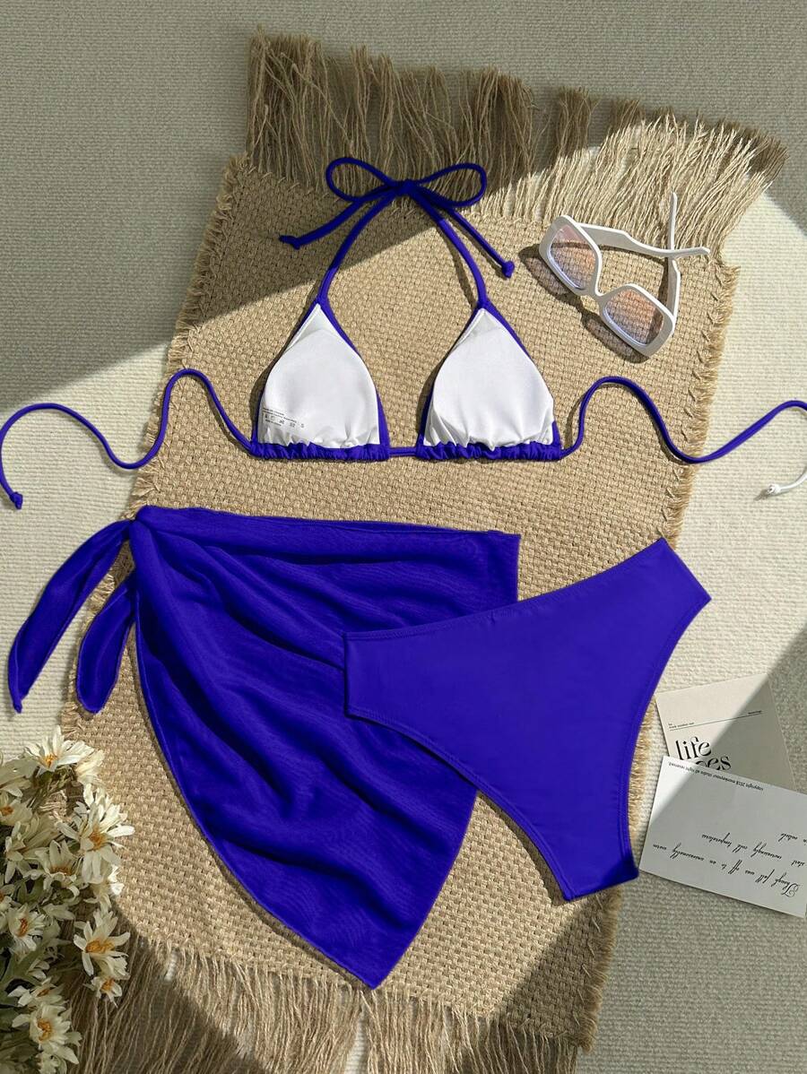 Conjunto de 3 piezas para mujer: top corto de unicolor con escote halter y nudo detras, braguita de bikini triangular y falda envolvente traslucida