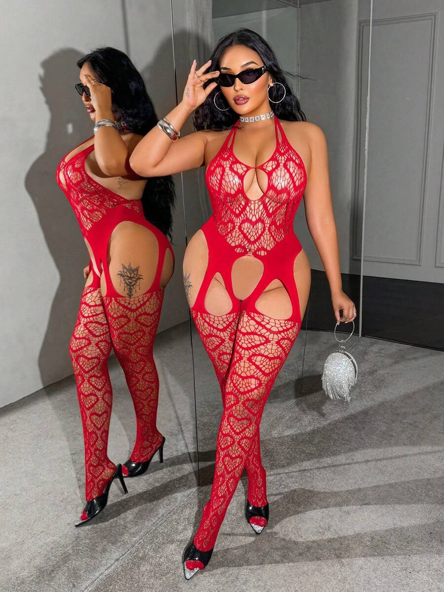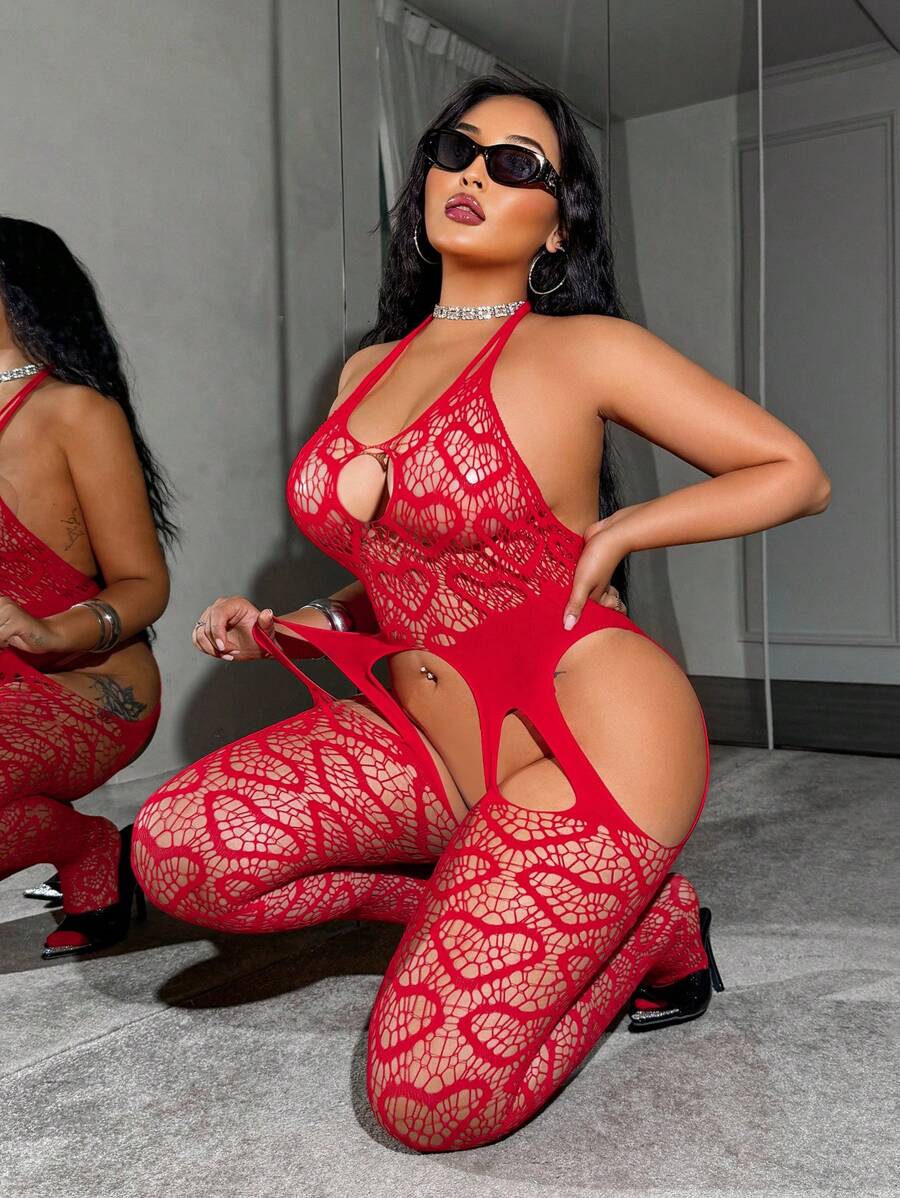 Lenceria tipo teddy de talla grande con estampado de corazones en toda la malla, sin pies, sin entrepierna, con recortes, diseno de cuello halter, efecto estilizador