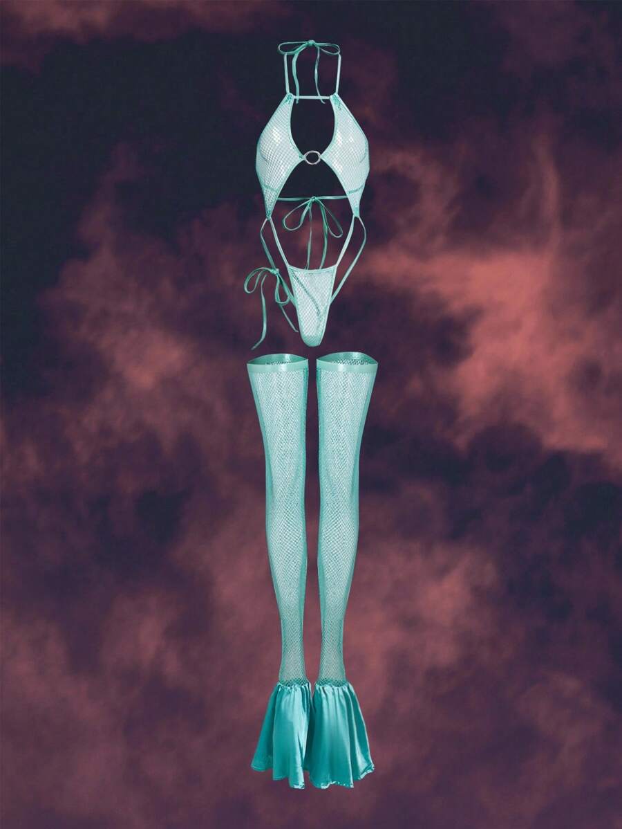 Conjunto de 2 piezas sexy estilo y2k para club, body de red con ribete de volantes, diseno sin espalda y revelador, adecuado para despedida de soltera