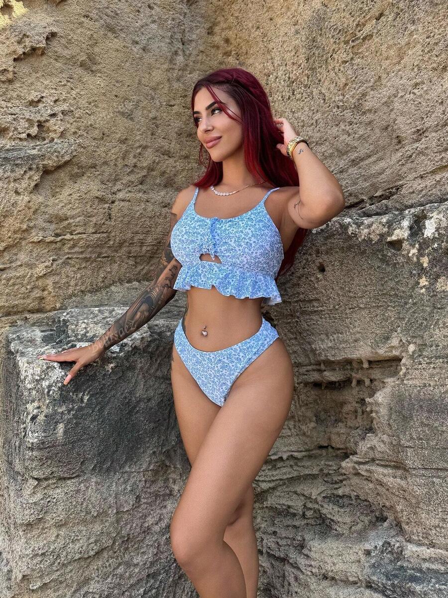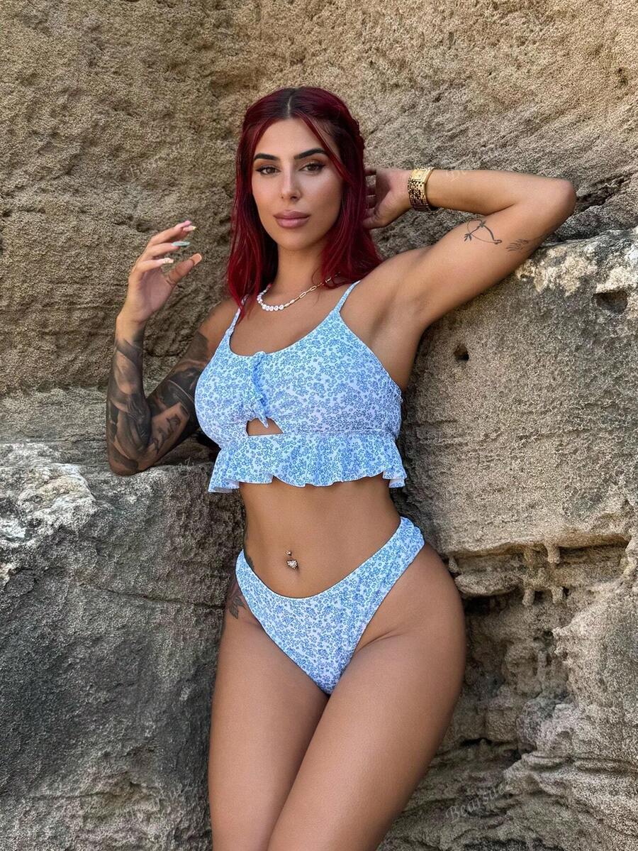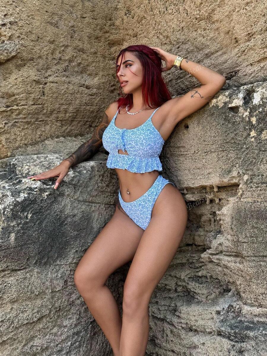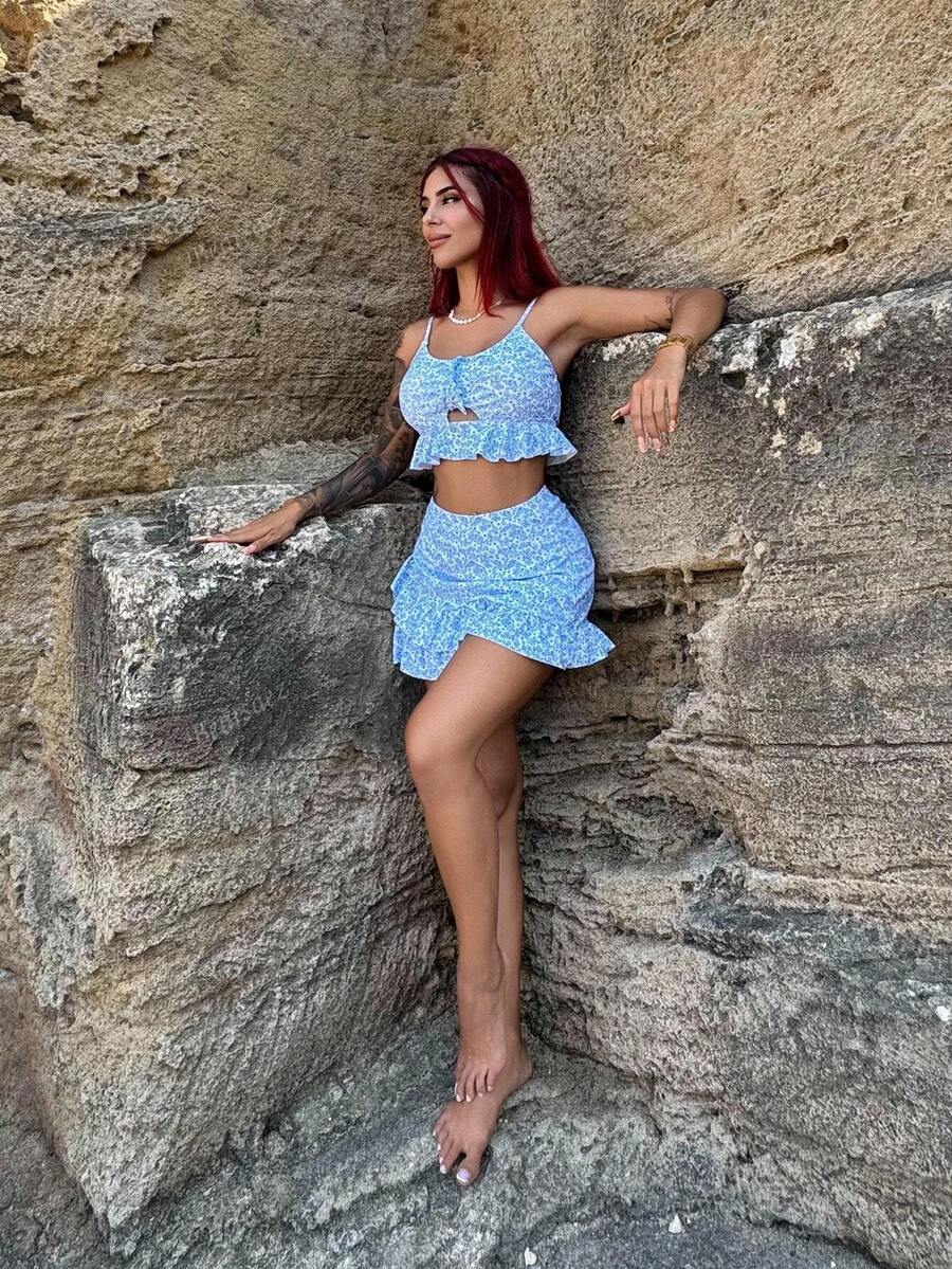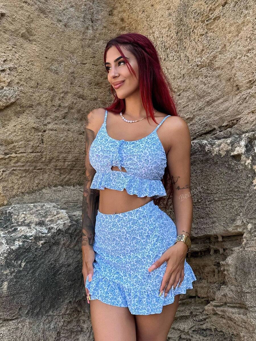 Bearsaez conjunto de bikini de 3 piezas para mujer con dobladillo de volantes y patron aleatorio impreso en toda la prenda, adecuado para la playa en verano