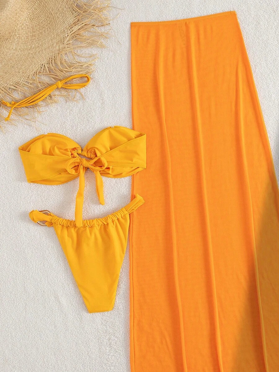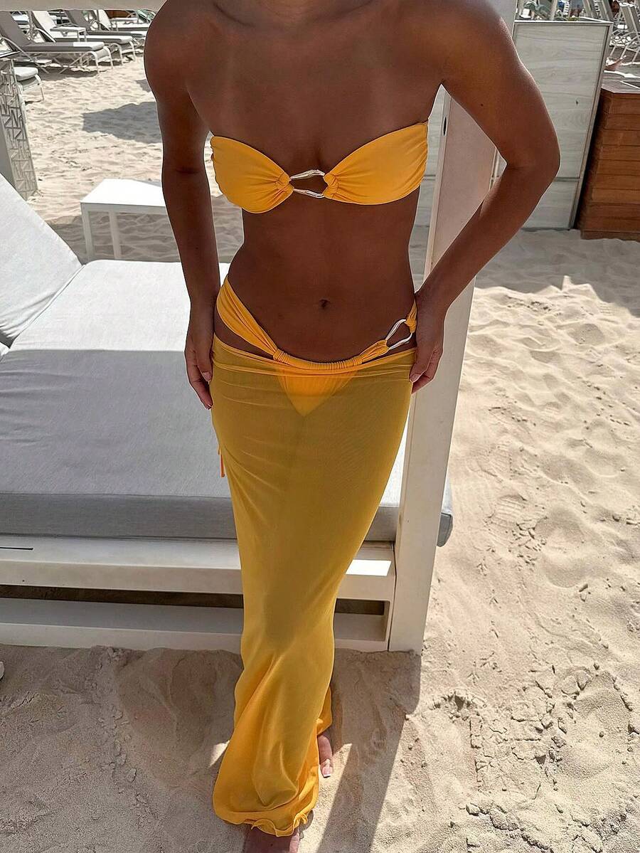 Conjunto de traje de bano de 3 piezas para mujer, con bikini brasier sin tirantes de unicolor y espalda descubierta, talla grande una falda mini y una cubierta de malla, para el verano