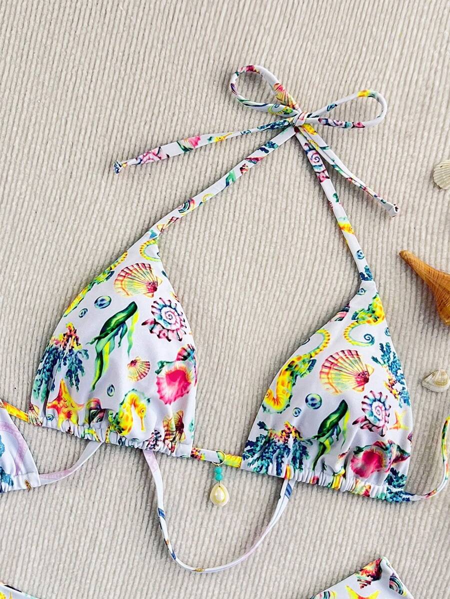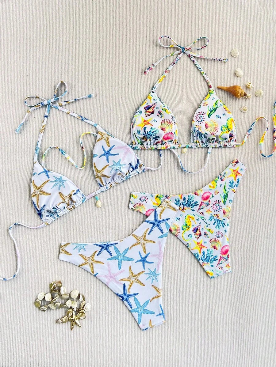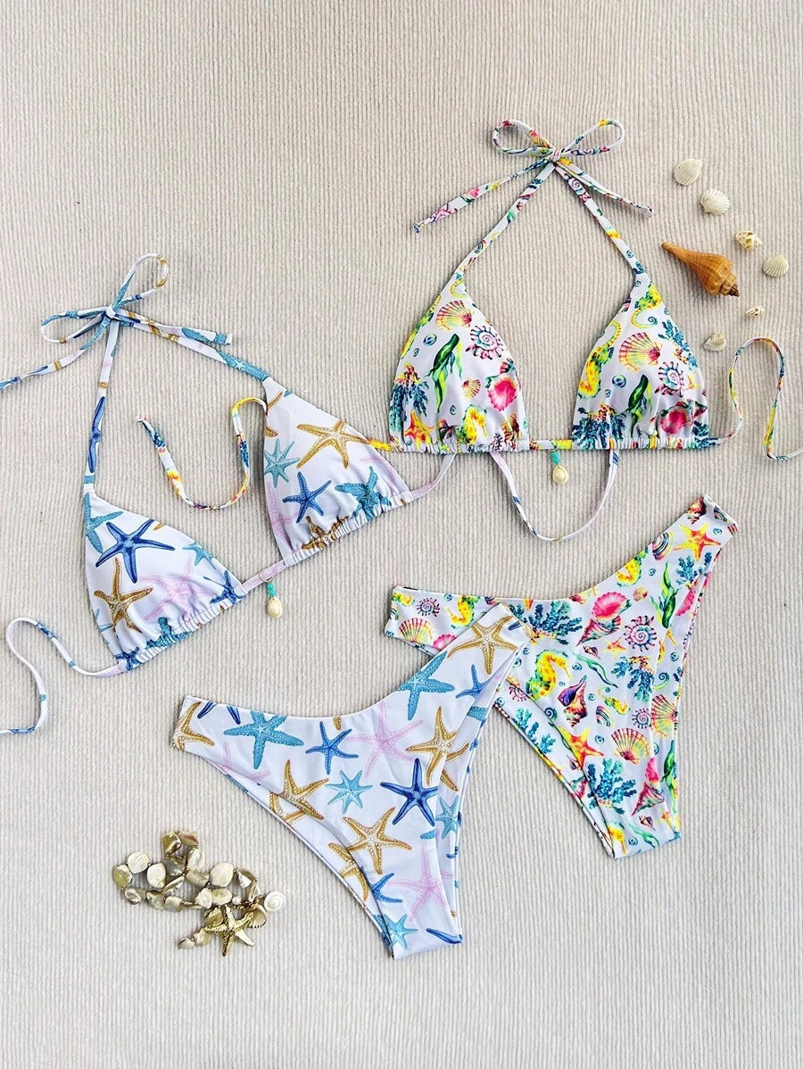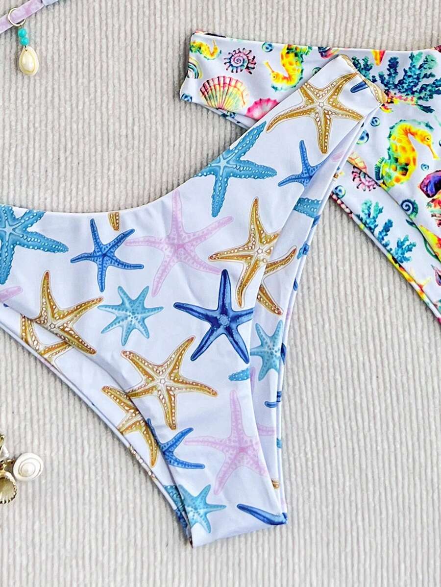 Conjunto de varios trajes de bano tipo bikini recortados de alta calidad con diseno retorcido en los lados y estampado del mundo submarino multicolor para mujeres, perfecto para vacaciones en la playa