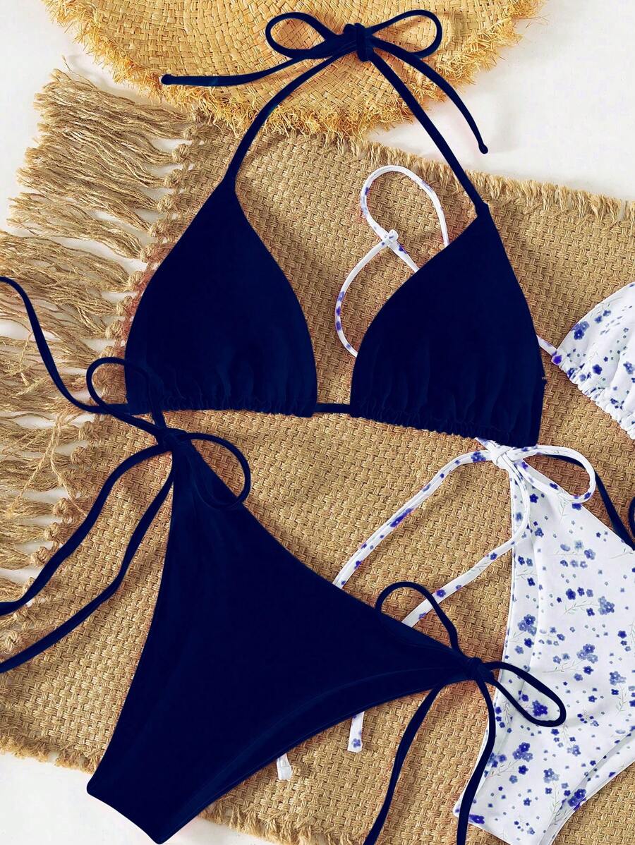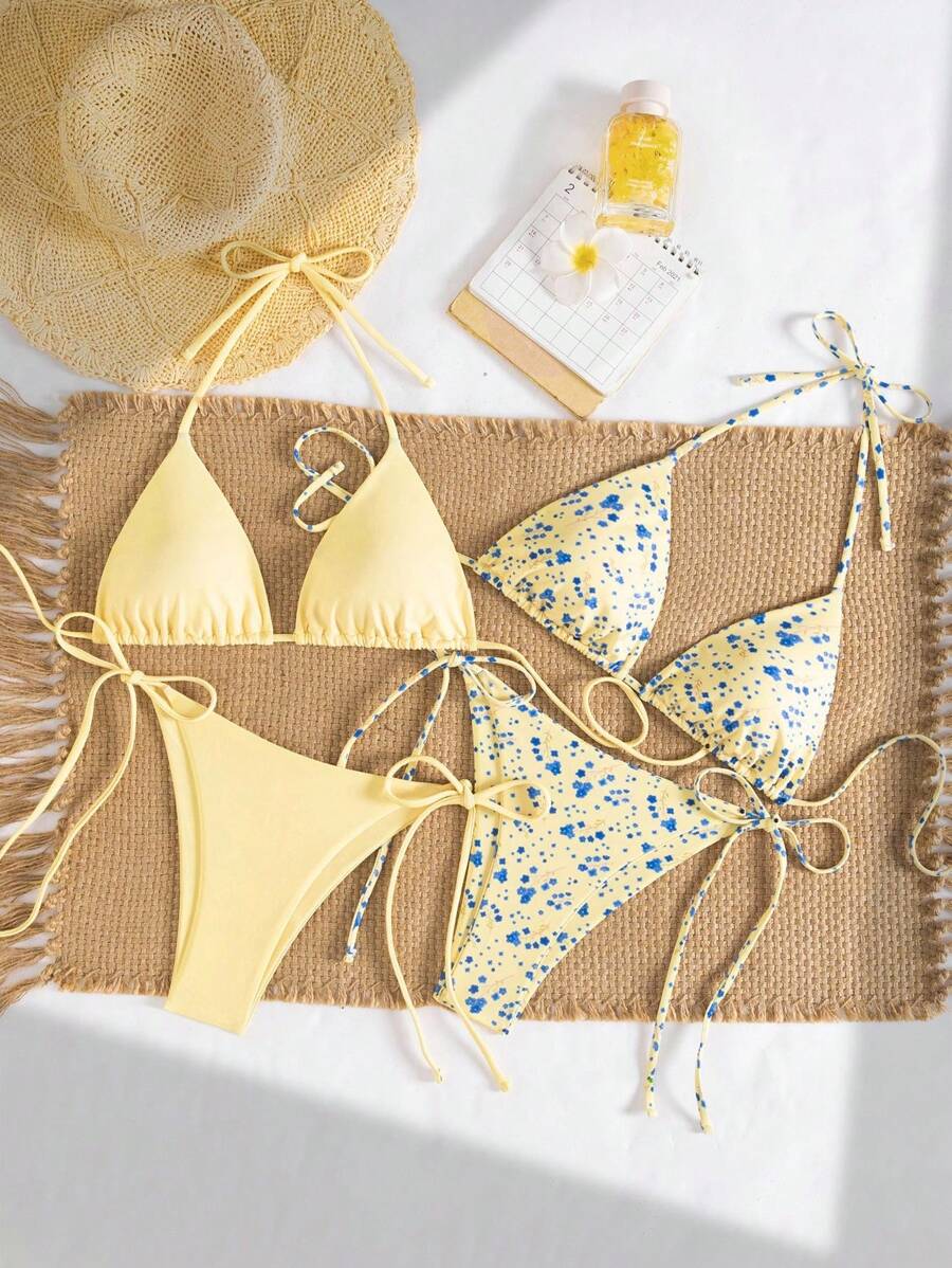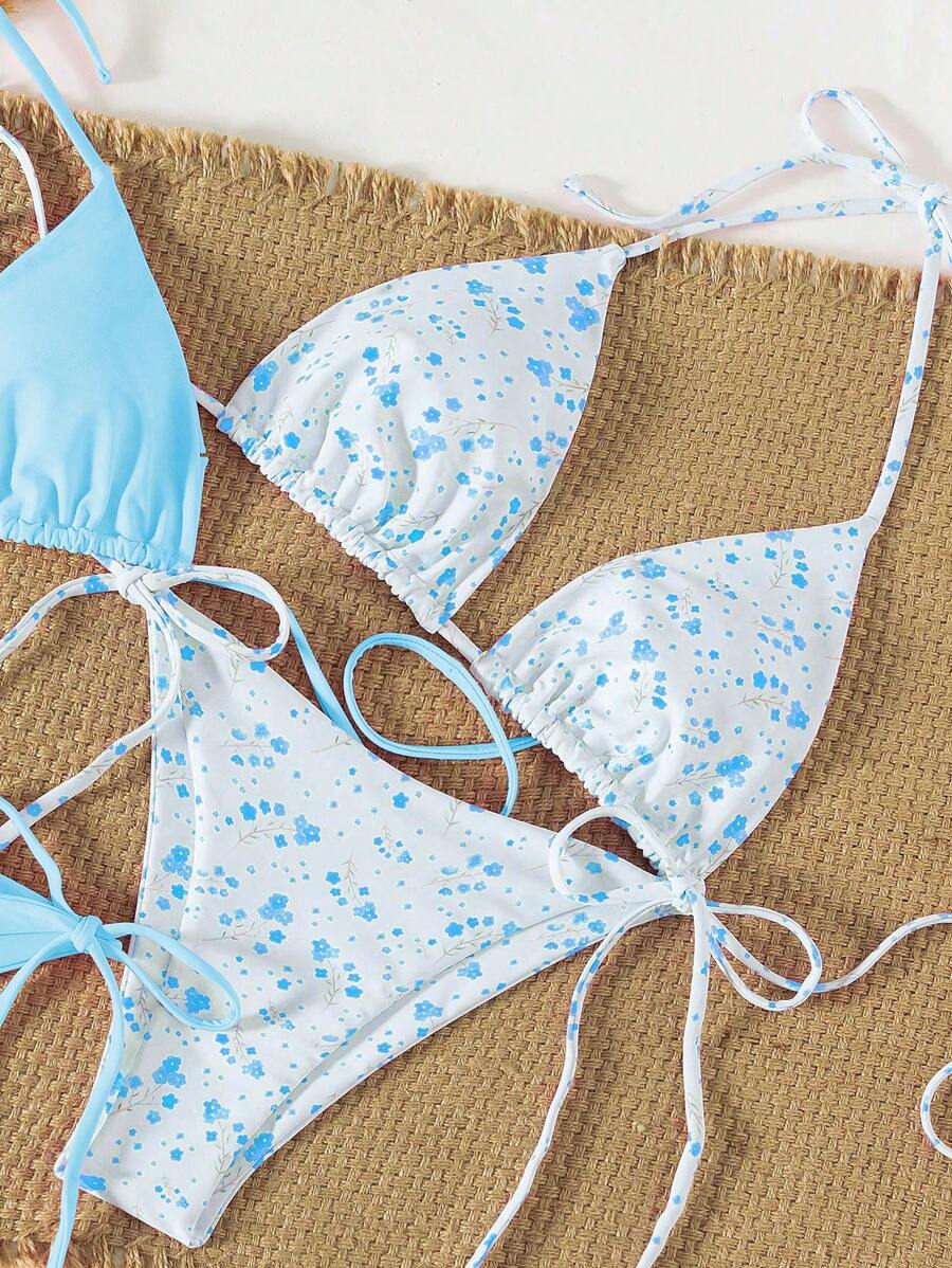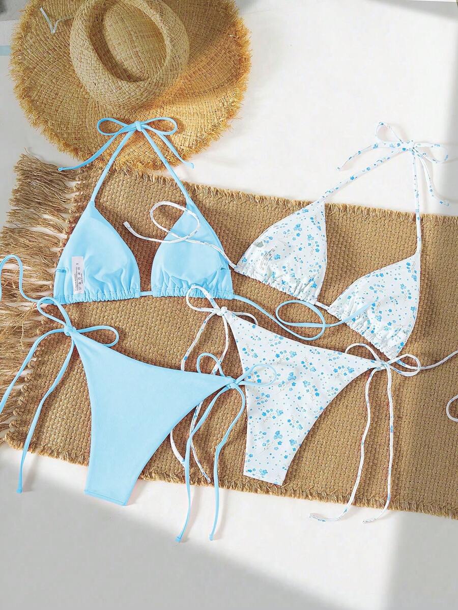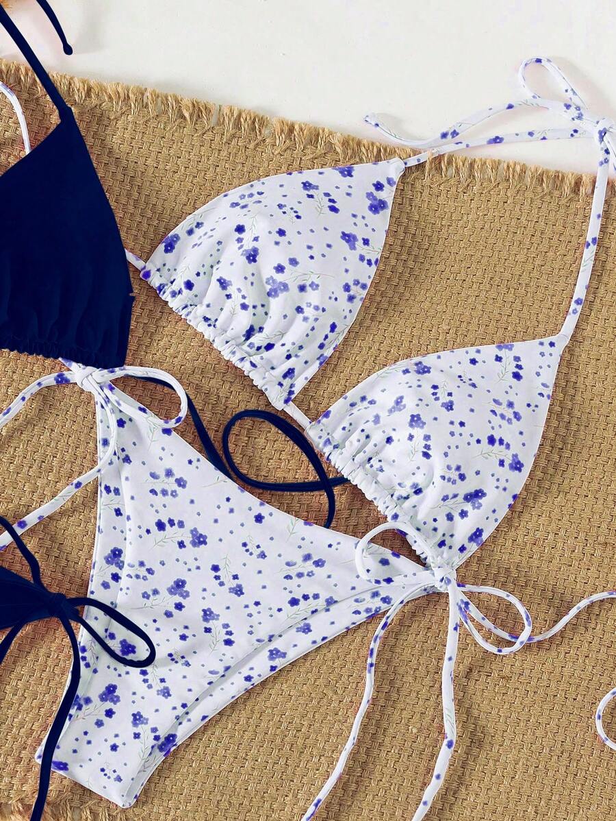 Conjunto de 2 piezas bikini de cuello de halter con estampado floral diminuto para mujer, traje de bano para vacaciones en la playa