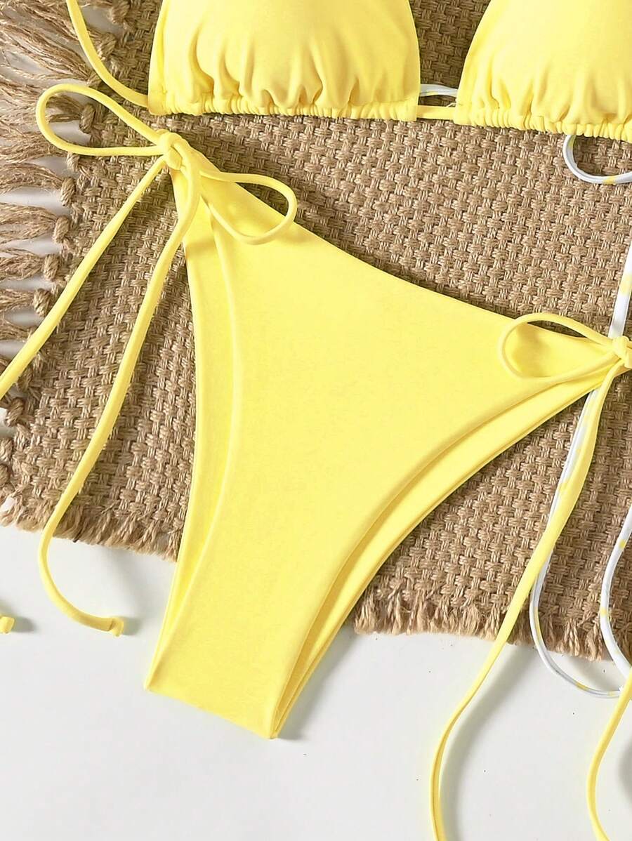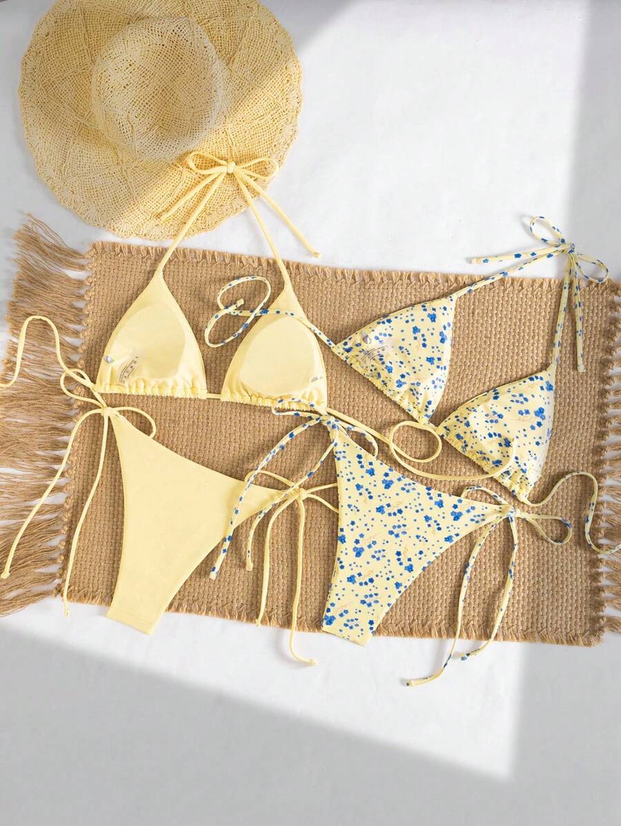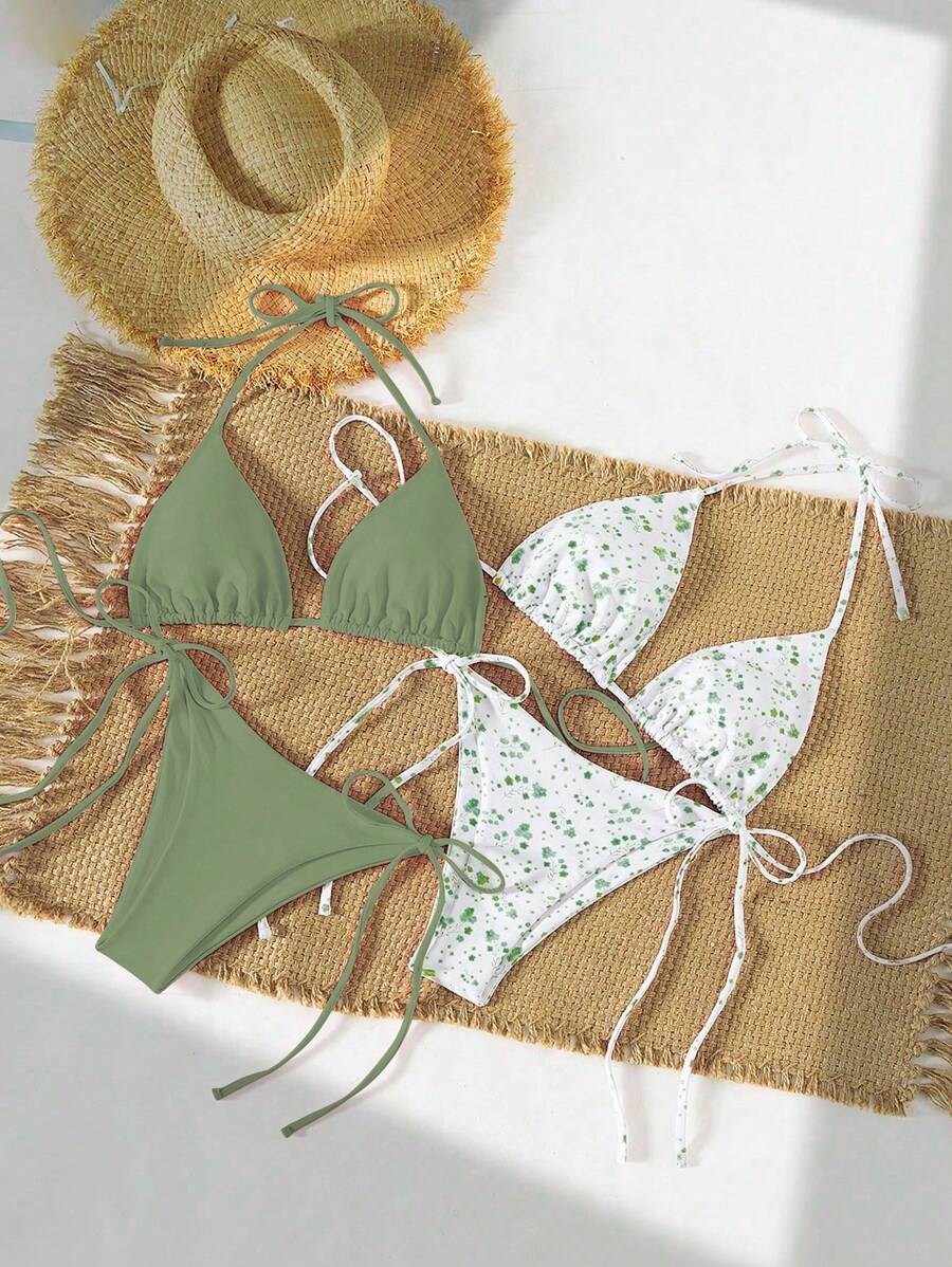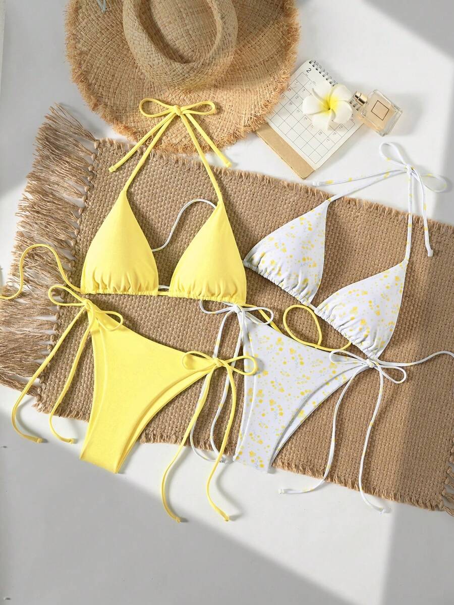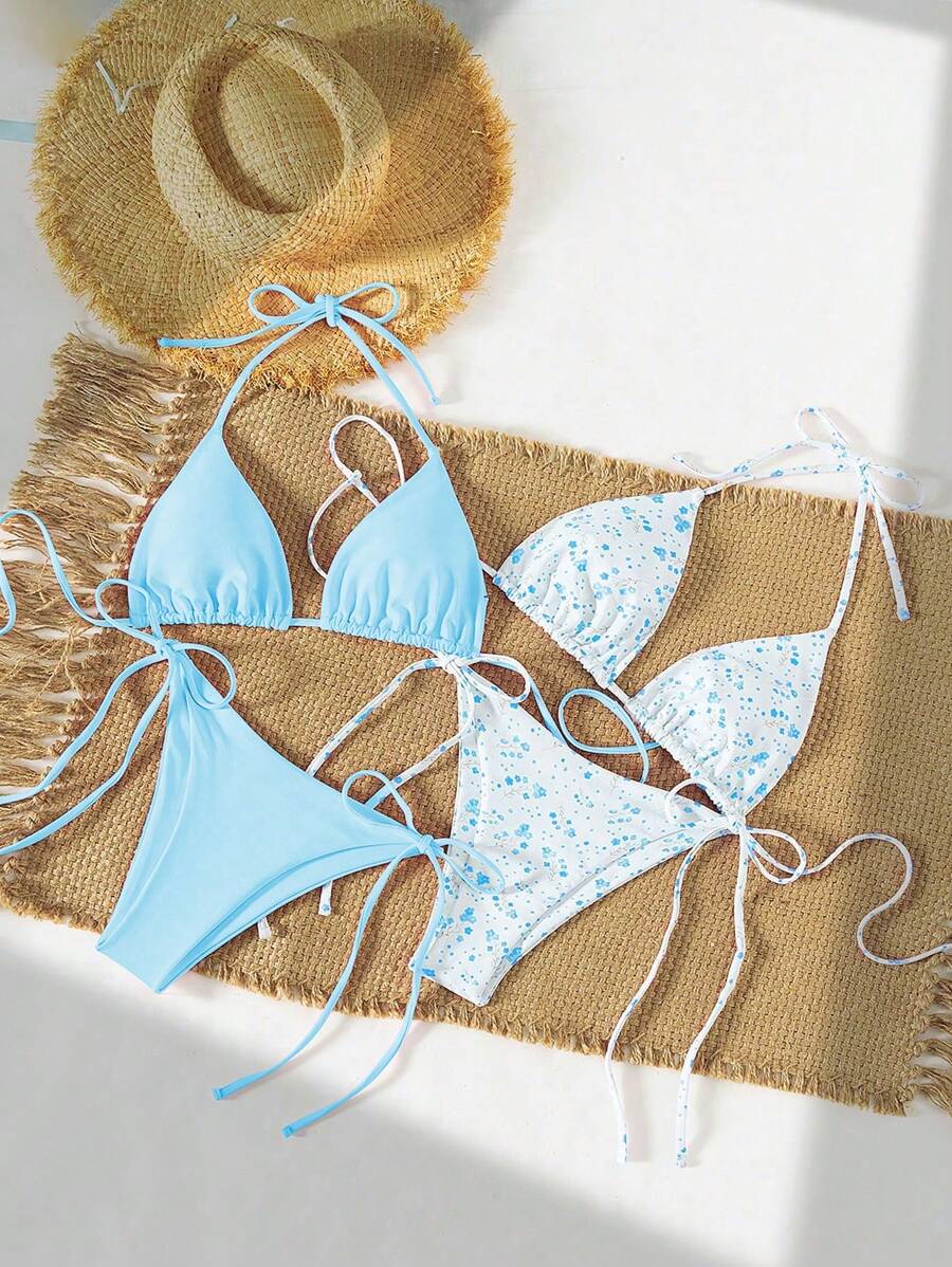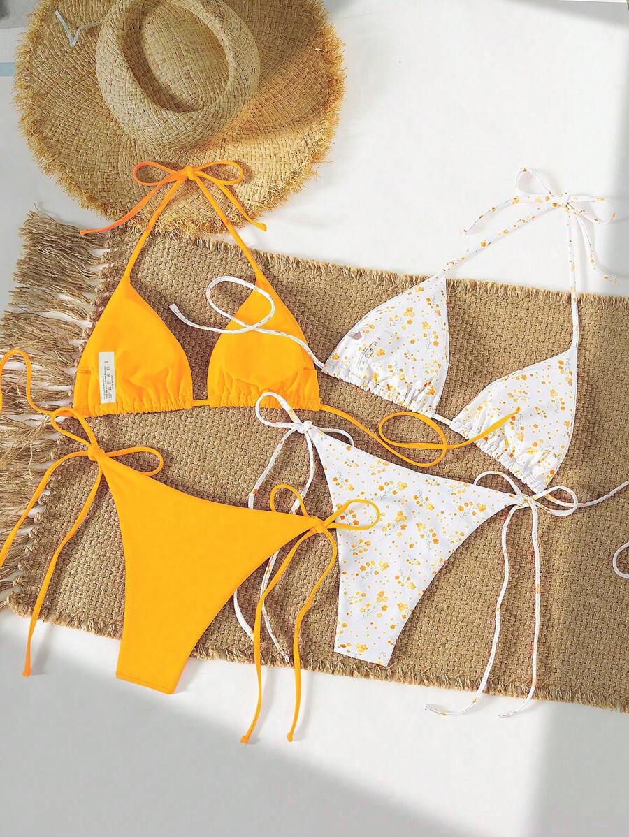 Conjunto de 2 piezas bikini de cuello de halter con estampado floral diminuto para mujer, traje de bano para vacaciones en la playa