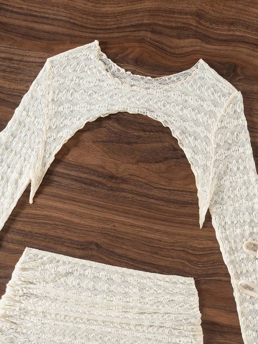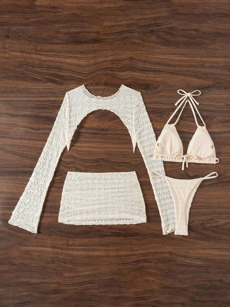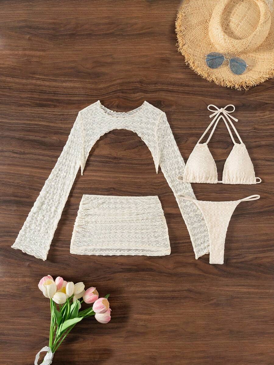 Conjunto de 4 piezas de ropa de playa para mujer: top de bikini halter sin espalda de encaje de manga larga, tanga de bikini, cubre todo de manga larga, minifalda de encaje