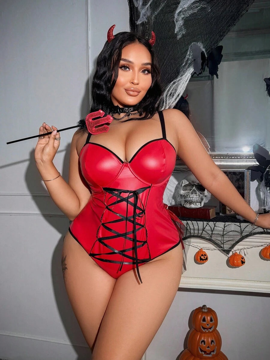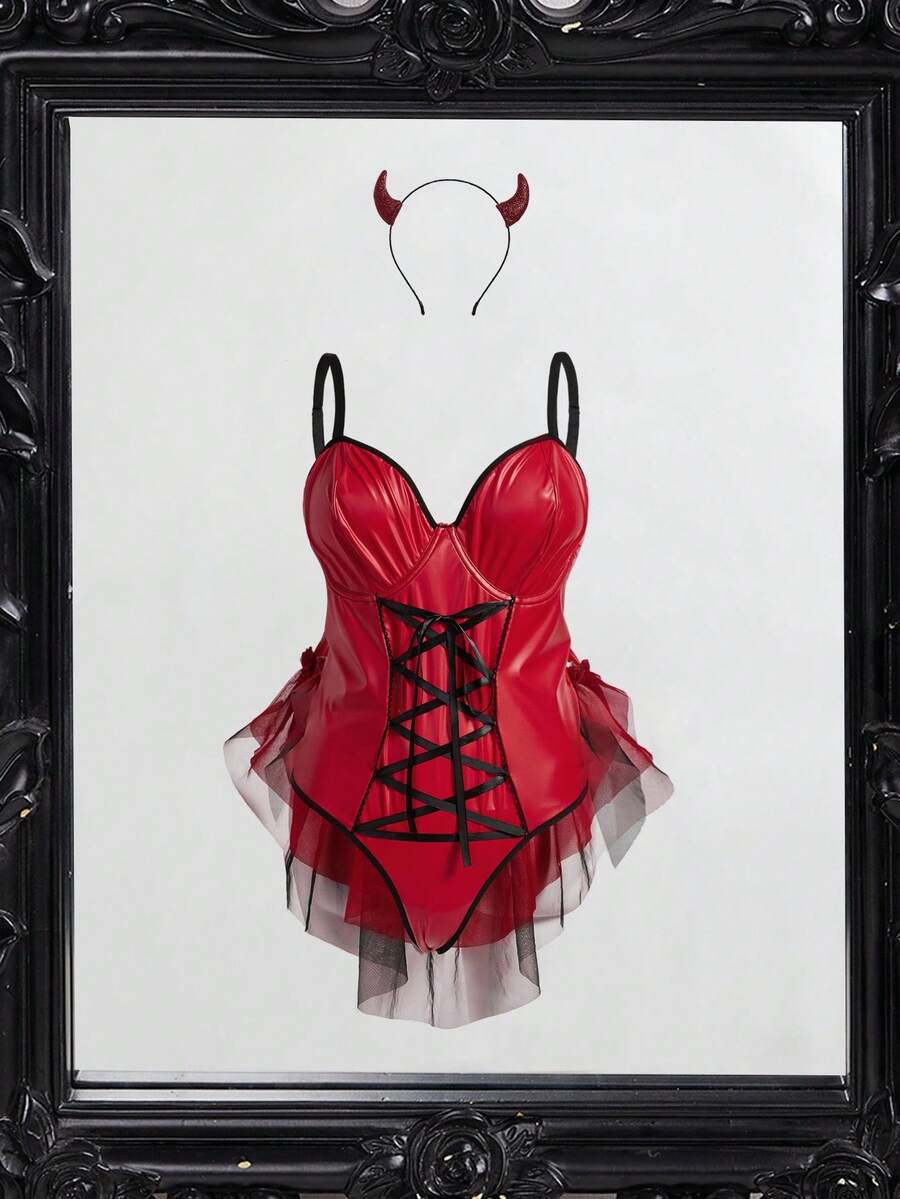 Fantasy costume 2 piezas lenceria sexy con diseno de cruce de encaje estilo diablo, con aros, paneles adelgazantes, volantes en el bajo y contraste de color, lenceria sexy sin entrepierna para cosplay, disfraz de fiesta de halloween, festival de musica,