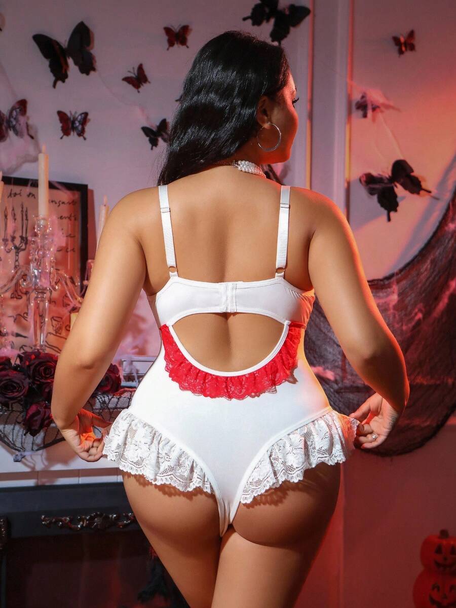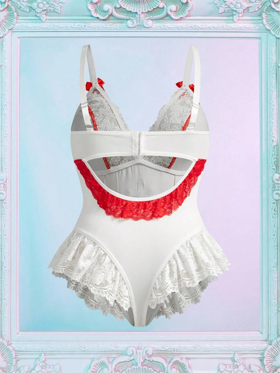 Fantasy costume disfraz de enfermera sexy de talla grande con parches de encaje, ribete de volantes, contraste de color, acento de lazo, enterizo lindo y estilizador para halloween