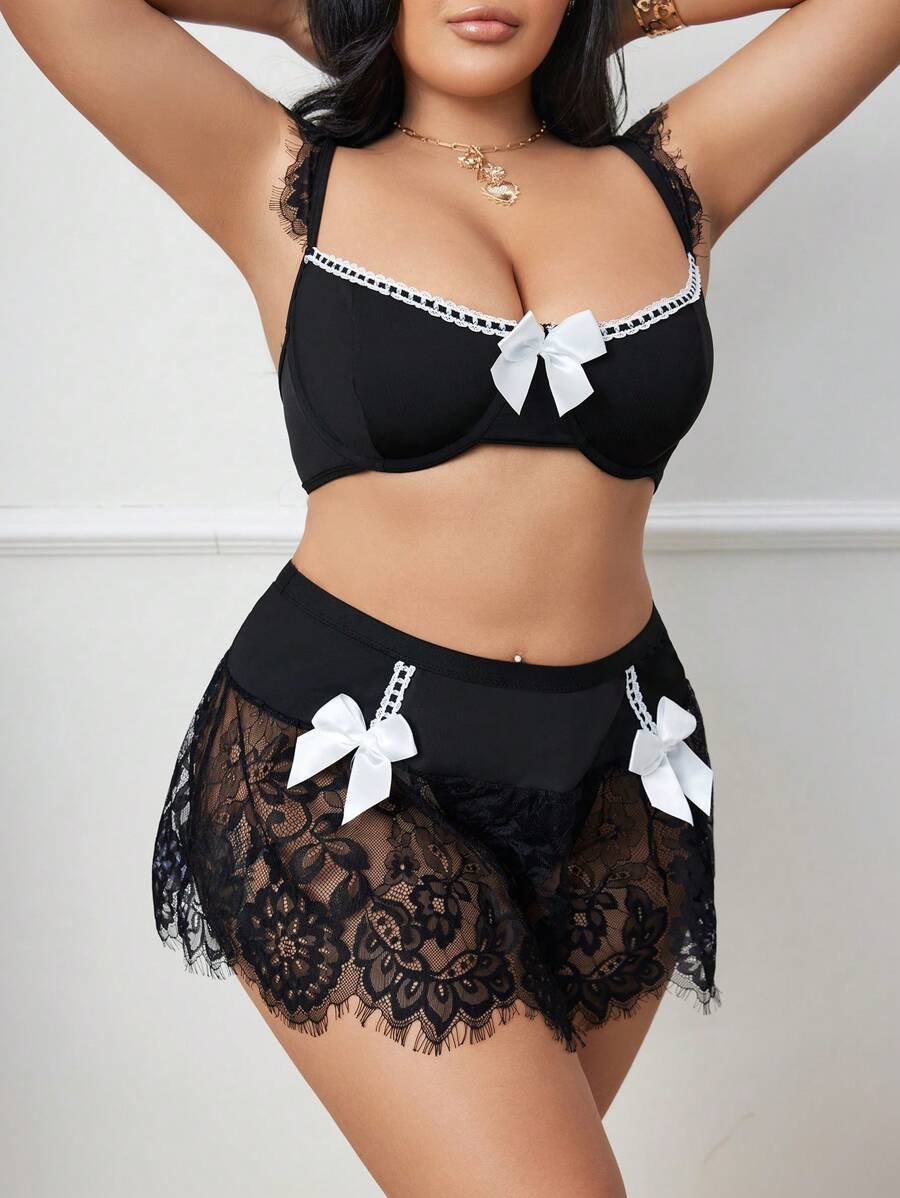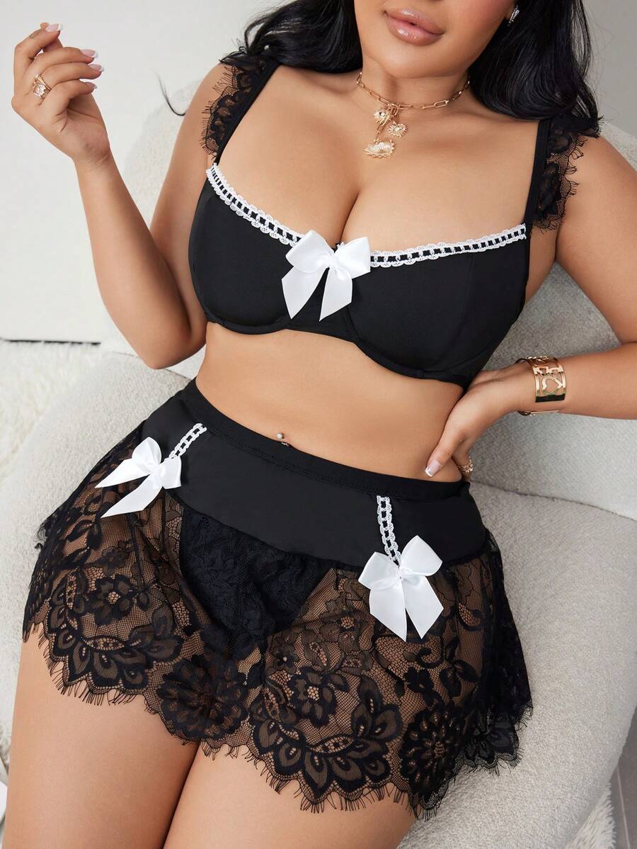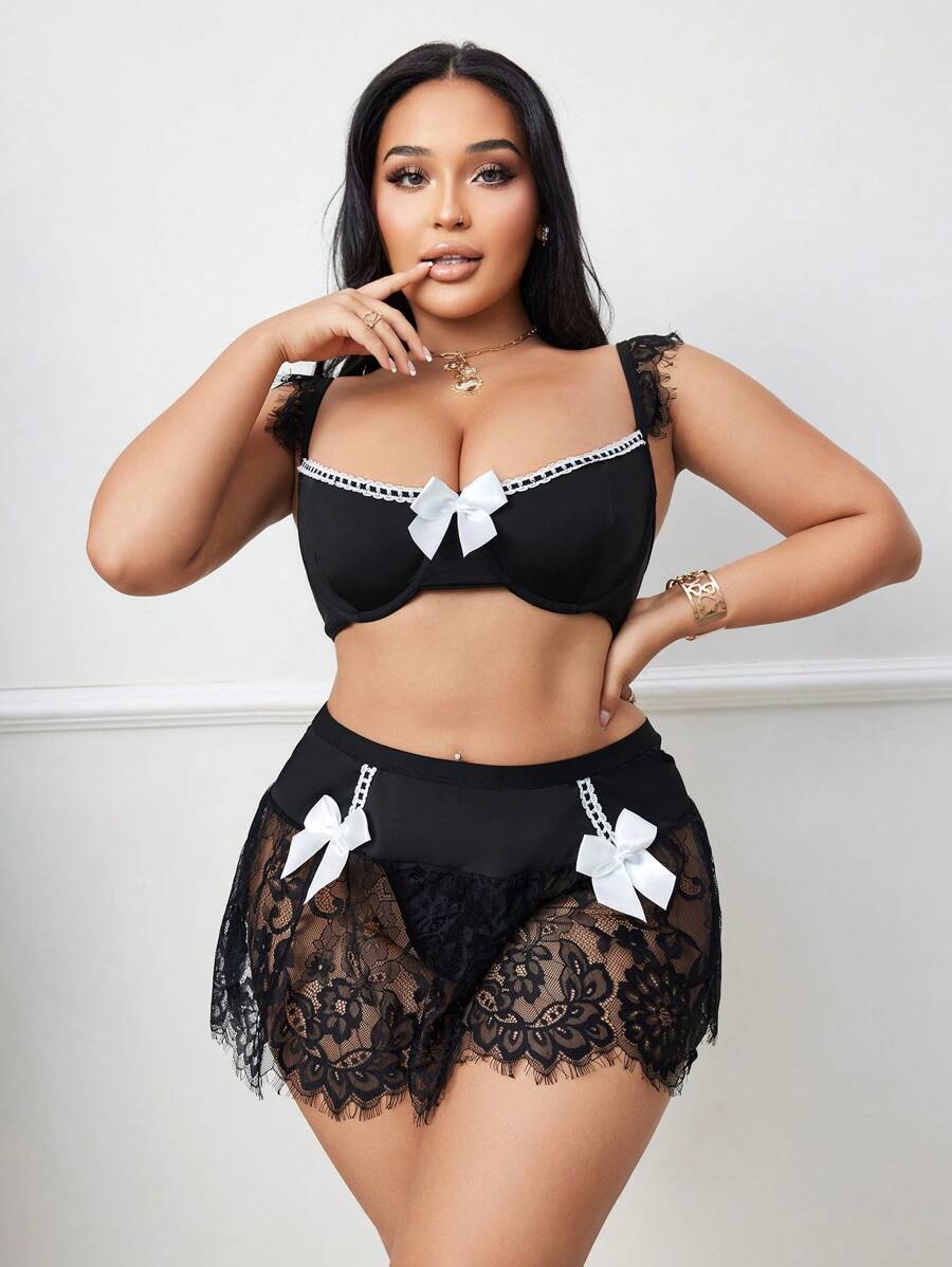 Conjunto de 3 piezas de talla grande con vestido de encaje y parches – Muy Bonita