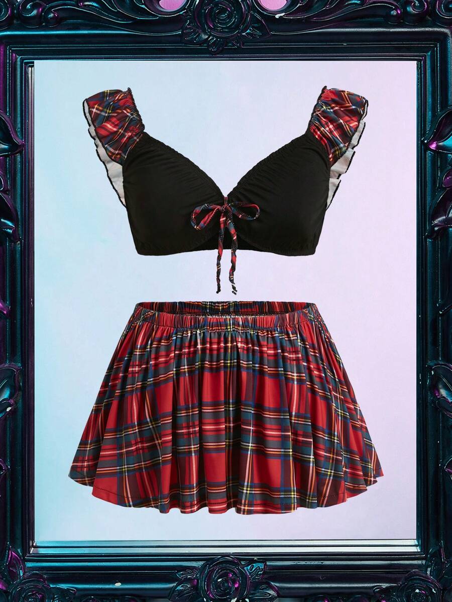 Fantasy costume conjunto lencero sexy de 3 piezas con diseno de cuadros y cordones, talla grande para mujer