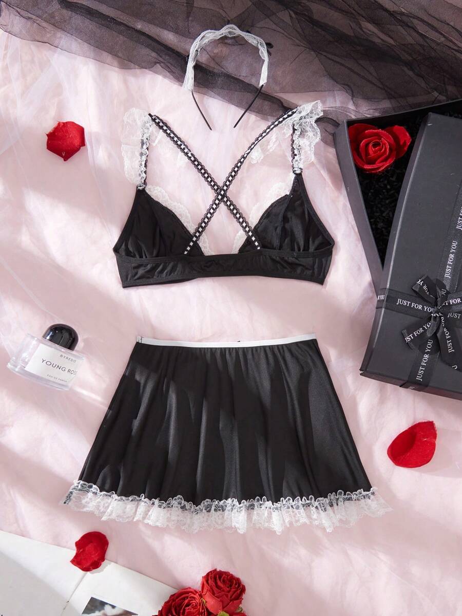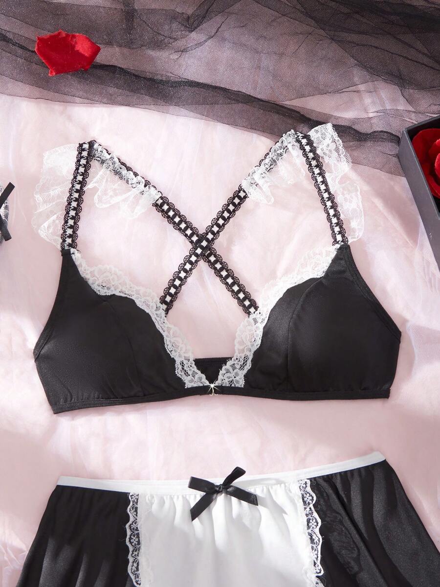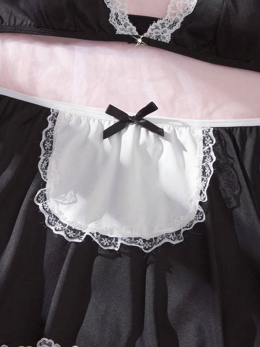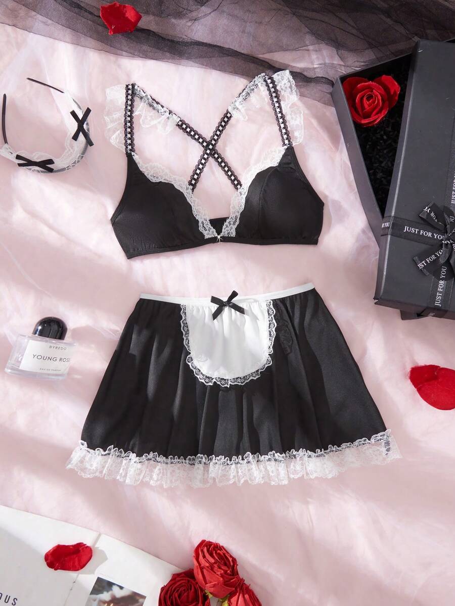 Conjunto de 3 piezas de lenceria sexy de sirvienta para mujer, en blanco y negro, con encaje, tejido y decoracion de lazo