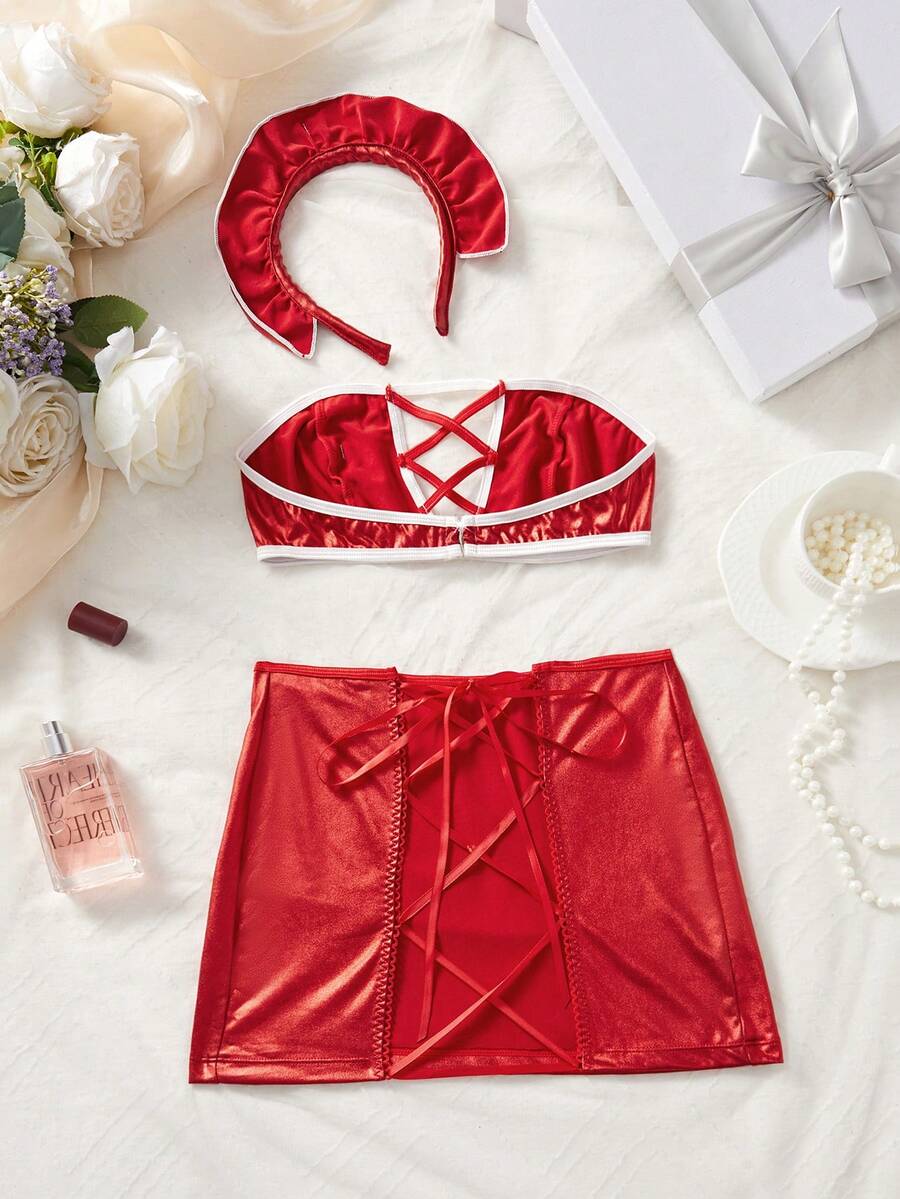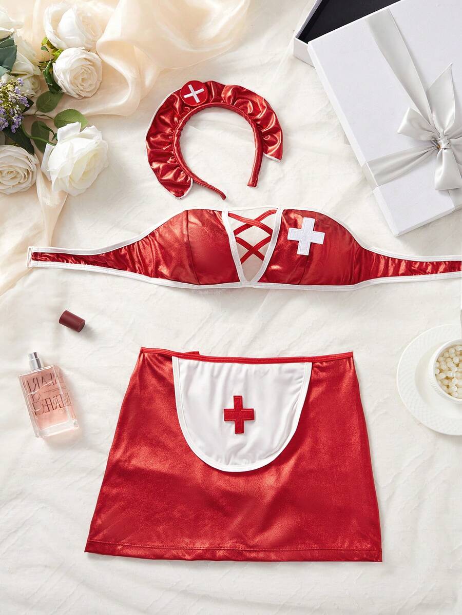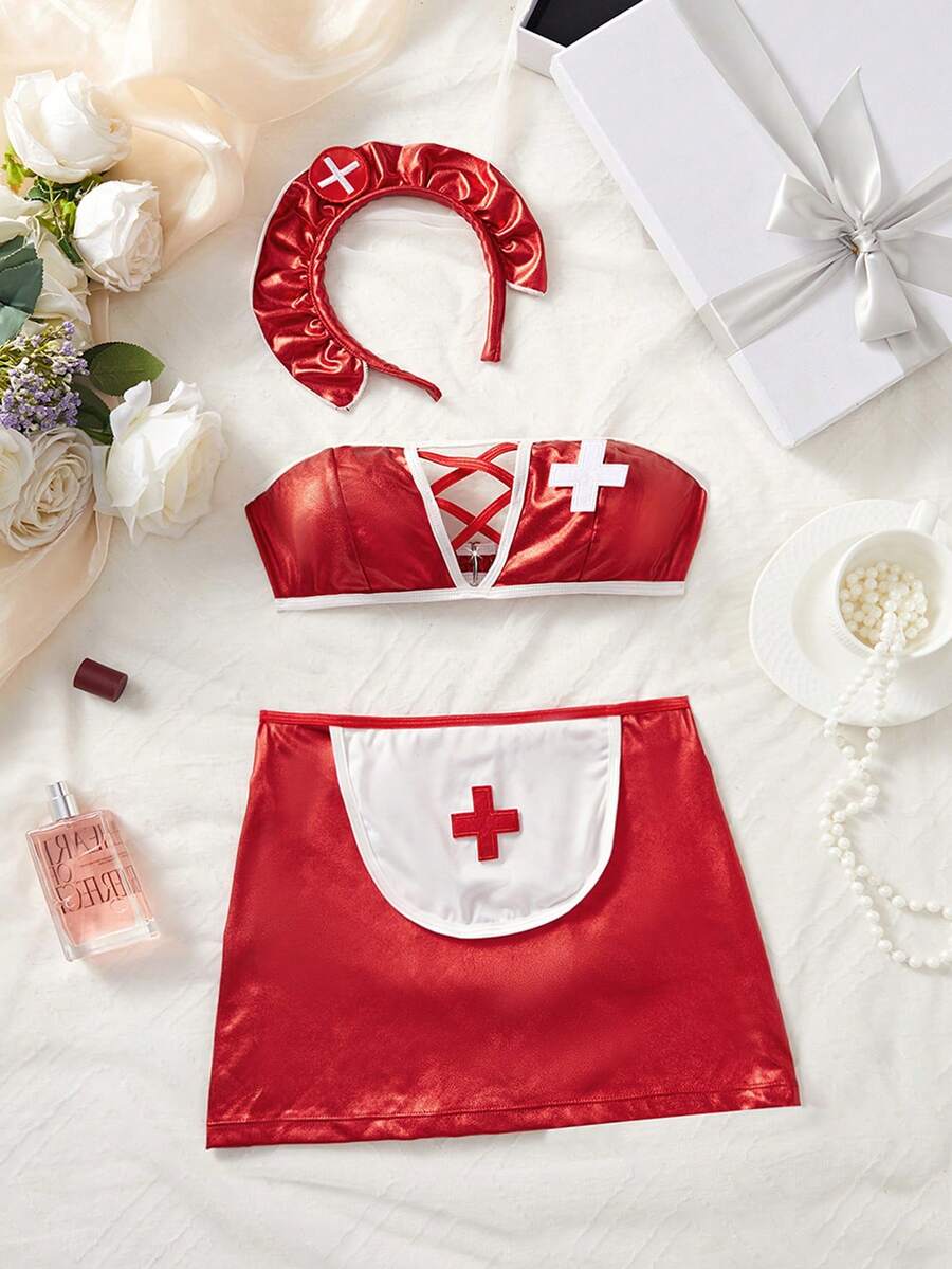Conjunto de 3 piezas de ropa interior sexy para mujer, incluye top tubo y falda corta de color rojo, con diseno calado y cordones, disfraz de enfermera