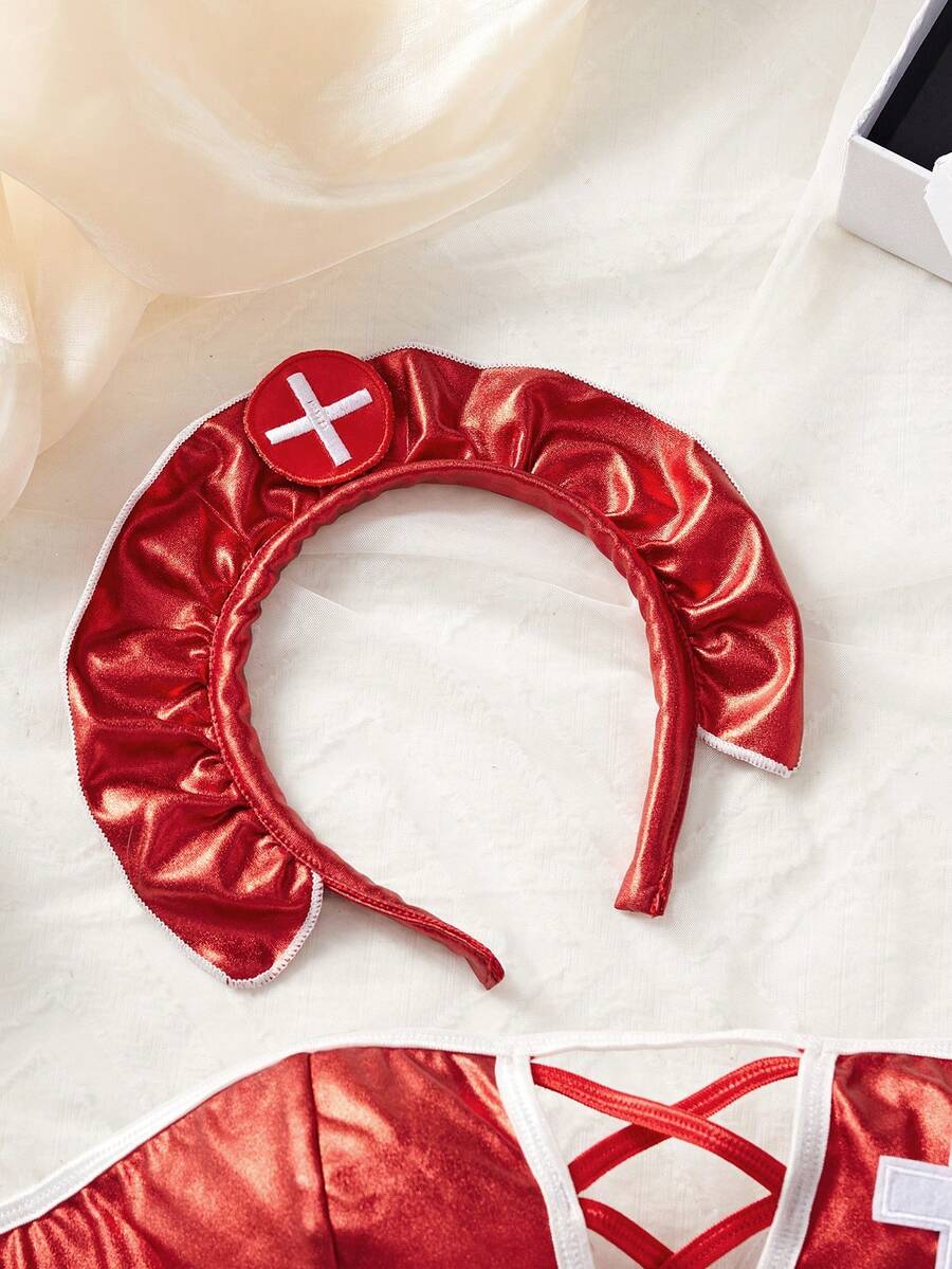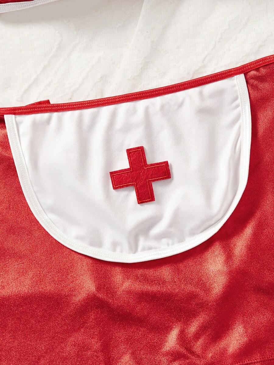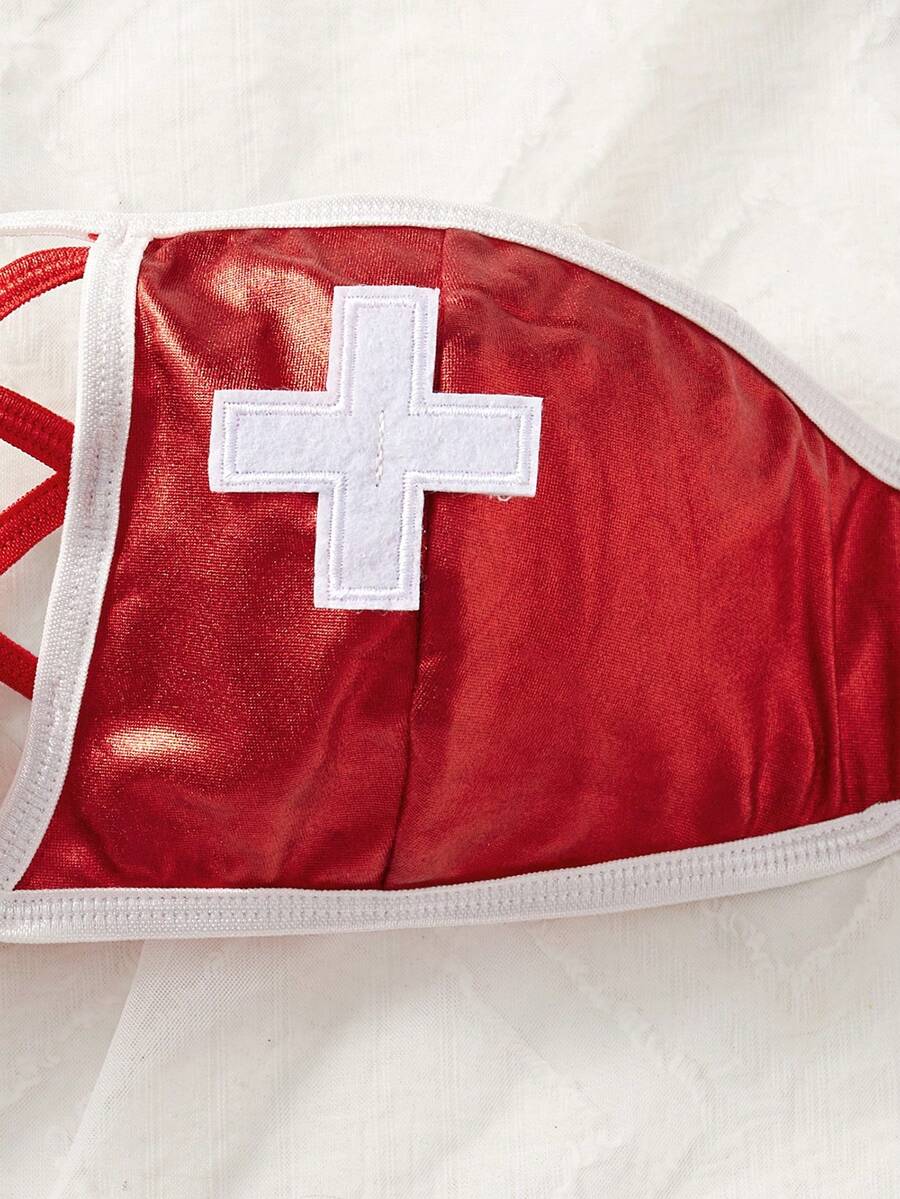 Conjunto de 3 piezas de ropa interior sexy para mujer, incluye top tubo y falda corta de color rojo, con diseno calado y cordones, disfraz de enfermera
