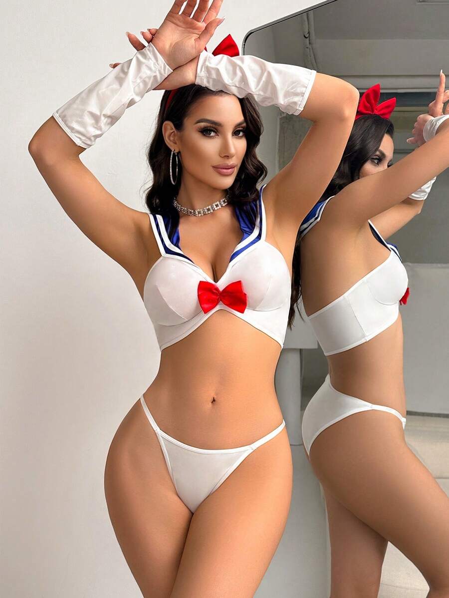 Lenceria femenina con contraste de color semi transparente y decoracion de lazo sensual