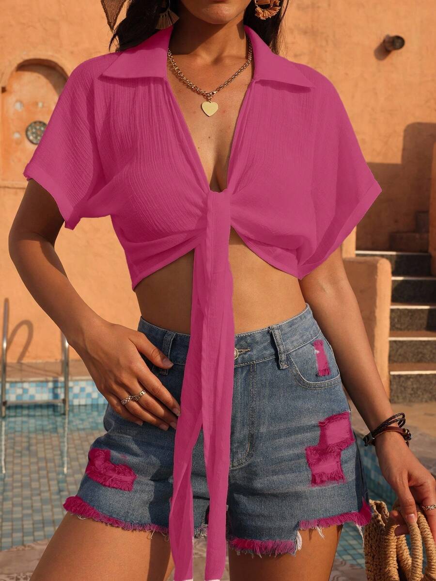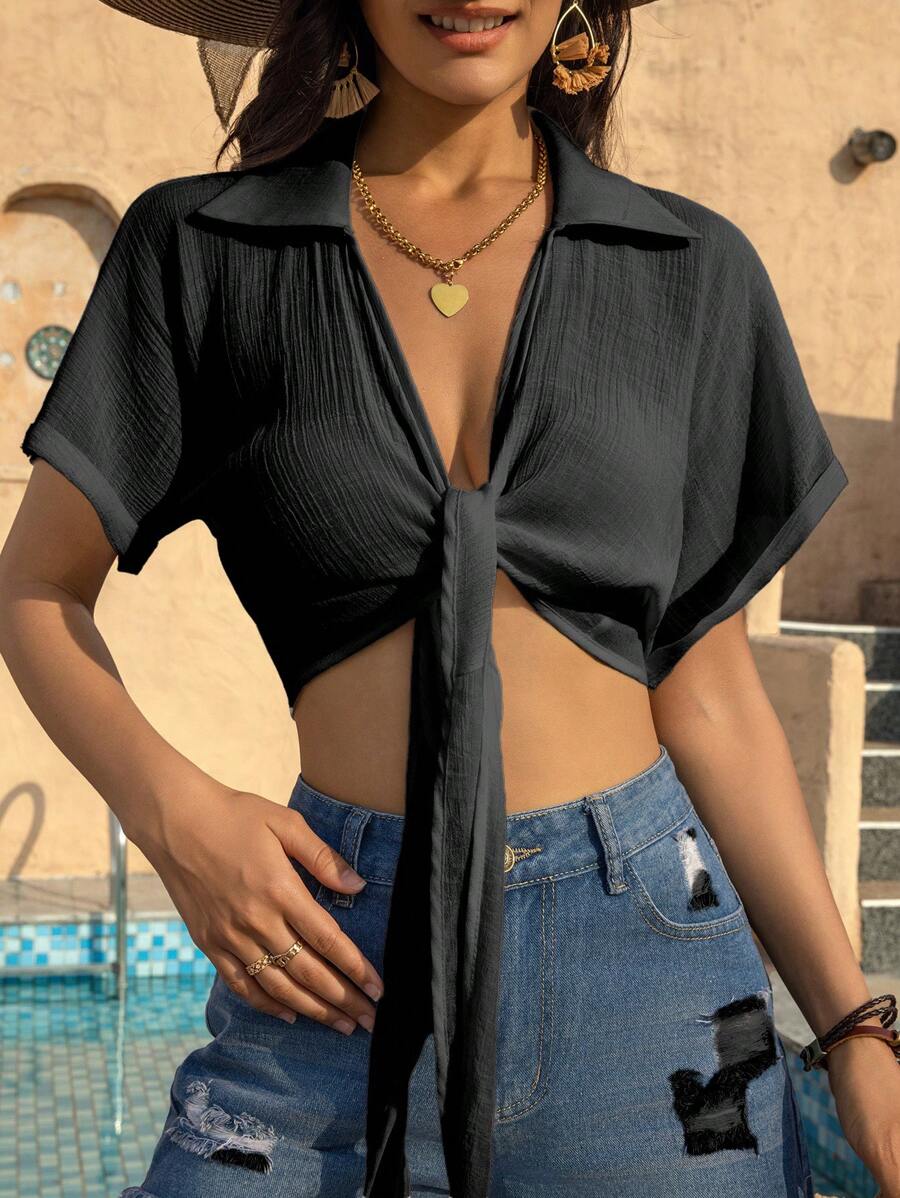 Camisola tipo kimono para mujer con manga murcielago de color solido y detalle de nudo delantero