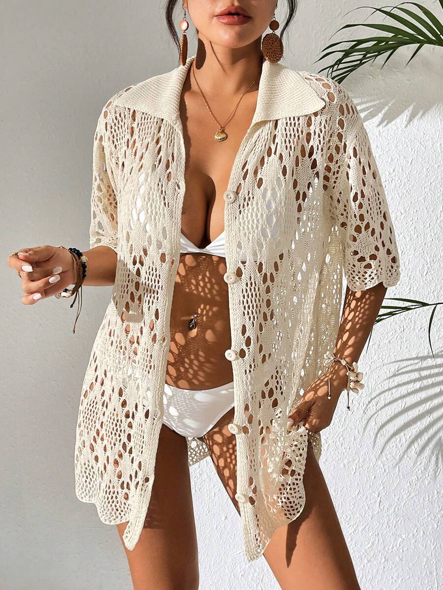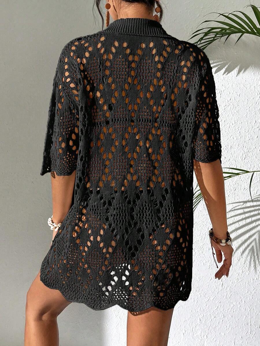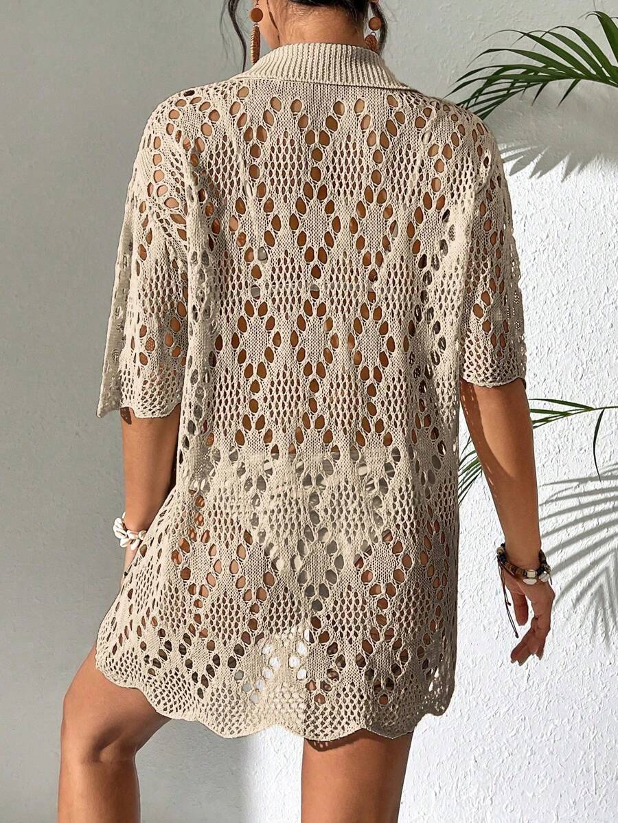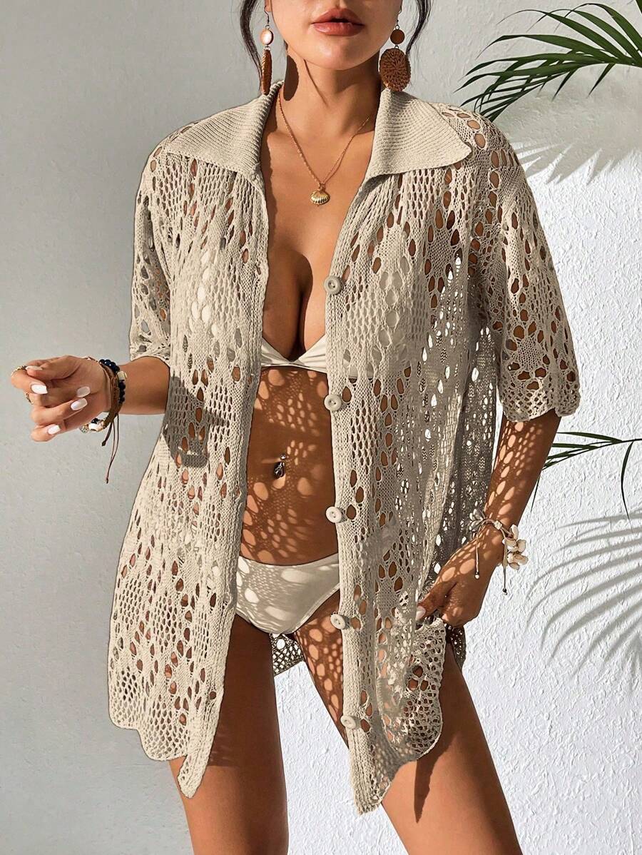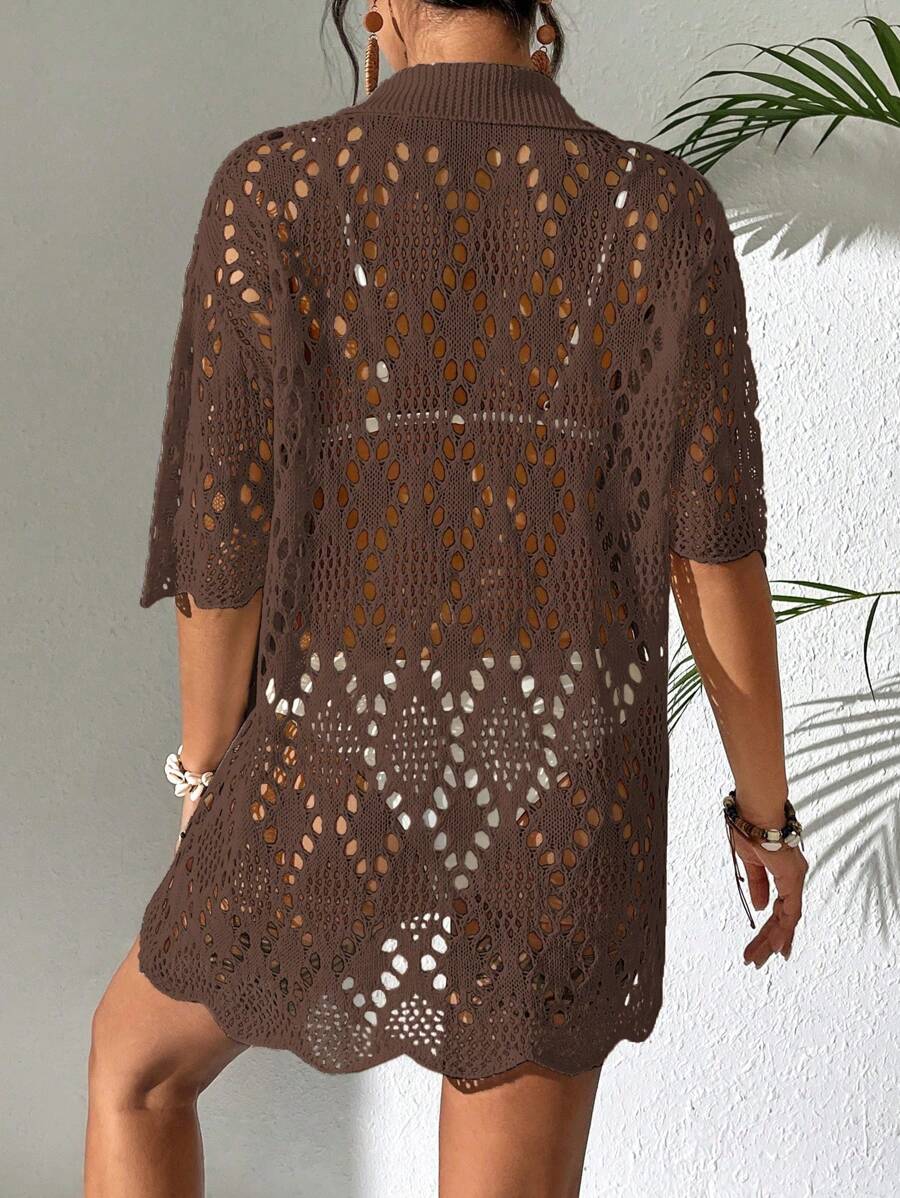 Kimono de cubrir de unicolor con mangas cortas y abotonadura sencilla con calados para mujer, para vacaciones
