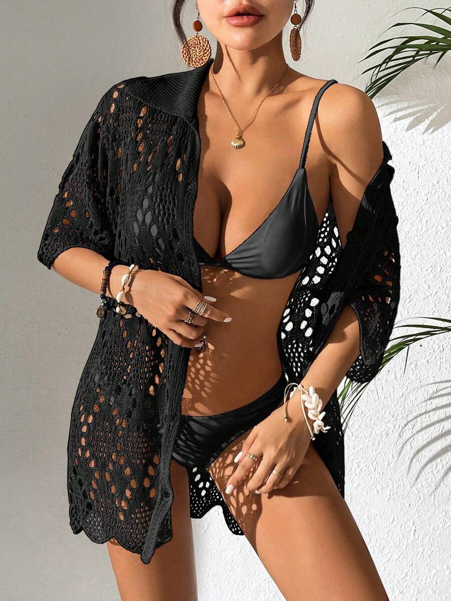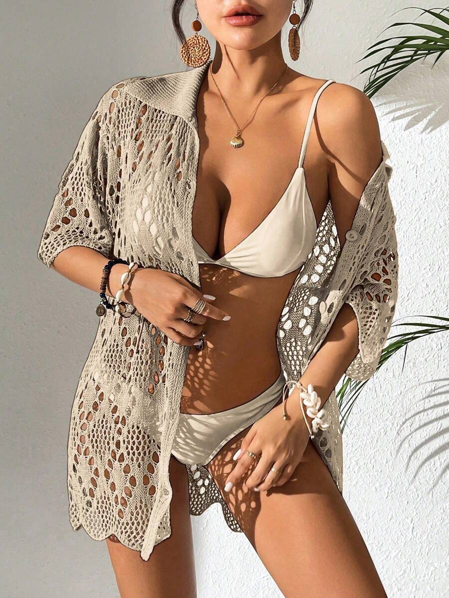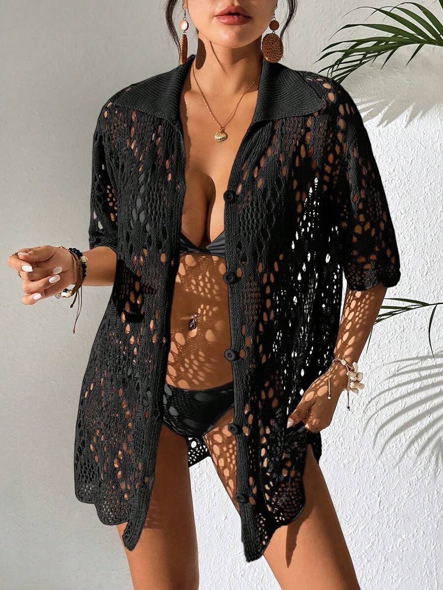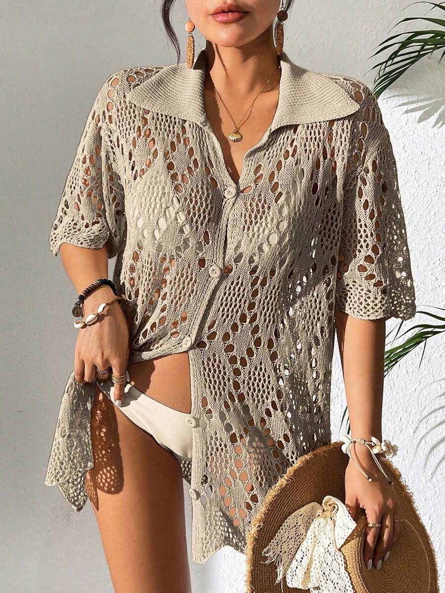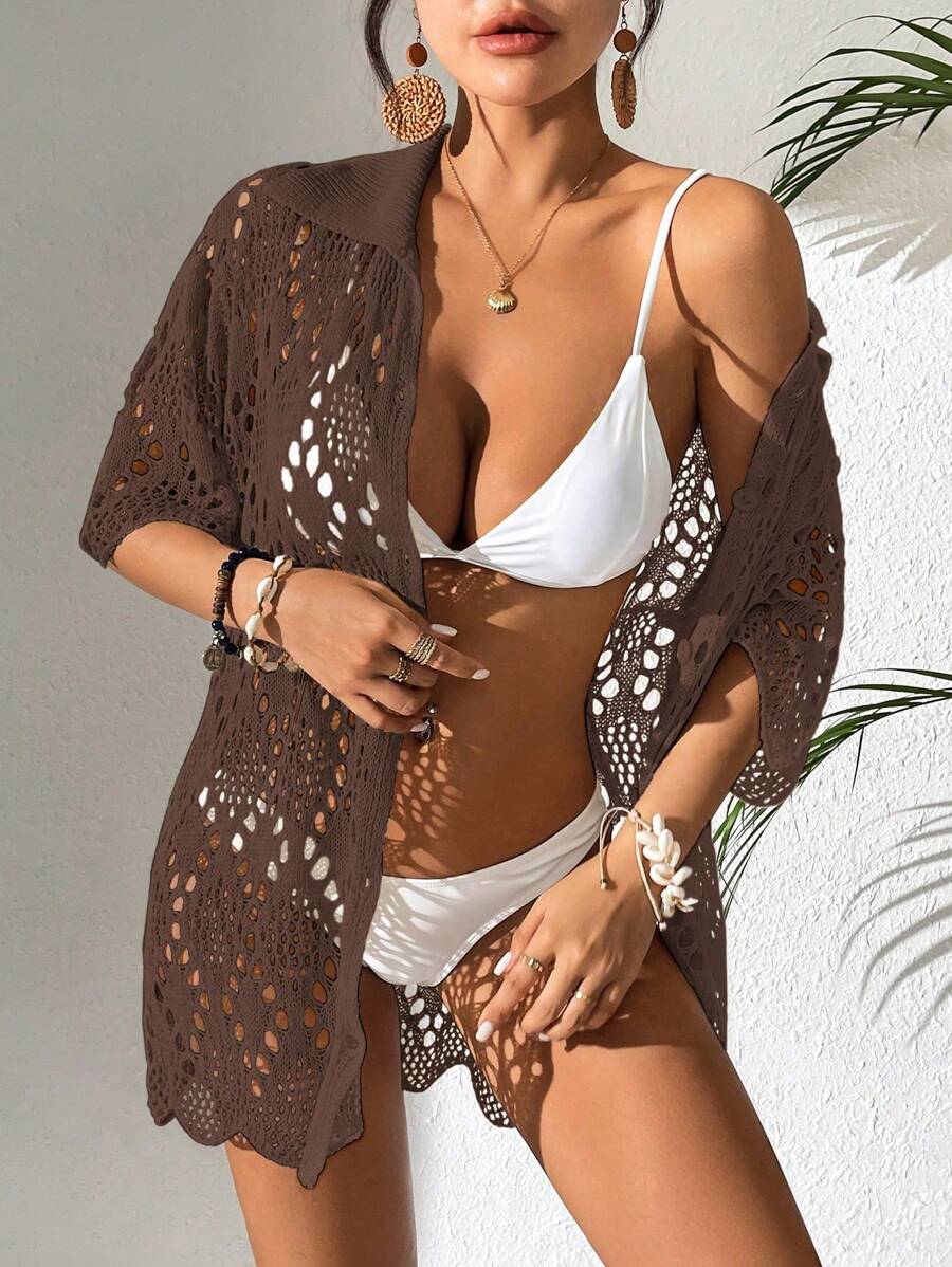 Kimono de cubrir de unicolor con mangas cortas y abotonadura sencilla con calados para mujer, para vacaciones