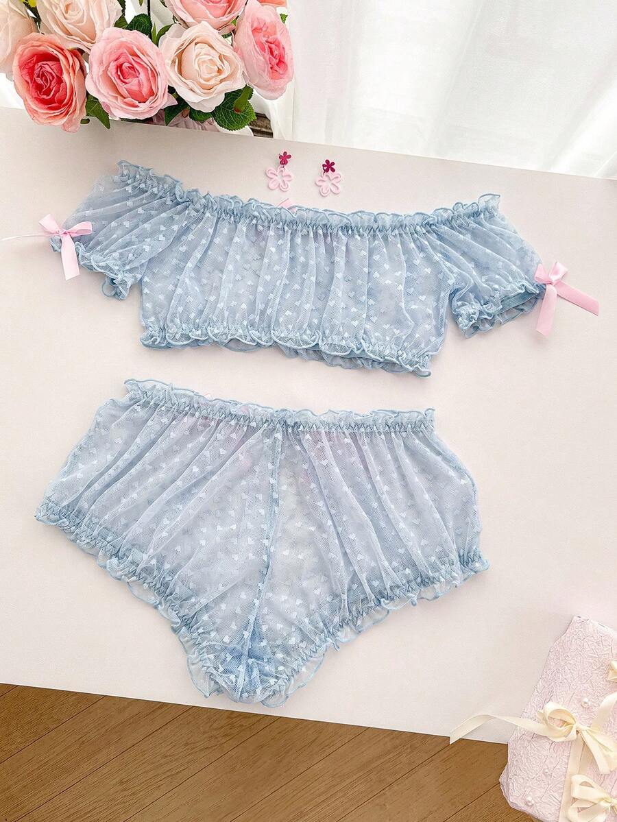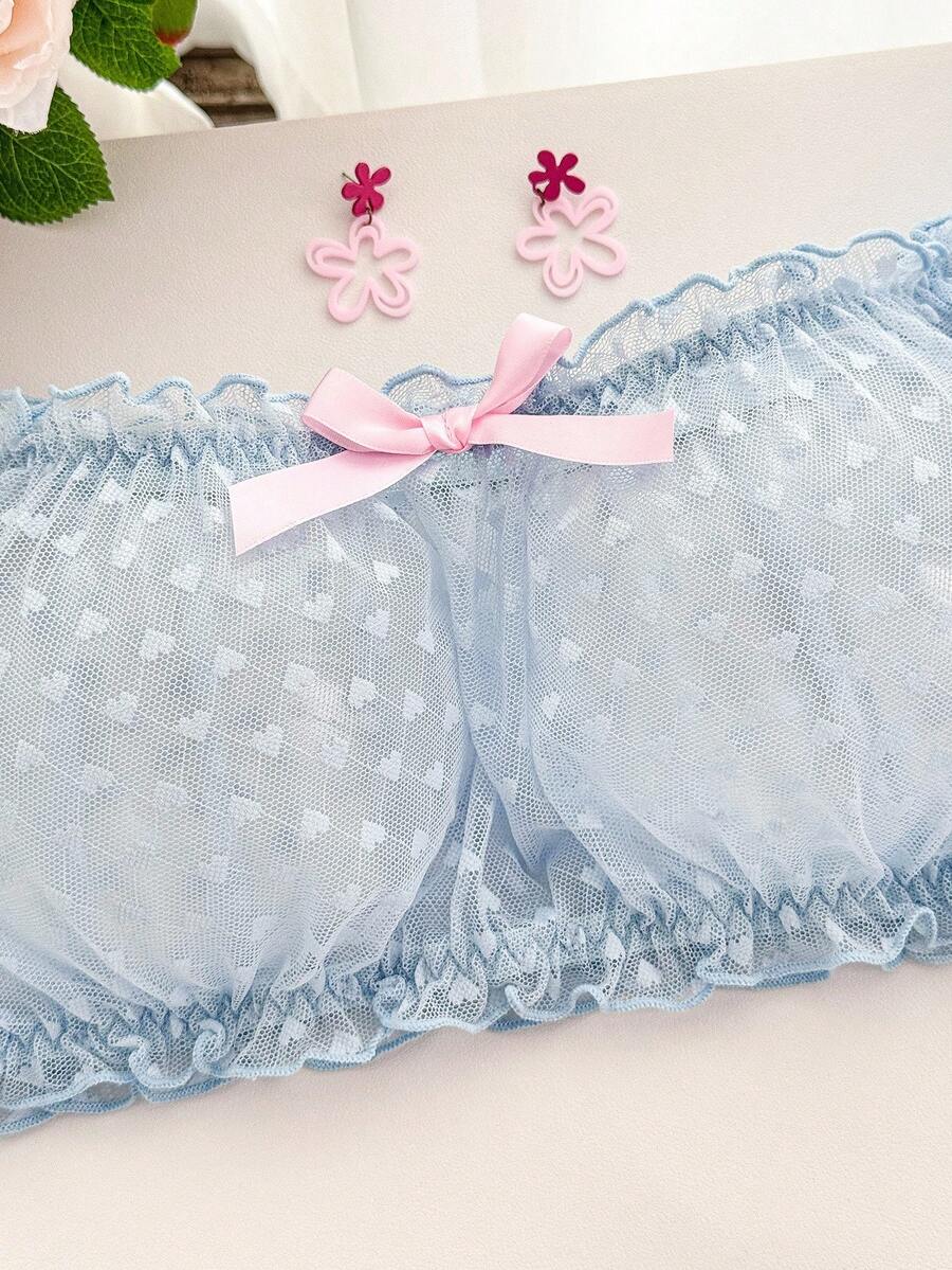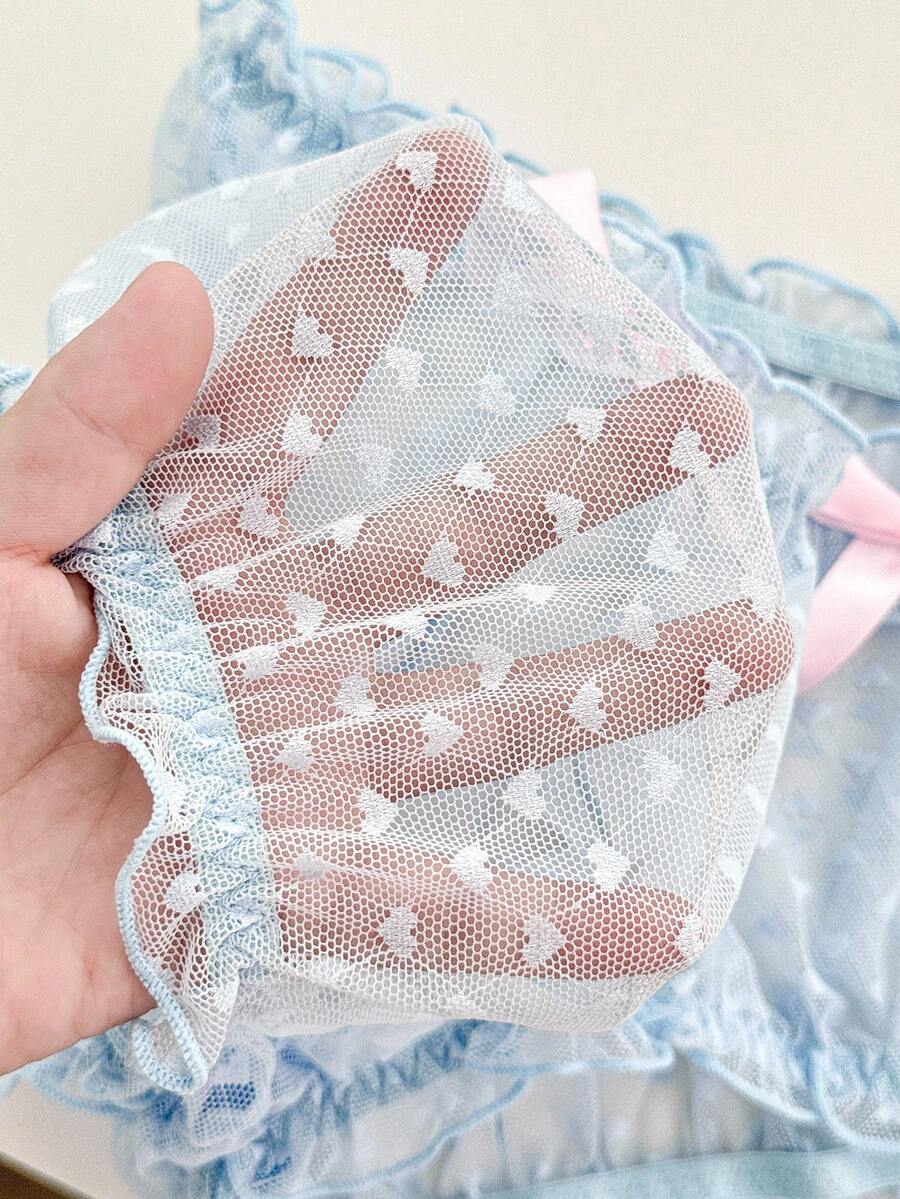 2 piezas conjunto de lenceria sexy de mujer con corazon de encaje y lazo, azul