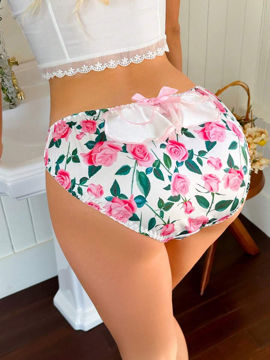 1 pieza tanga de mujer con estampado floral dulce y lindo, decoracion de lazo, ribete de volantes en forma de triangulo para el dia de san valentin