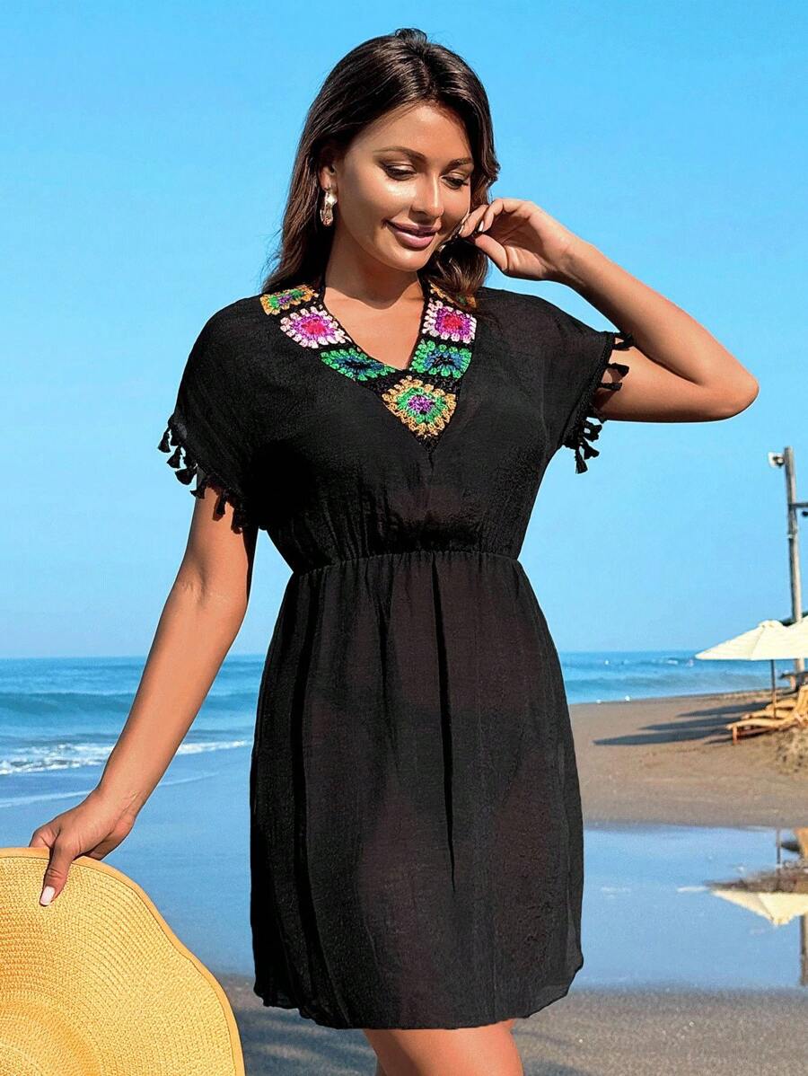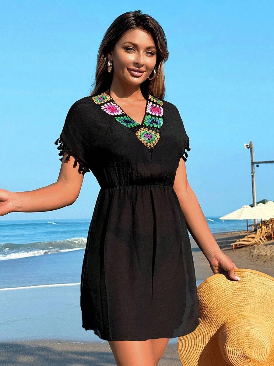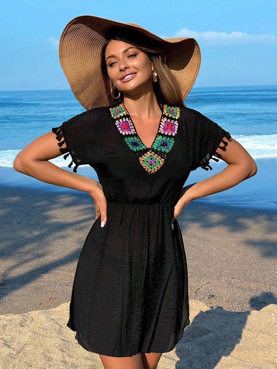 Lushoire vestido y cubrecuerpo de vacaciones con cuello en v, adorno floral colorido y abertura en la cintura para mujer
