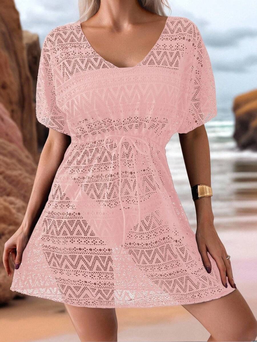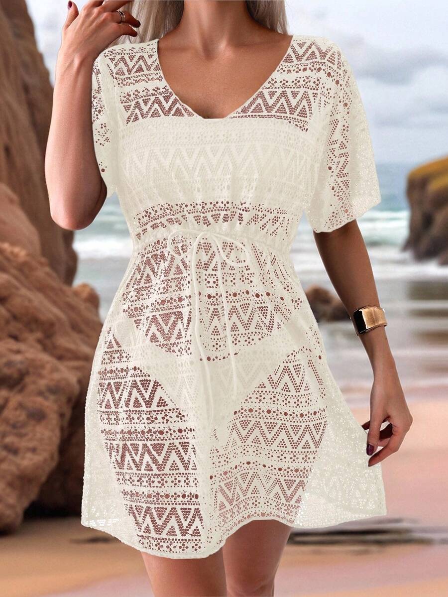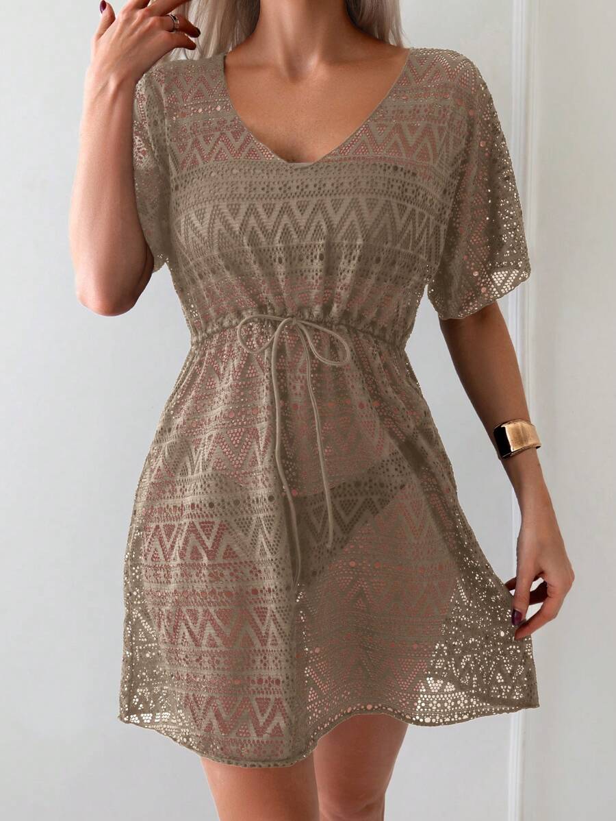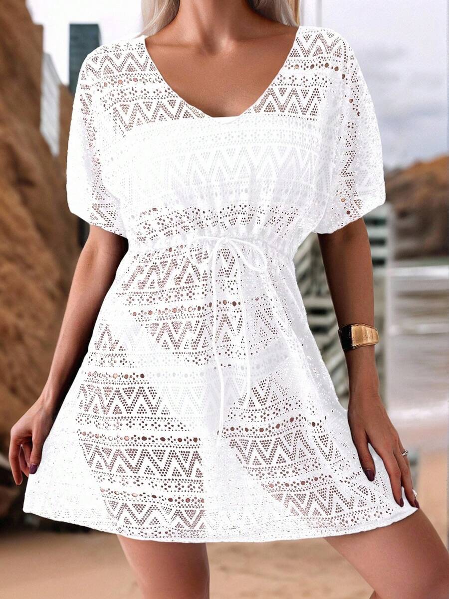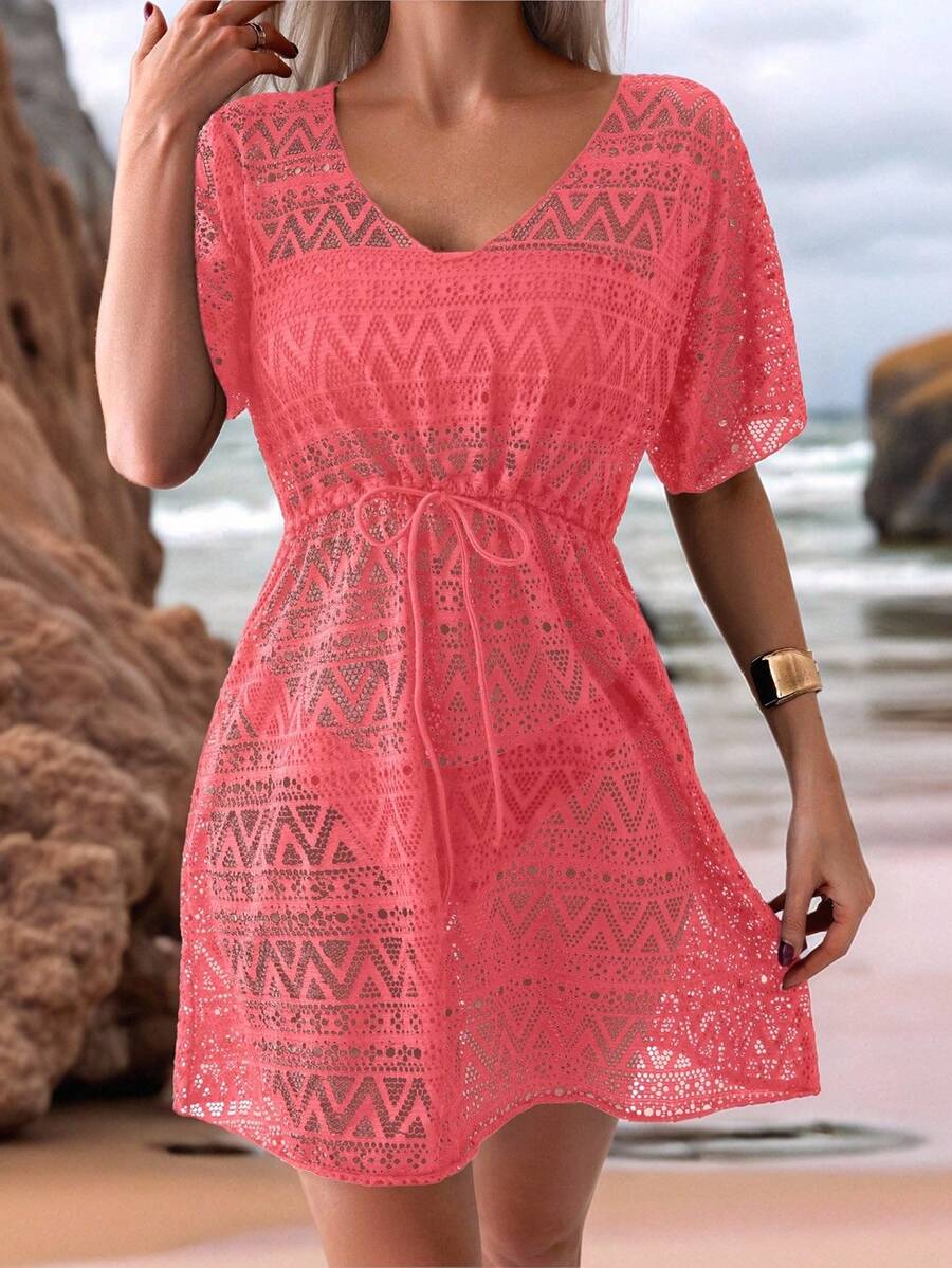 Vestido de playa para mujer con escote en v, manga corta, cintura calada y lazo