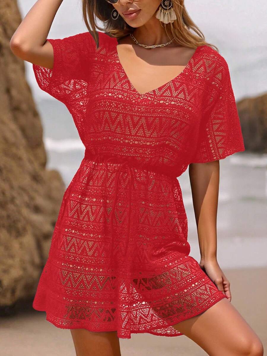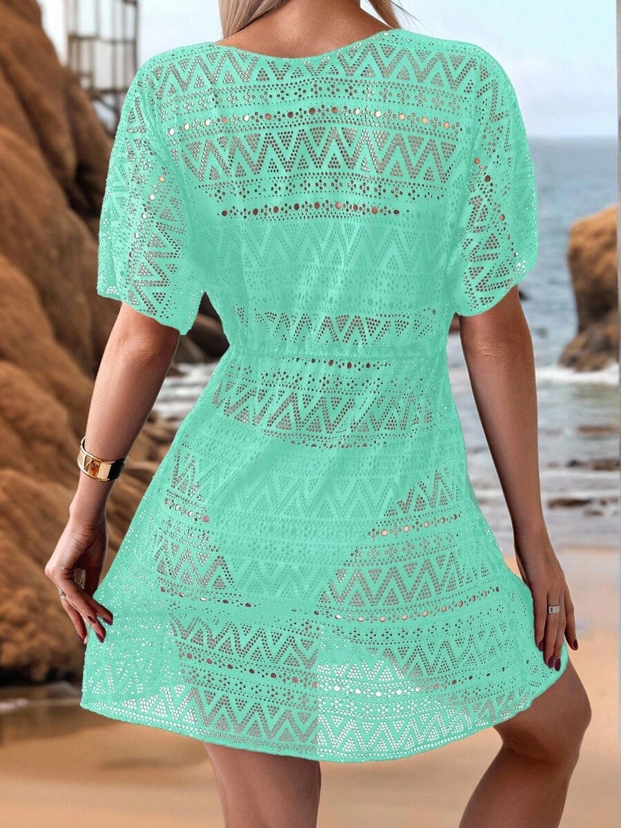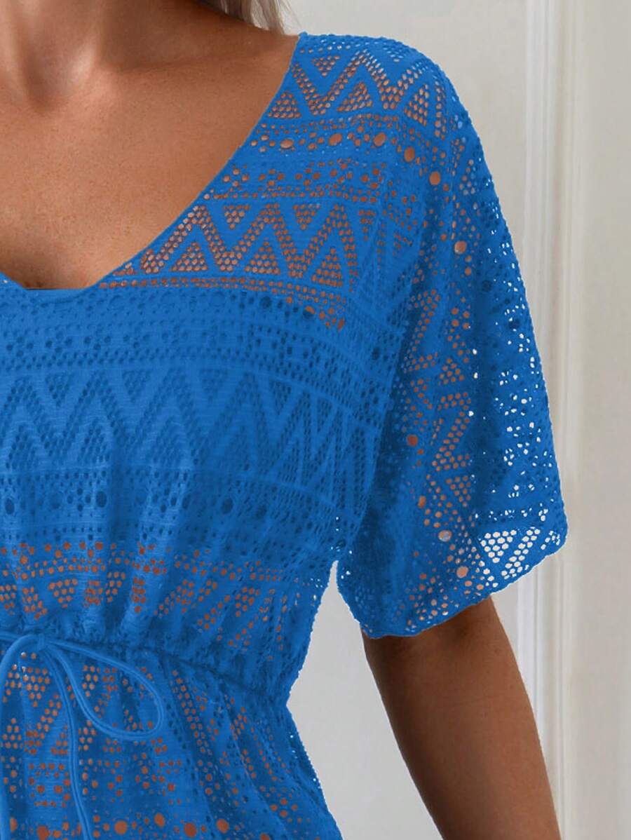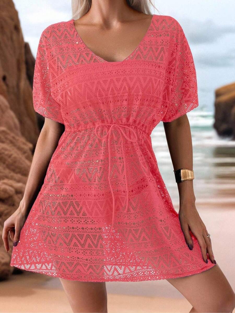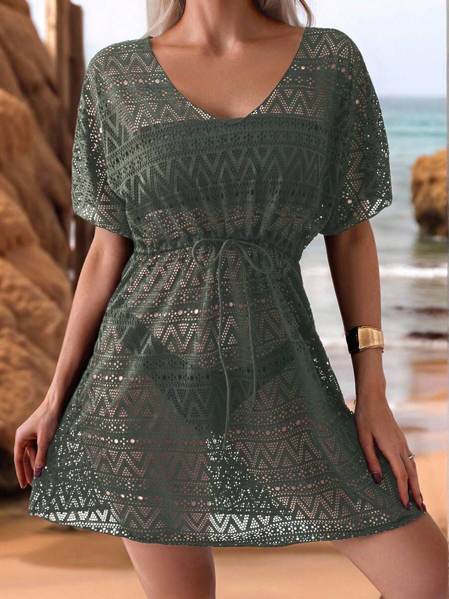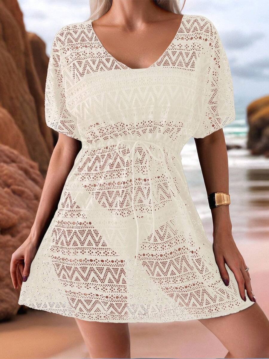 Vestido de playa para mujer con escote en v, manga corta, cintura calada y lazo