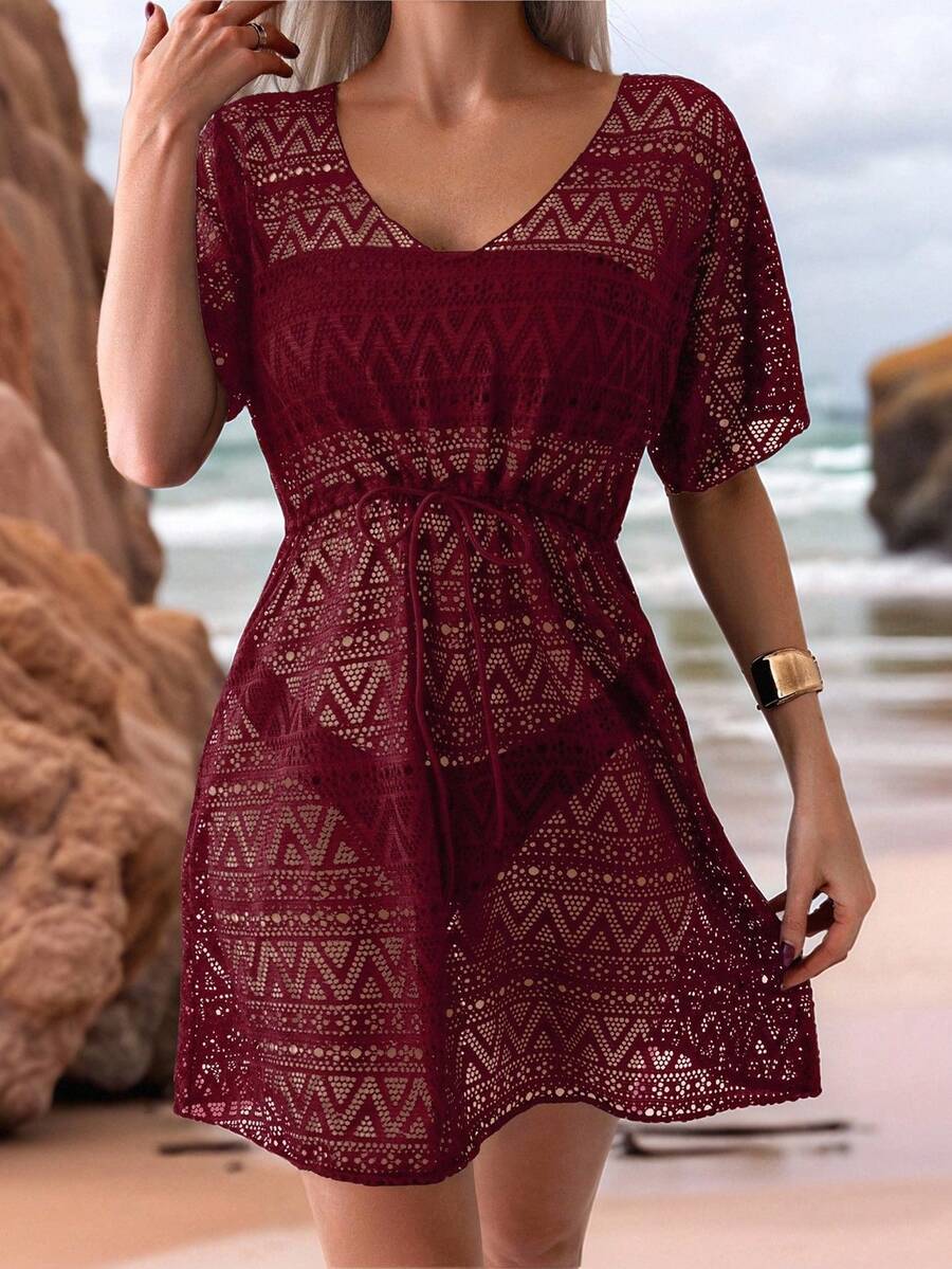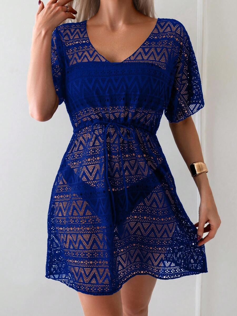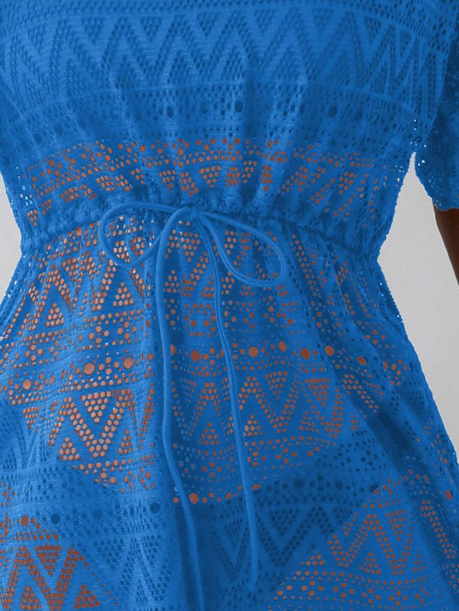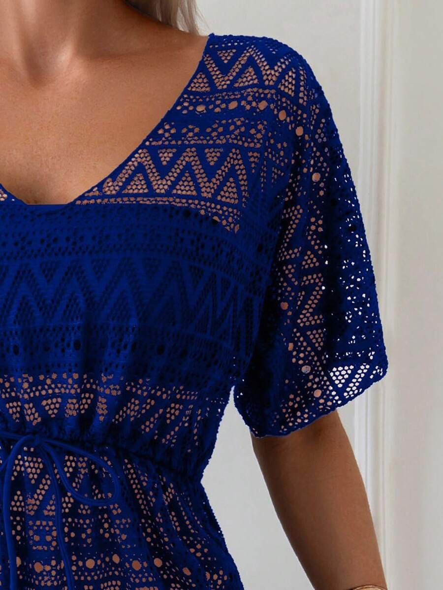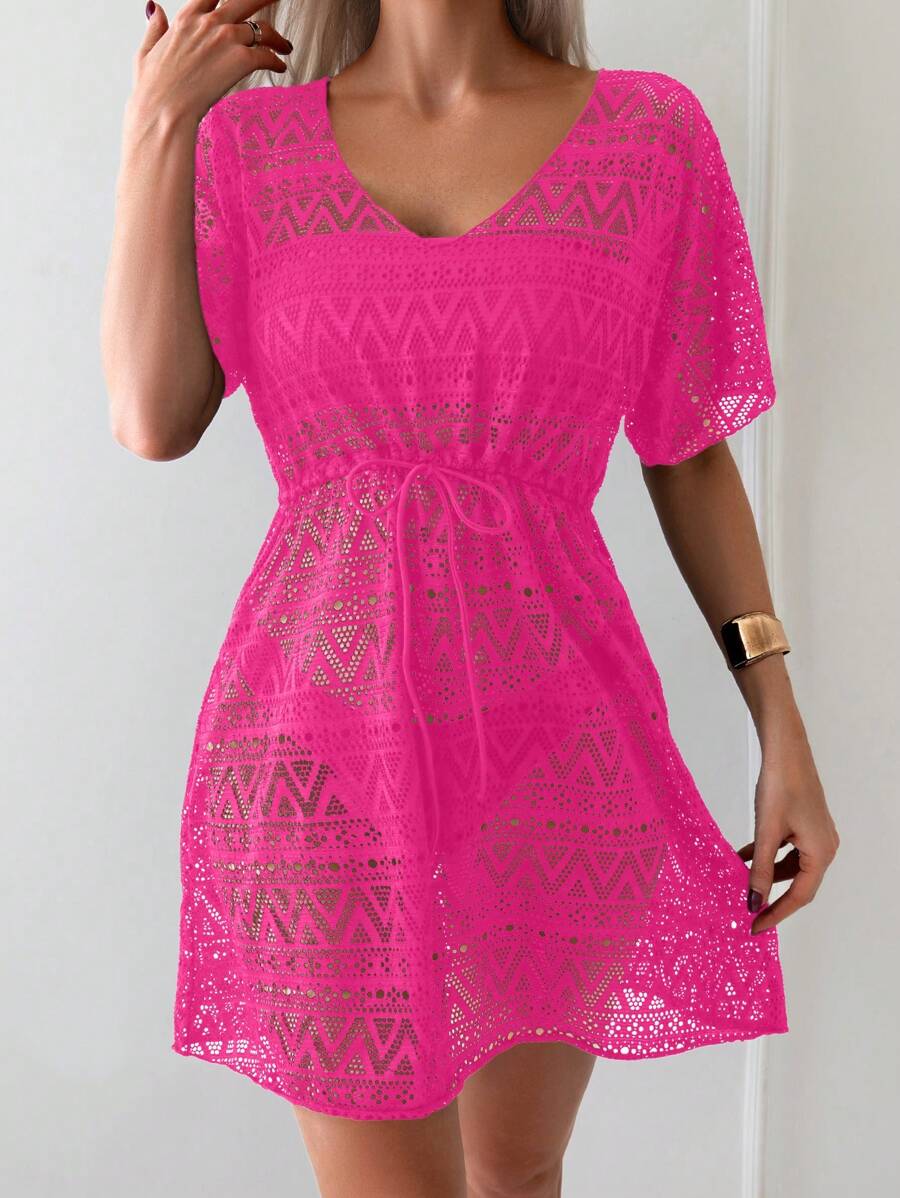 Vestido de playa para mujer con escote en v, manga corta, cintura calada y lazo